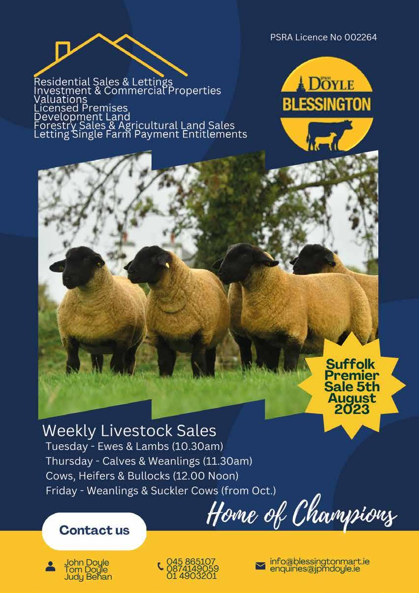 In 2023 the Club will again hold a sale in Carnew Mart on Wednesday 6th September and it is hoped to also organise an in lamb ewe sale in October. The Club’s goal is to promote the Suffolk Breed in the province and this will be achieved by encouraging and supporting new and existing breeders in their efforts. I hope to organise an information/ open day on a breeder’s farm during the summer which will also add a social element to the Club.