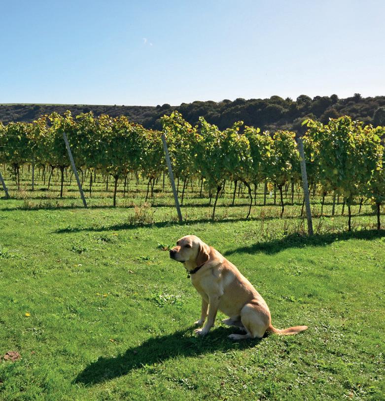 DOG NAME: Bonnie Bonnie is so keen at welcoming people to the vineyard she was appointed to an official role! Here she is leading a tour... her coat says 'Albourne Estate Customer Relations Manager'.