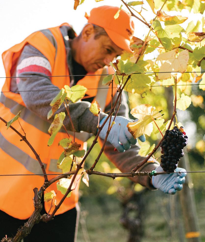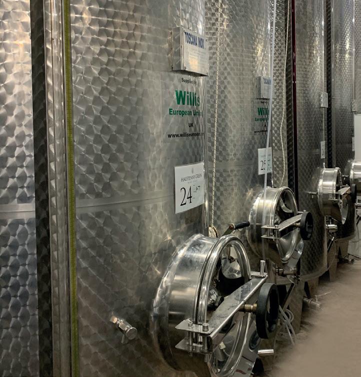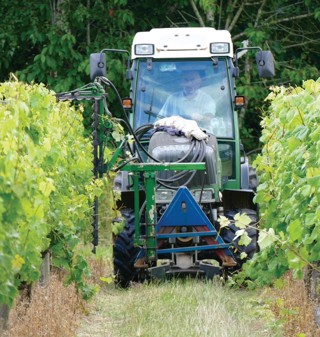 woodchip mulch with inter-row cover of a grasses and clover. Roses add colour at the end of occasional rows and provide early warning of any mildew attack. Plant health is closely monitored, trace elements and balancing fertiliser treatments applied as necessary in a long-term sustainable programme. Ongoing canopy management with rigorous leaf stripping and green harvesting limits yields to maybe six healthy bunches per vine, maximising potential quality.