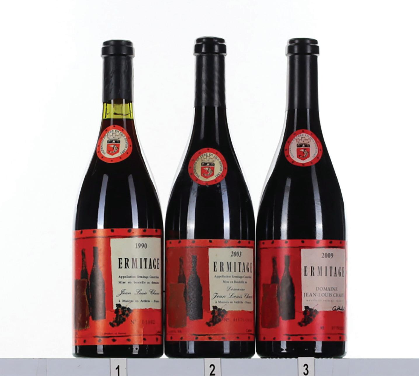 Three bottles of Rhone, Domaine Jean-Louis Chave, Ermitage ‘Cuvee Cathelin’ 1990, 2003, 2009, also had a new bespoke wooden case from Lanarkshire, and a guide of £27,000-29,000.