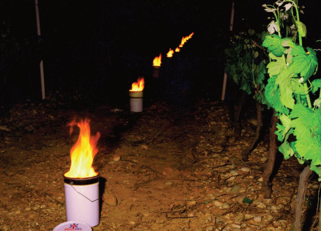 Heated wires, frost candles, mechanical heaters, hydrophobic particle film and sprinklers are all examples of active anti-frost measures. Each offers their own benefits and drawbacks, depending on the topography of the vineyard and its susceptibility to frost as well as the access to labour available to deploy these measures in a timely fashion when a frost event takes place.