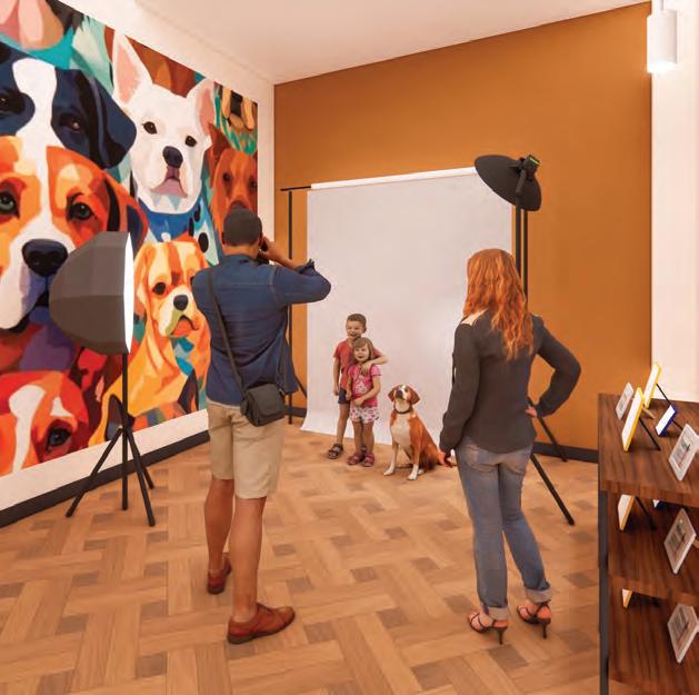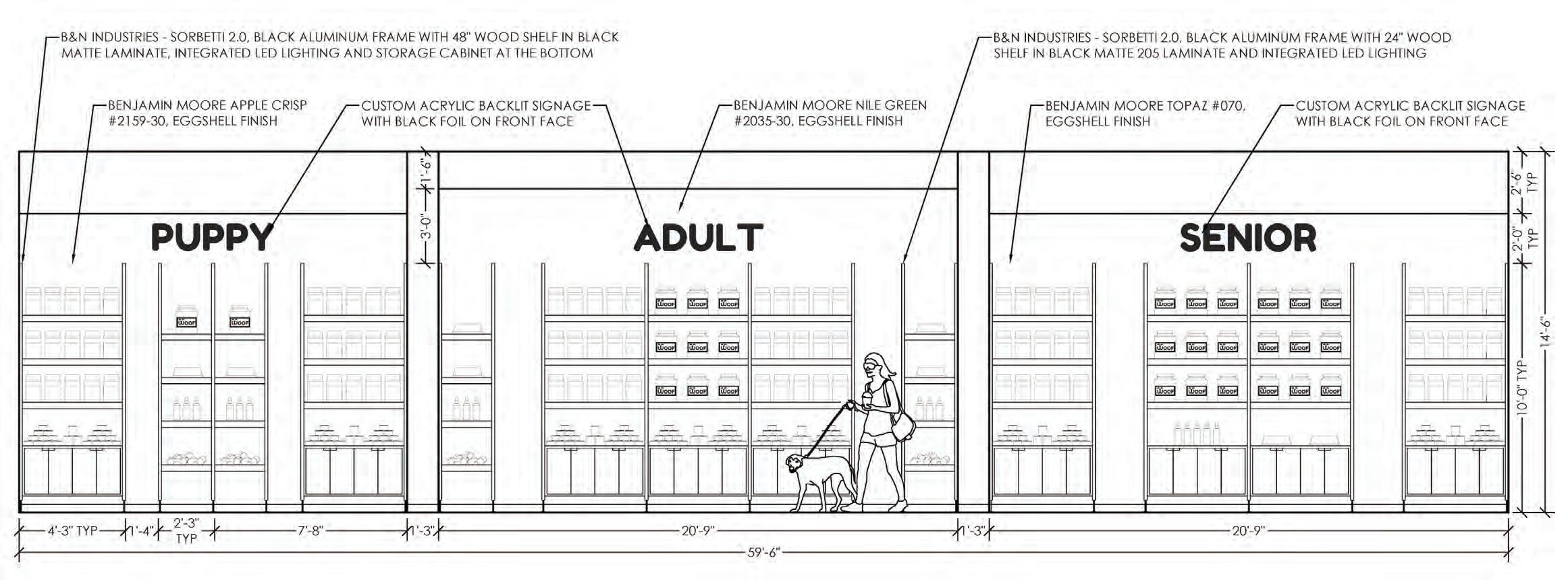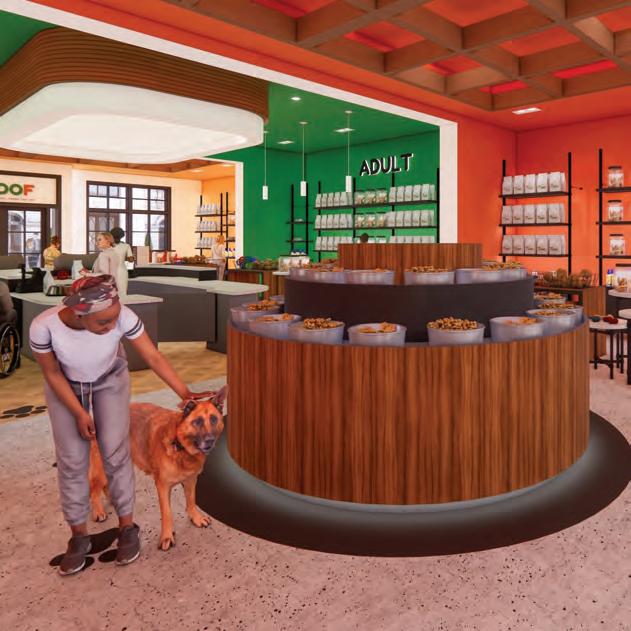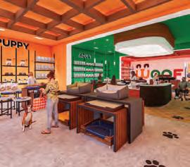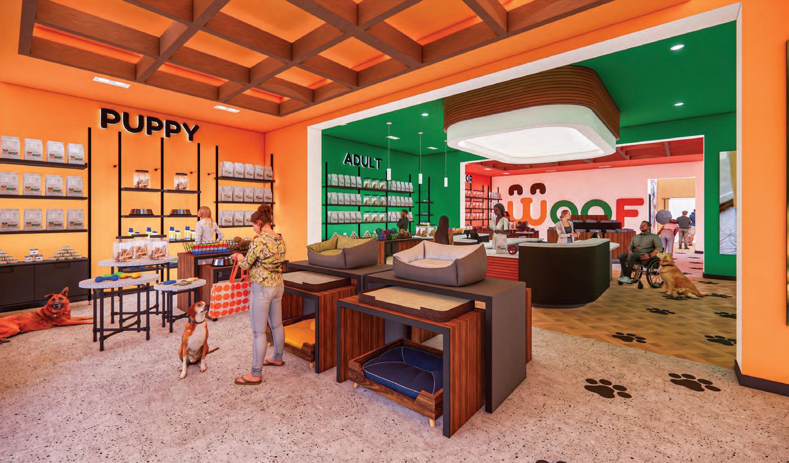 Arktura’s SoftSpan 48 ceiling system in Soft Sound Wood Texture – Oak is recessed into the ceiling to support acoustical control in a high-energy pet retail environment. The trellis-inspired structure adds visual interest and helps define circulation paths while reducing noise in active zones.
