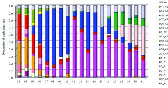 ● Displacement there was displacement of previously dominant genotypes (13_A2 and 6_A1) via continued expansion of the 36_A2 genotype that now comprises 40% of the sampled population