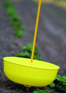 Yellow water traps are used to monitor aphids in potato seed crops.