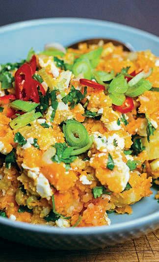 A comforting mash with sweetness from the sweet potatoes, salty feta and the bite of spring onions. Serve on its own or alongside grilled vegetables