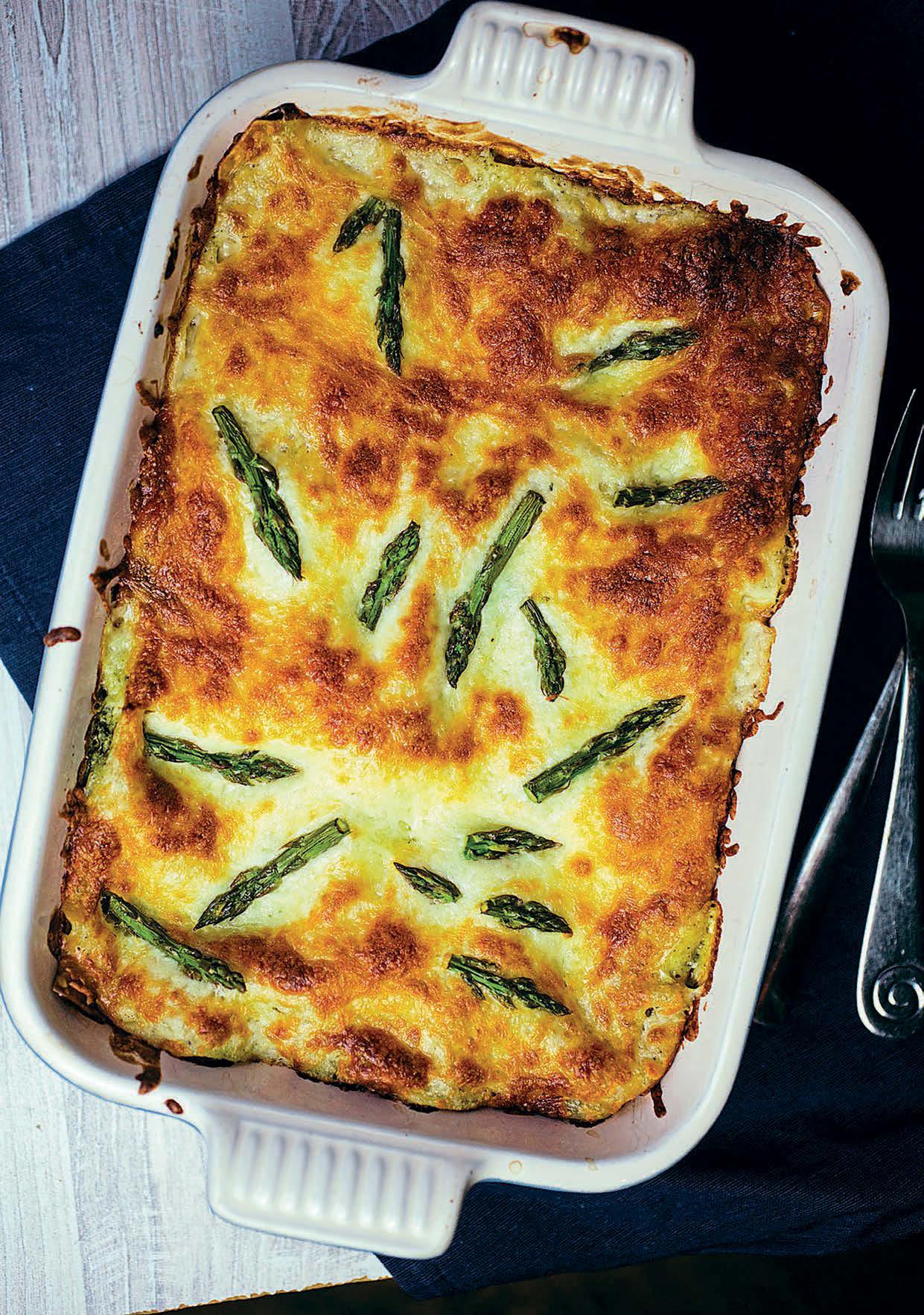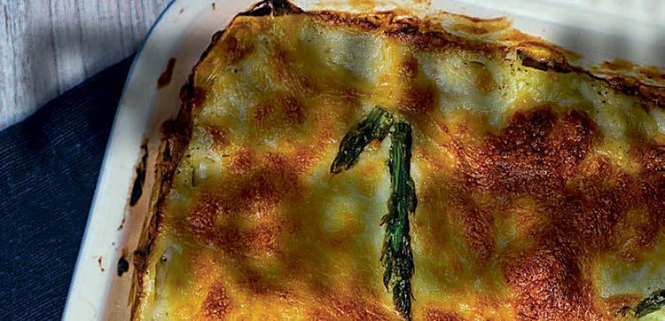 7. Finish with a layer of pasta, the remaining white sauce, mozzarella, asparagus tips and Parmesan.