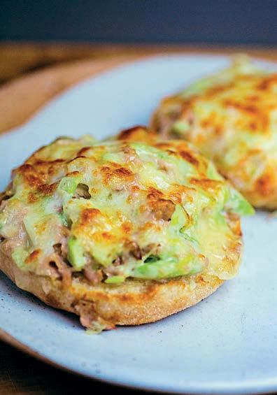 A quick, comforting lunch. Creamy tuna with crunchy celery and spring onion is piled onto toasted English muffins and baked until the cheese bubbles