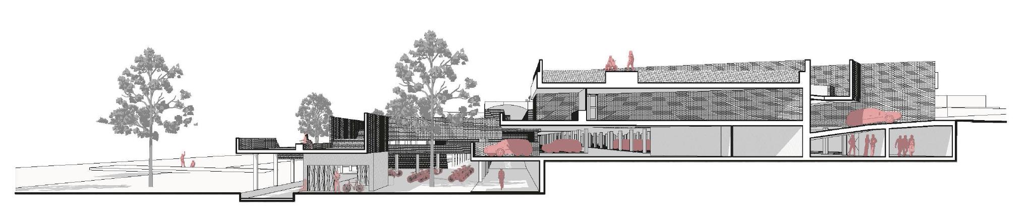 From above the building has the aesthetics of a monumentual beam, this beam serves as a first threshold, a threshold between the street and the open space. When you look from the street there are two openings, these are precisely placed to awake the interest for the area behind the building. In this project we will name these two openings the north side connection and the south side connection.