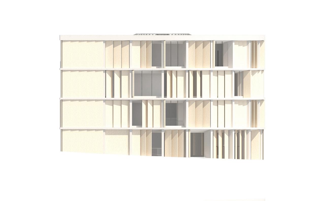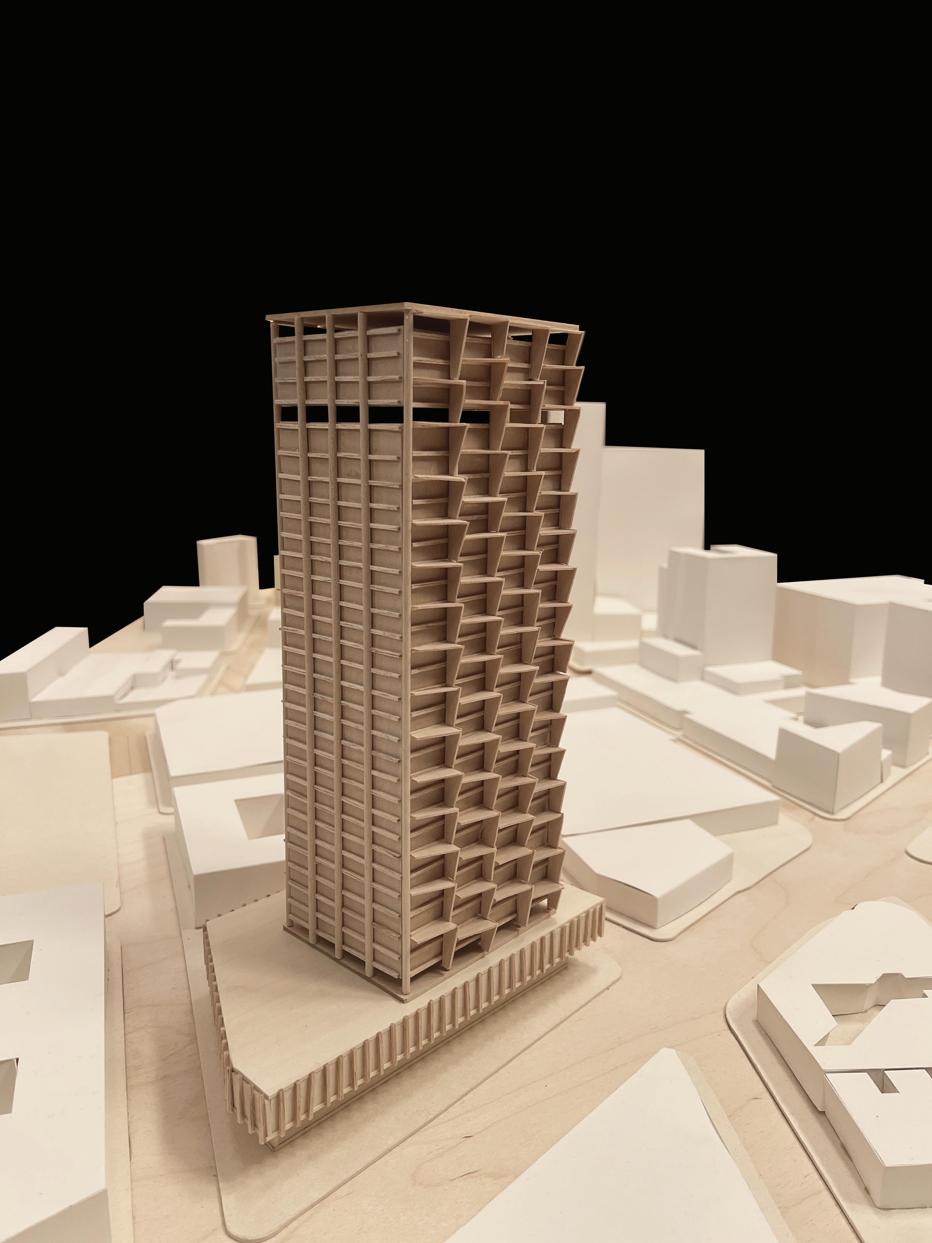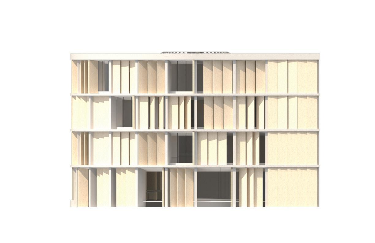 Employing mass timber, as the main structural material, a brick facade will be utilized to seamlessly blend with the surrounding neighborhood. A component-based building (kit-of-parts) method will offer faster construction speeds through prefabrication and labor and material cost savings. Both building materials and construction method will yield operational benefits such as a reduction in operation carbon emissions up to 45% of the code.