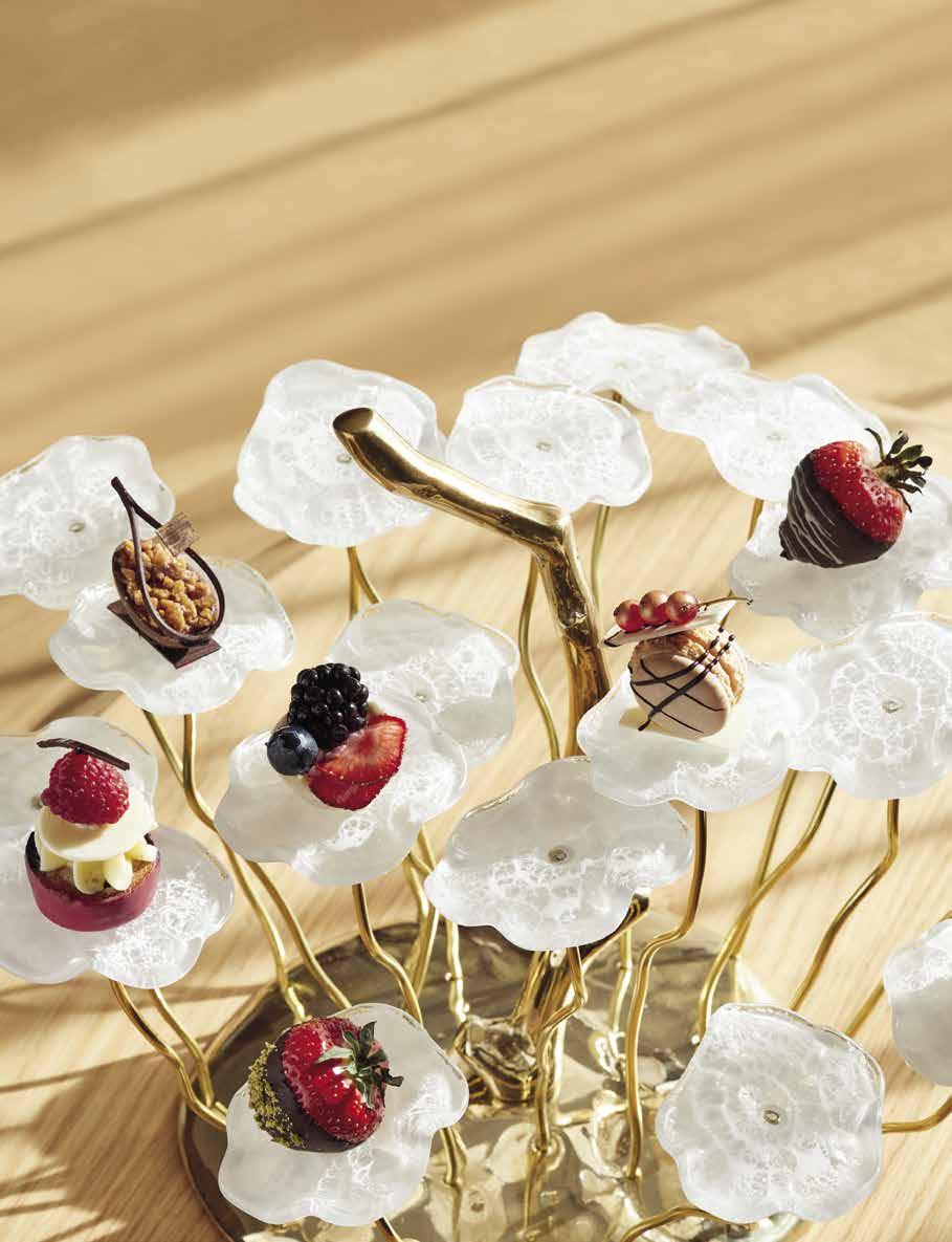 Cover image: Adorned with treats including chocolate-dipped strawberries, fruit tartlets and a salted caramel macaron, this delicate golden stand is an example of the amenities that welcome guests to Kempinski Palace Engelberg in the Swiss Alps.