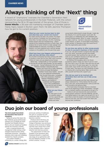 Duo join our board of young professionals Two more people have joined the Generation Next board of champions. Taking the group that steers the East Midlands young professionals’ network up to 13 people are Anthi Karyofylli and Shadelle DicksonMorris, who are students at headline partner the University of Derby. Anthi is studying business and management while running a small Instagram-based business selling handmade accessories – alongside a voluntary role as sales and marketing assistant for a friend’s company. Law student Shadelle is embarking on a career change after 38