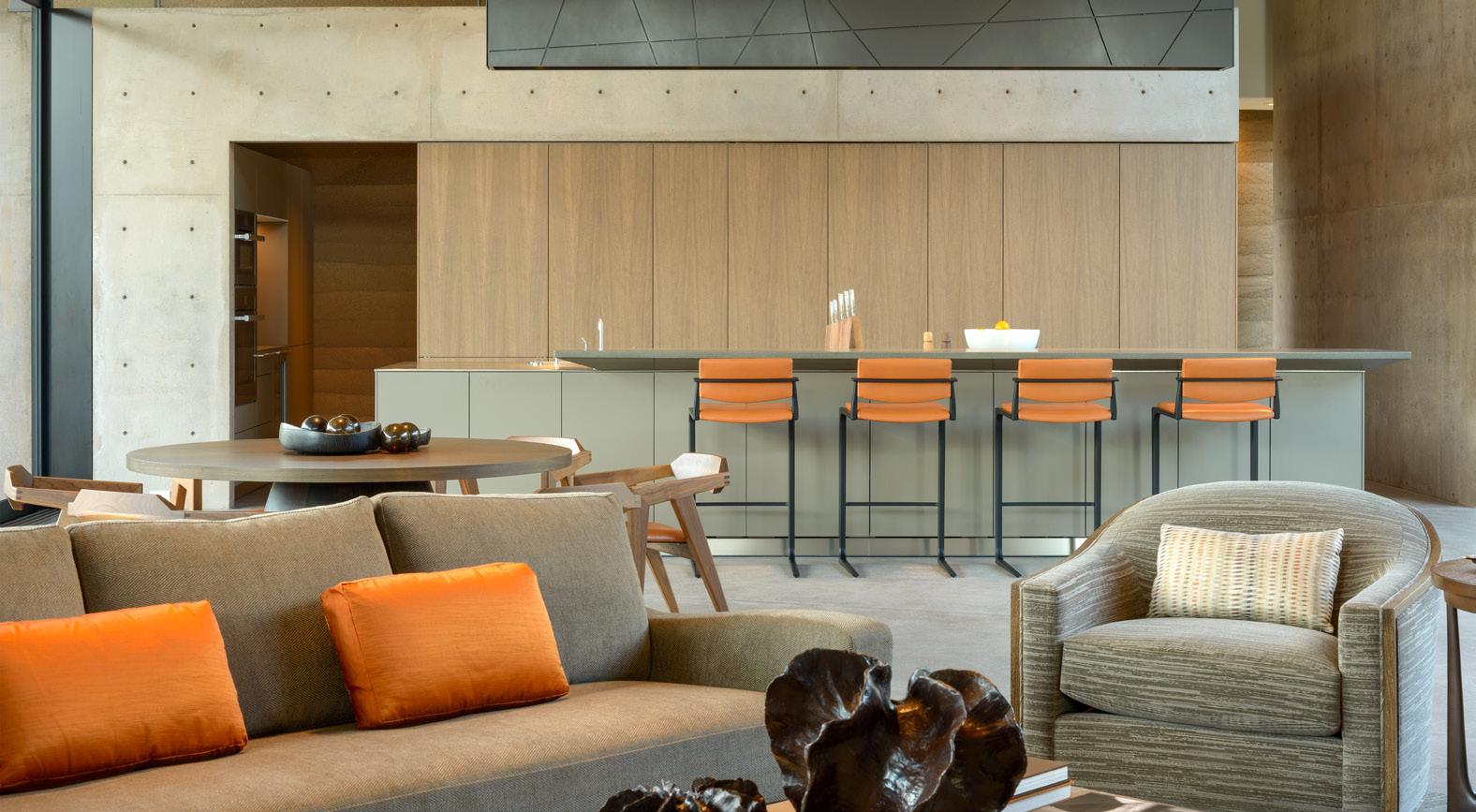 The exterior environment is always present from the interior of the home, with its endless valley views and humble material palette of rammed earth walls, limestone floors, douglass fir ceilings, expansive glass, and sitematched masonry walls. These materials are woven inside and outside in a sophisticated play that interlocks the interior and exterior living spaces.