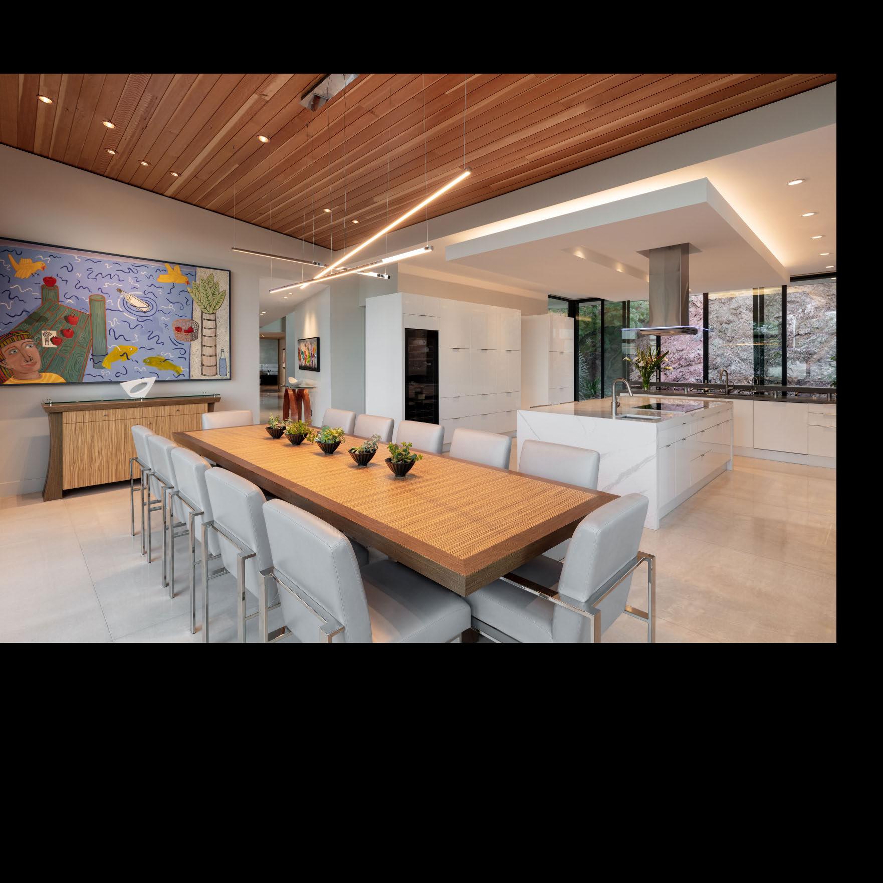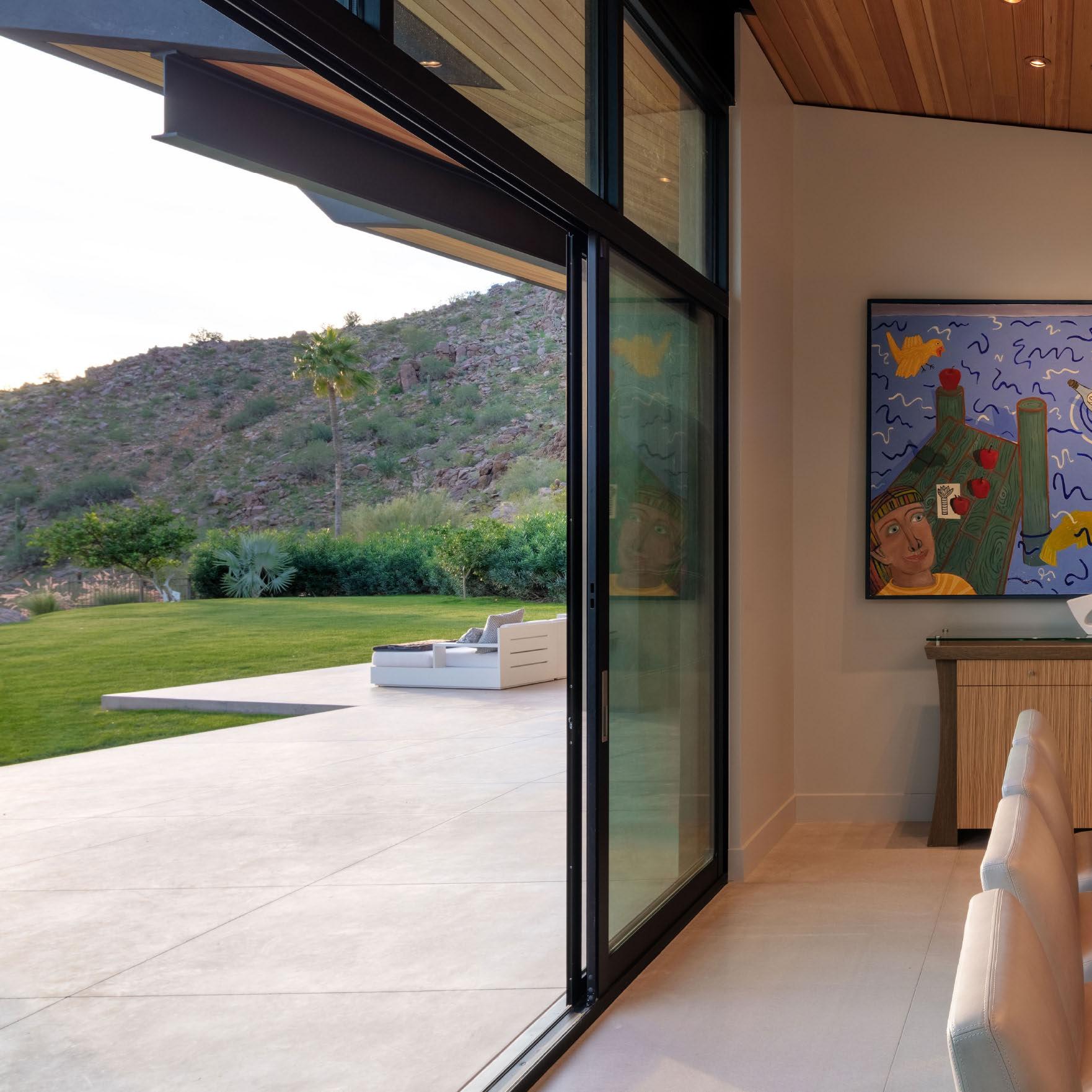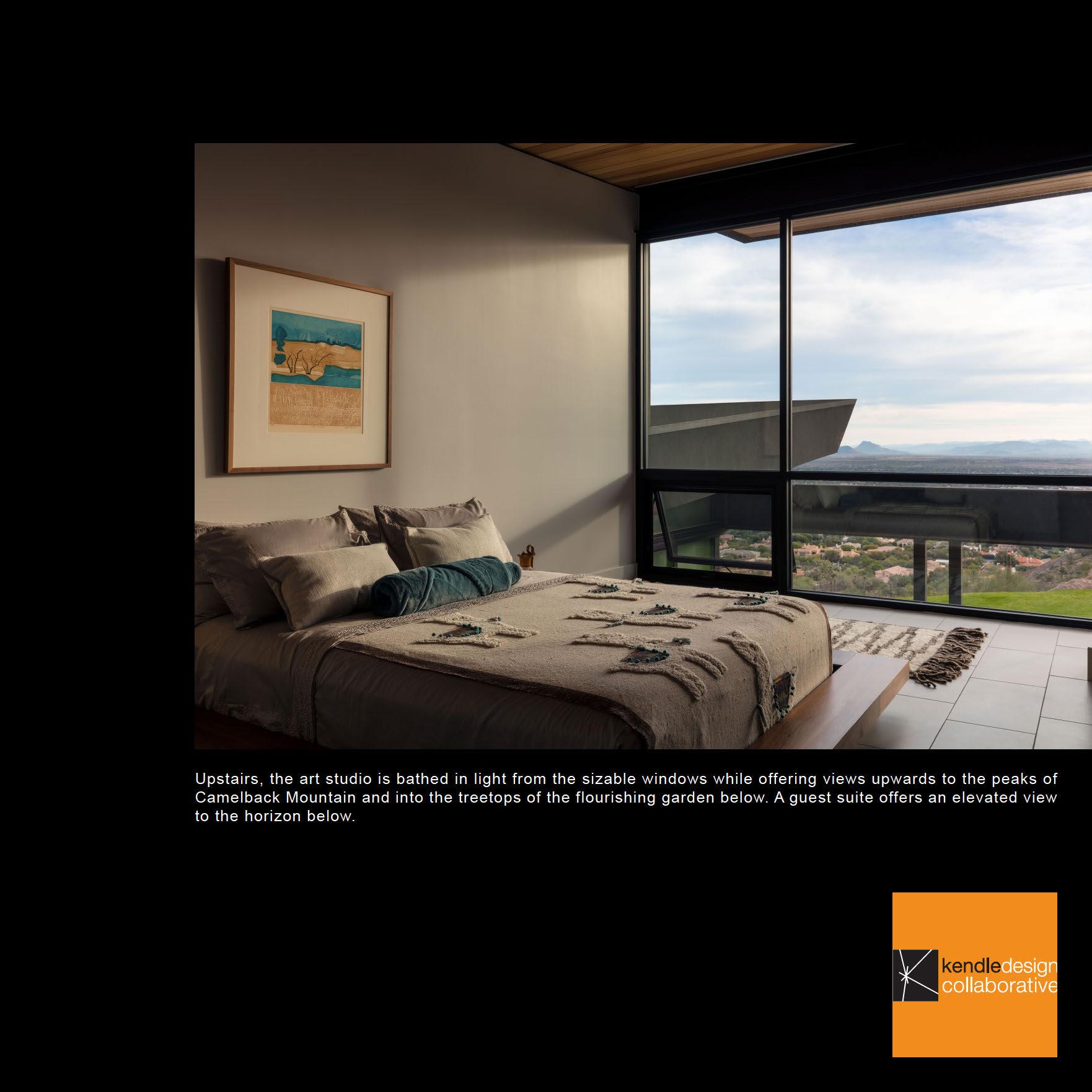 The combined kitchen and dining room offers distinct relationships to nature with the ability to behold a steep face of rock to the west or overlook the sweeping city below to the east. Additionally, sliding glass openings choreograph the flow of air and light, allowing the home to become an extension of nature. Upstairs, the art studio is bathed in light from the sizable windows while offering views upwards to the peaks of Camelback Mountain and into the treeto