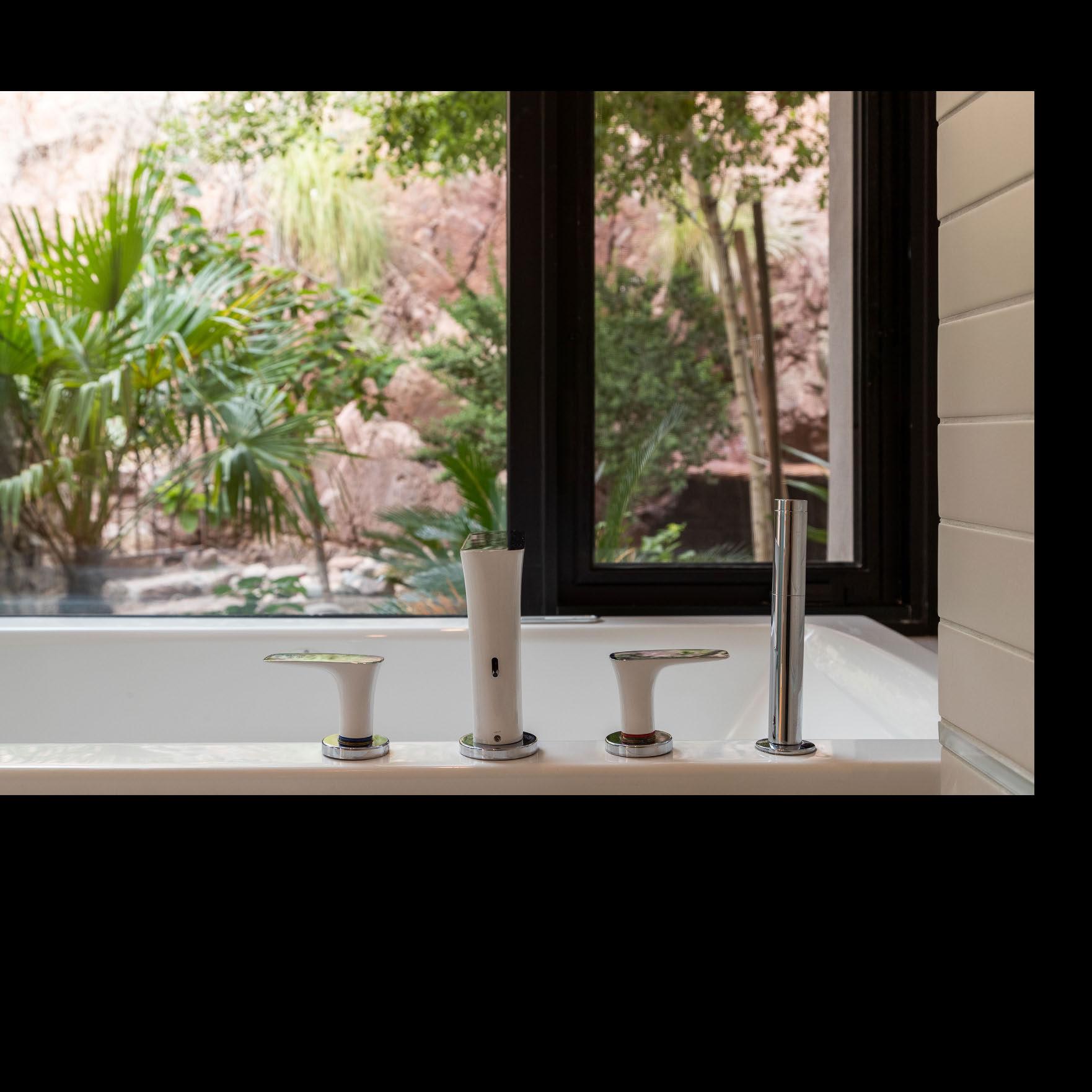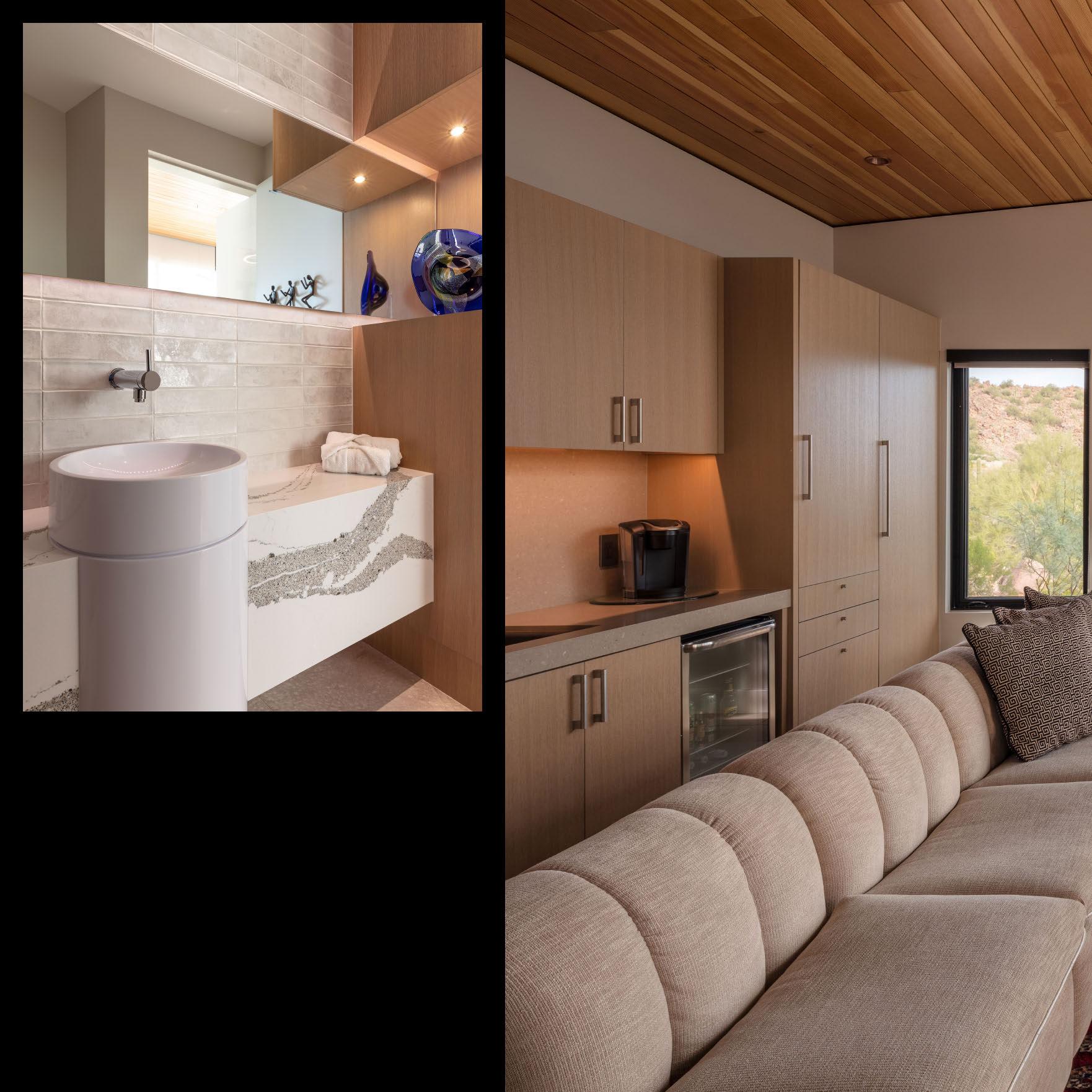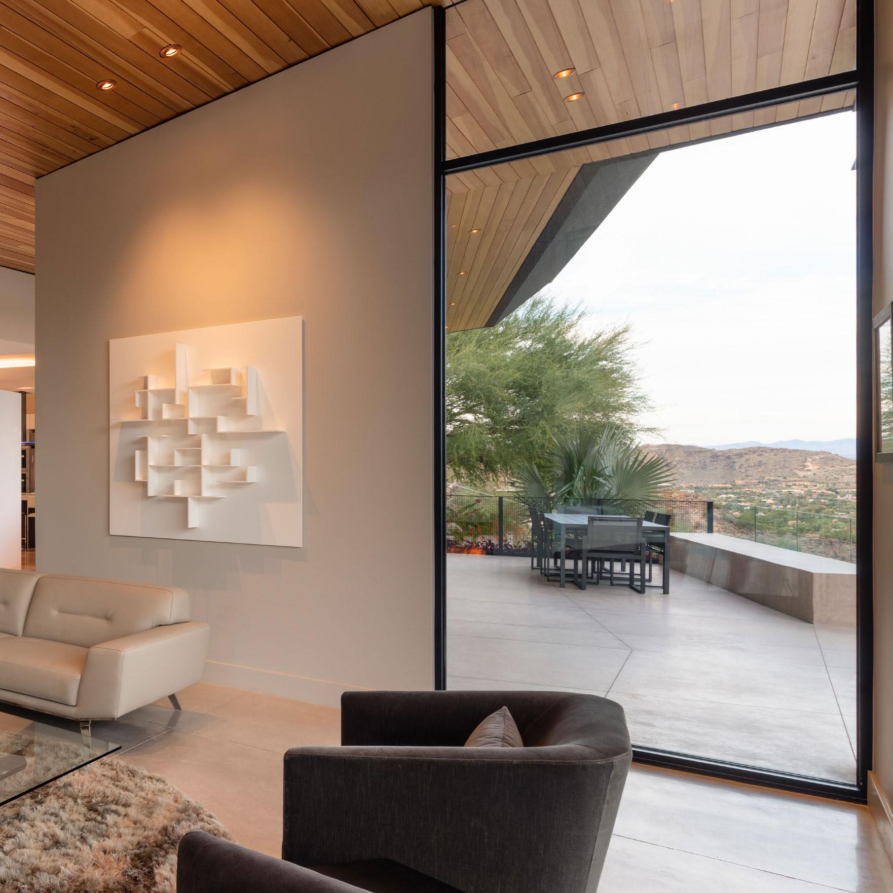 A canopy of angled ceiling planes radiate out towards the expansive city and mountain views while defining the various volumes of the home. These richly pigmented roofs also condition the exterior and interior living spaces from the sun while contrasting against the sandy tones of the exterior which blend naturally with the backdrop of Camelback Mountain. Dynamic volumes of space define the separate zones of the great room and expand seamlessly into the front yard and lush garden backyard—heightening the feeling of living intentionally within nature.