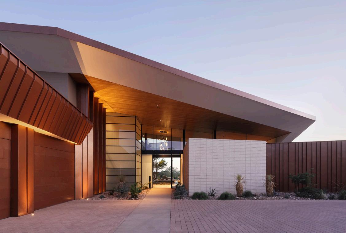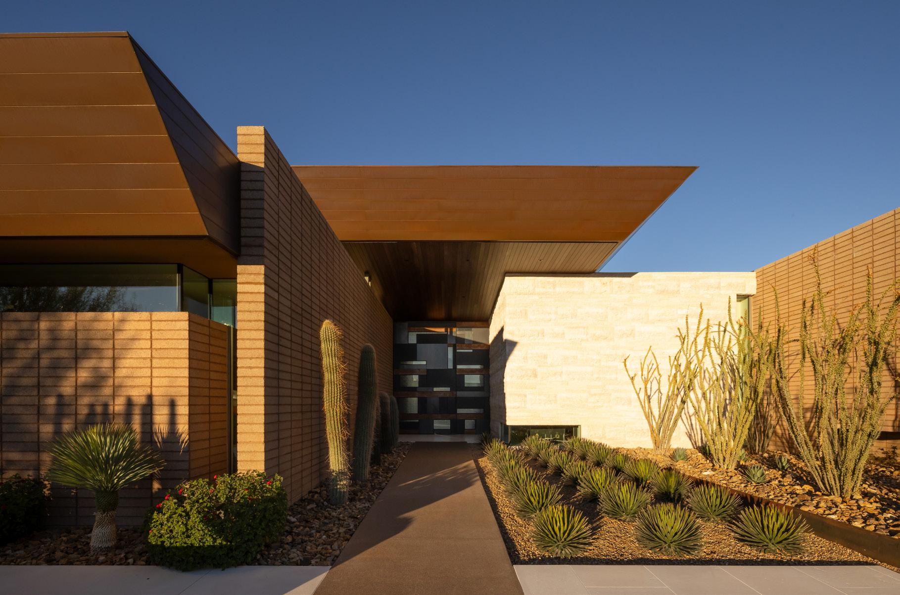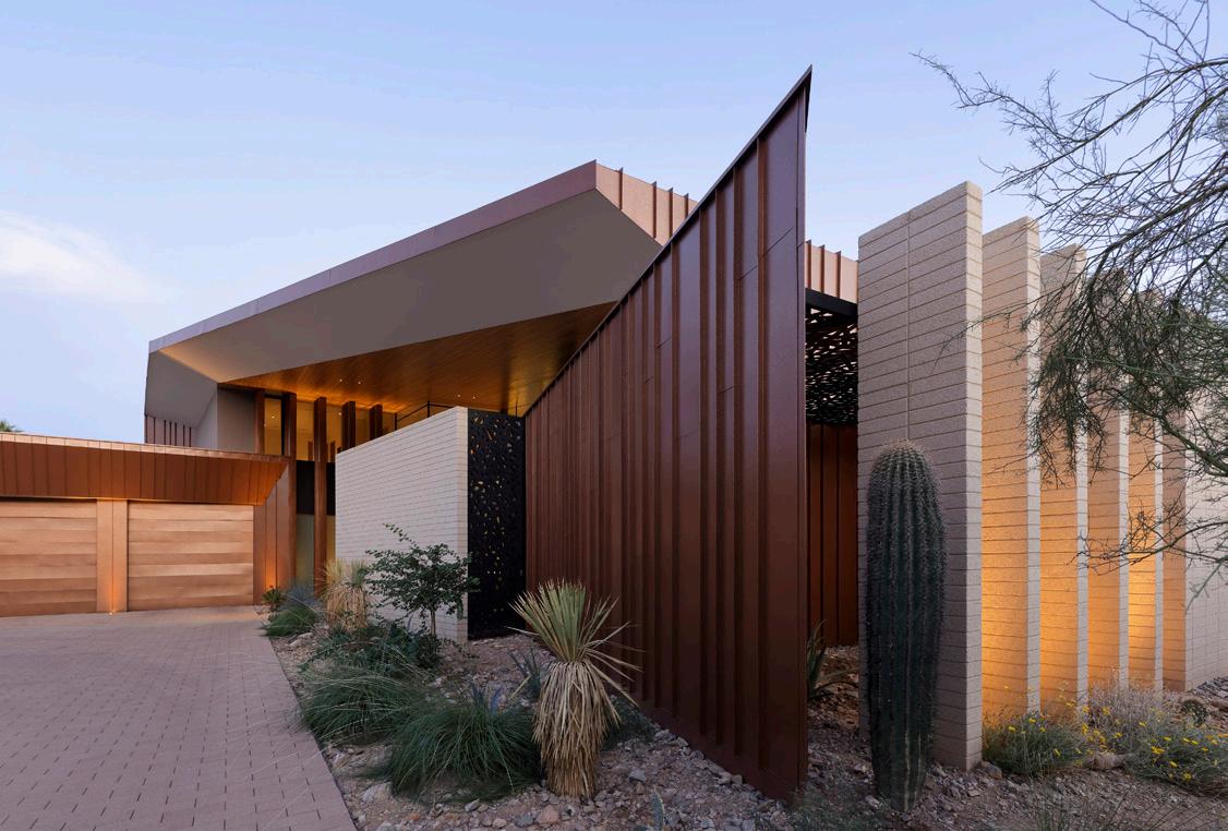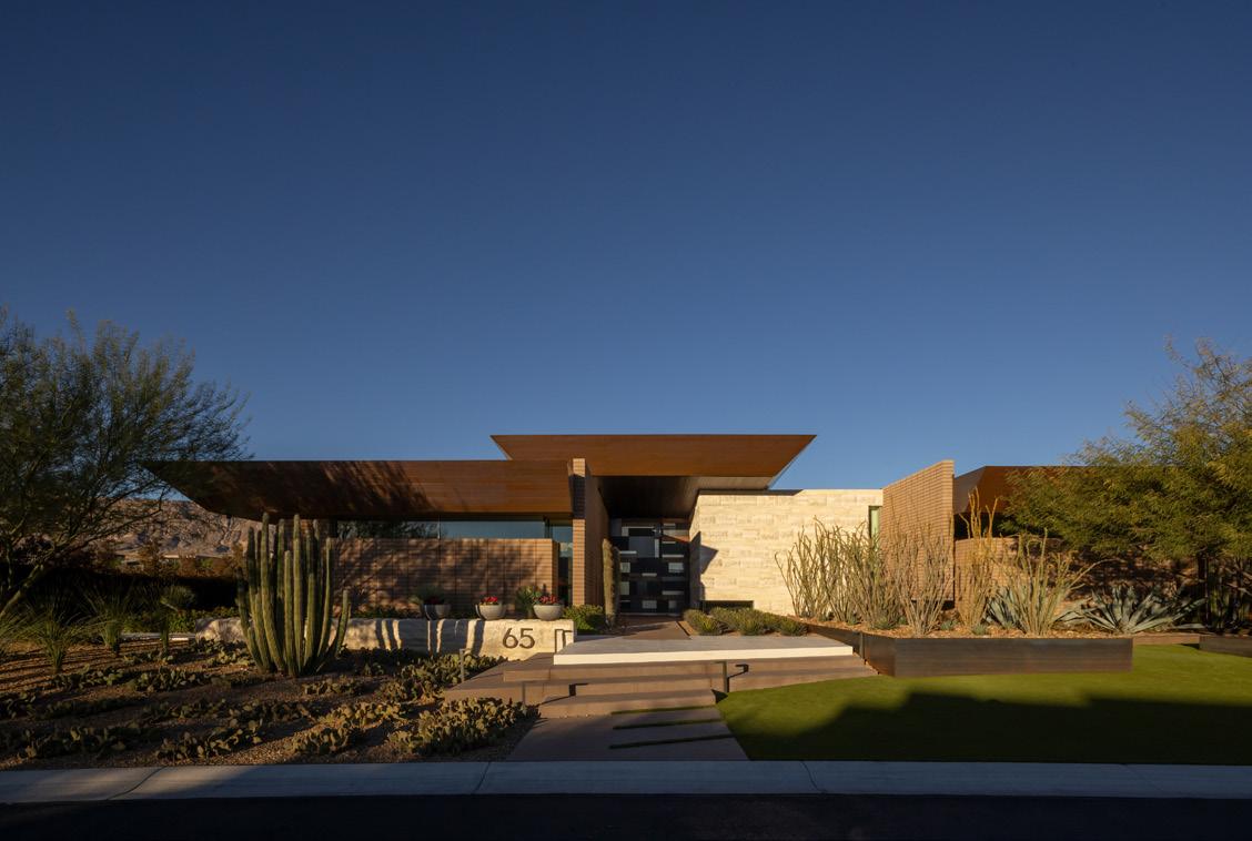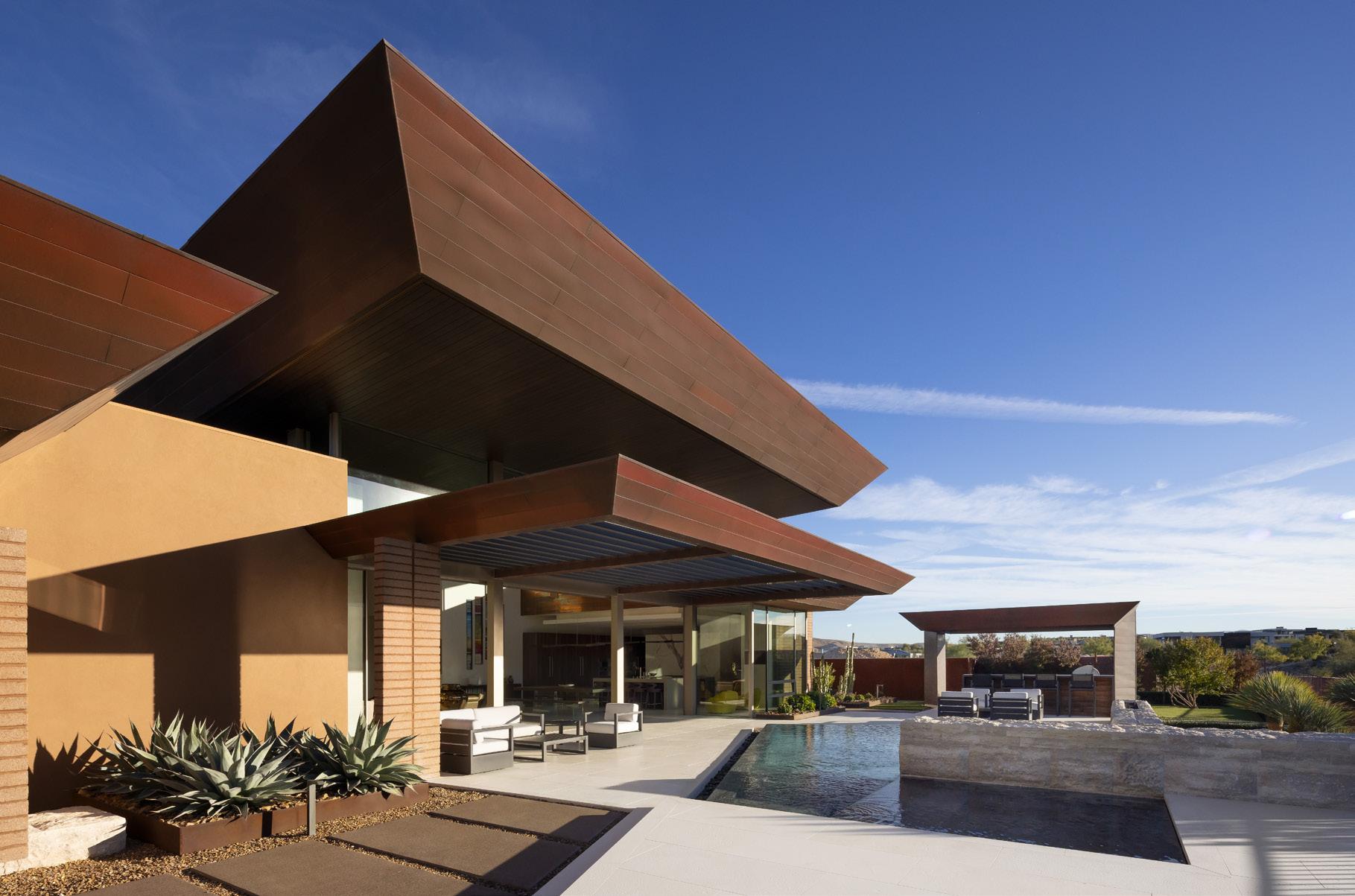 Nestled amongst a rich palette of native vegetation, the Desert Fairways Residence slowly reveals itself as it emerges from its lush surroundings. Its design captures the eye, with low masses defining private zones that contrast with a dynamically folded metal plane that shelters the social zone. Changing hues of textured metal cast rhythmic shadows, recalling the ribs of a cactus, while masonry forms shield the interior from western sun.