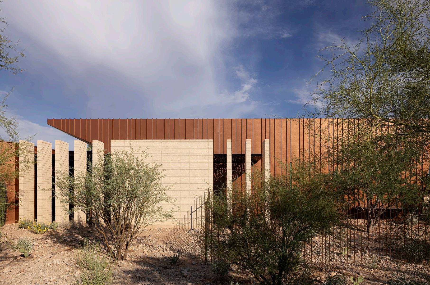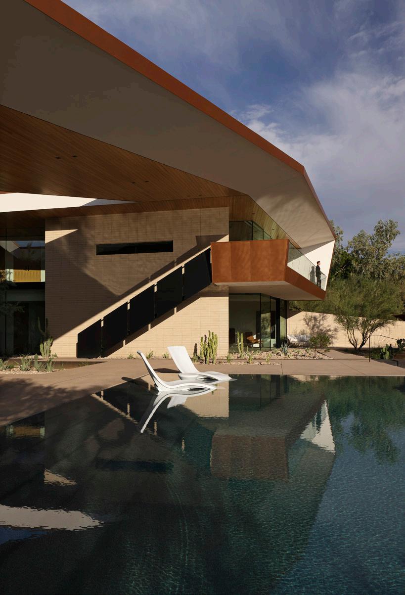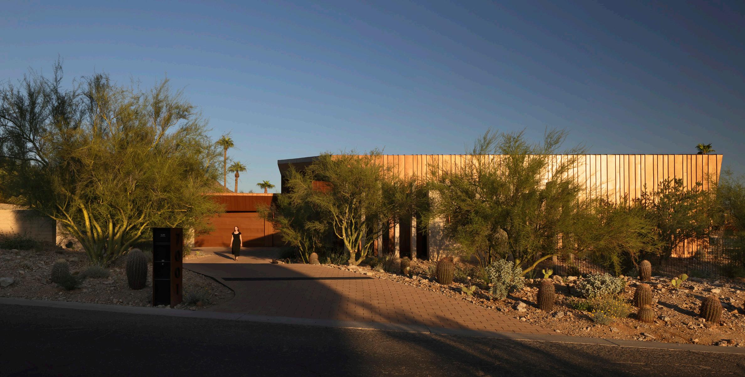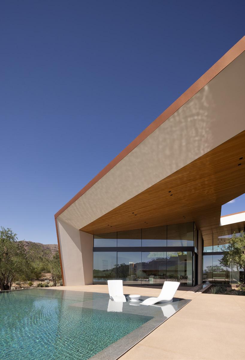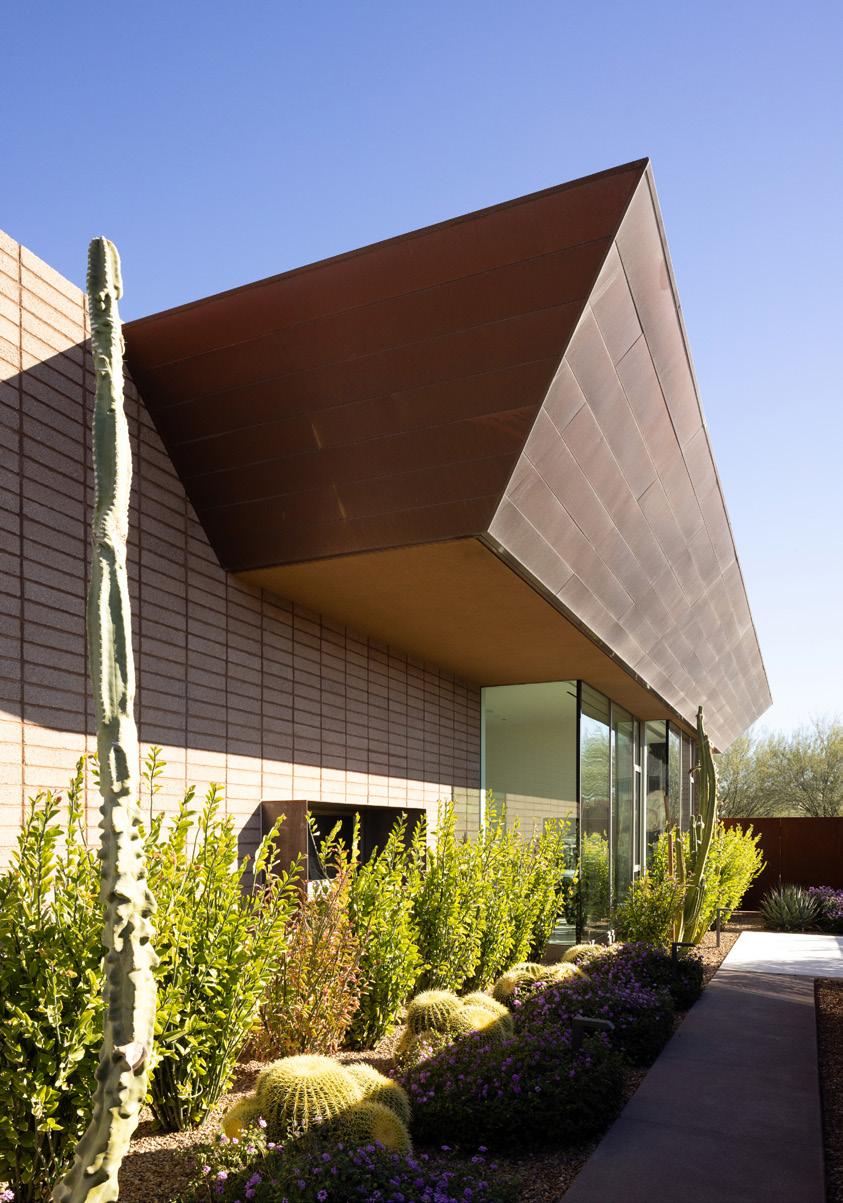 Nestled amongst a rich palette of native vegetation, the Desert Fairways Residence slowly reveals itself as it emerges from its lush surroundings. Its design captures the eye, with low masses defining private zones that contrast with a dynamically folded metal plane that shelters the social zone. Changing hues of textured metal cast rhythmic shadows, recalling the ribs of a cactus, while masonry forms shield the interior from western sun.