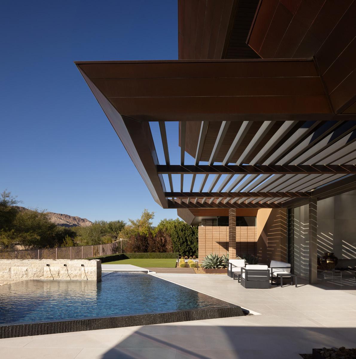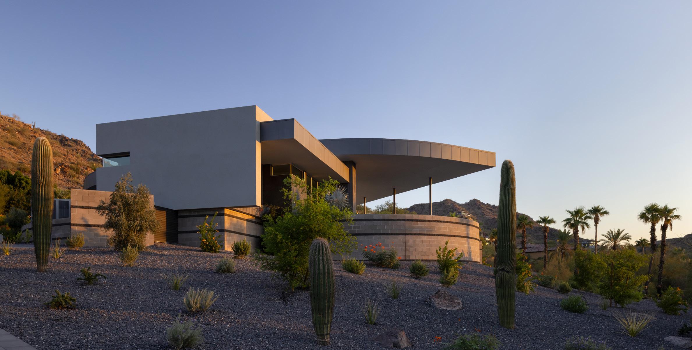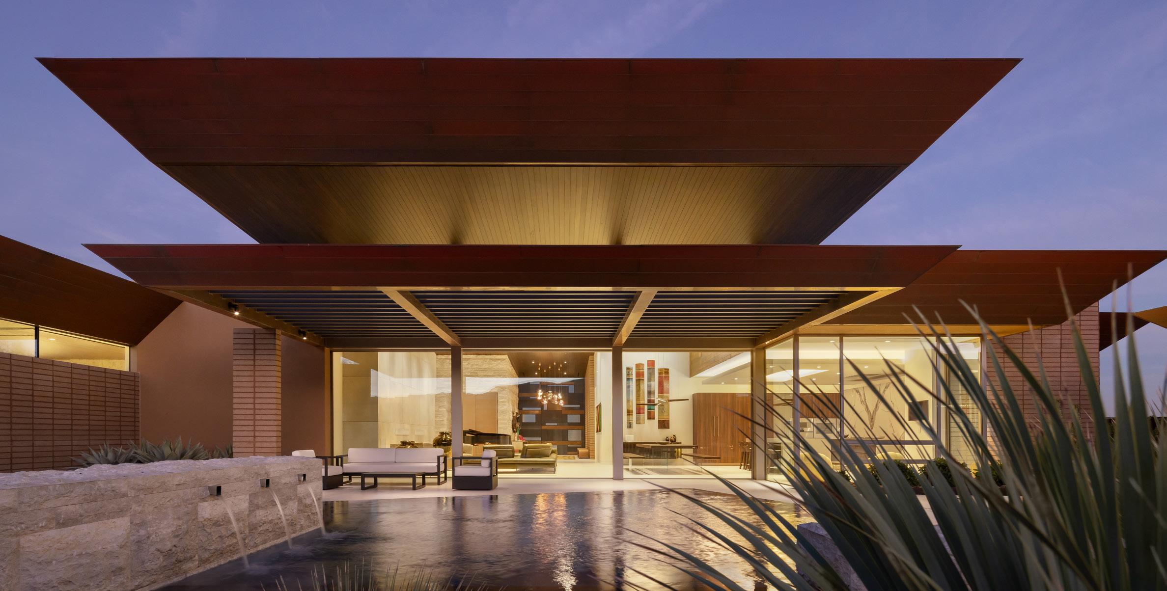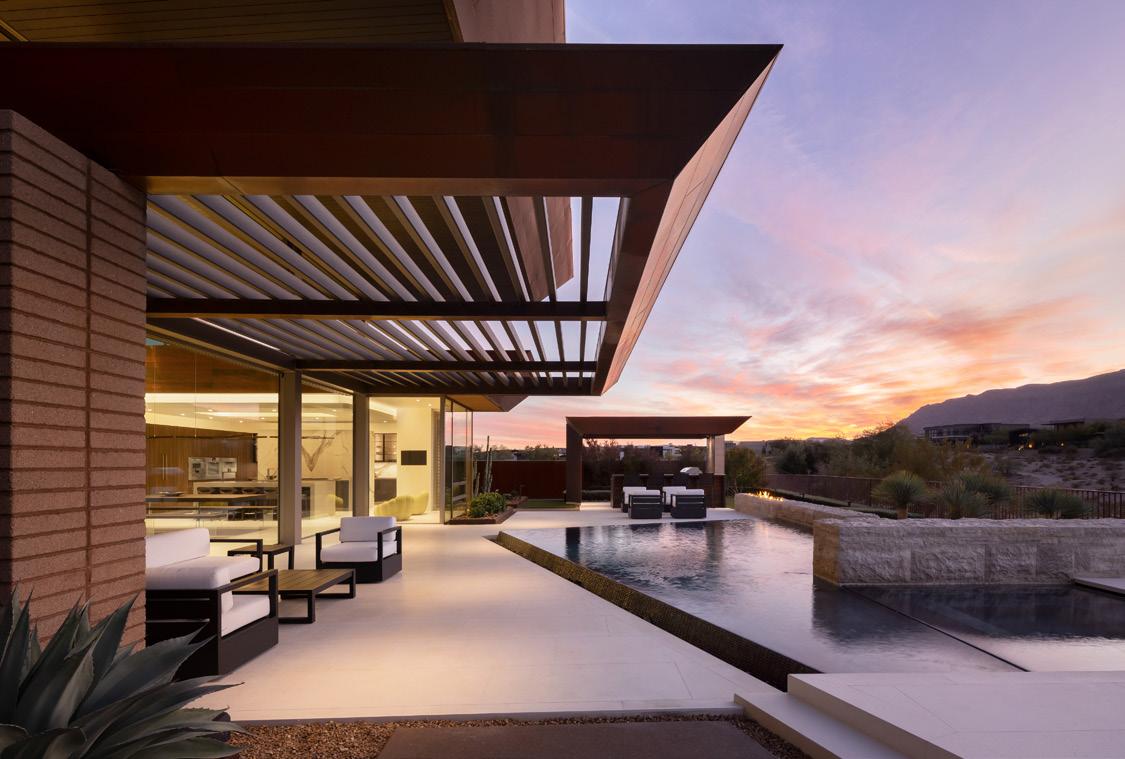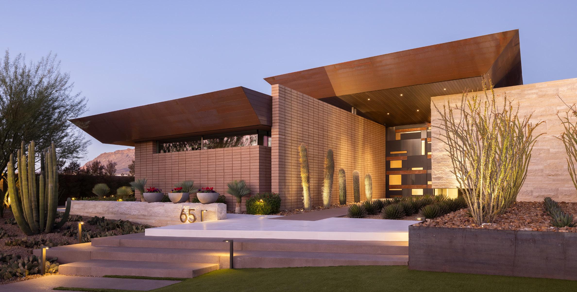 Nestled amongst a rich palette of native vegetation, the Desert Fairways Residence slowly reveals itself as it emerges from its lush surroundings. Its design captures the eye, with low masses defining private zones that contrast with a dynamically folded metal plane that shelters the social zone. Changing hues of textured metal cast rhythmic shadows, recalling the ribs of a cactus, while masonry forms shield the interior from western sun.