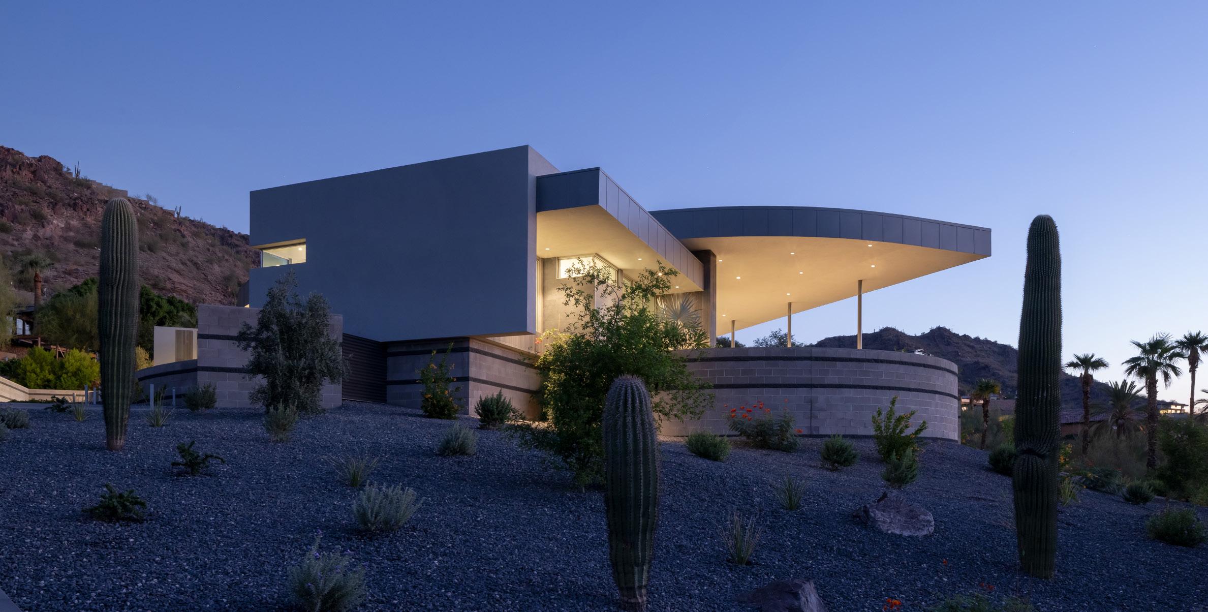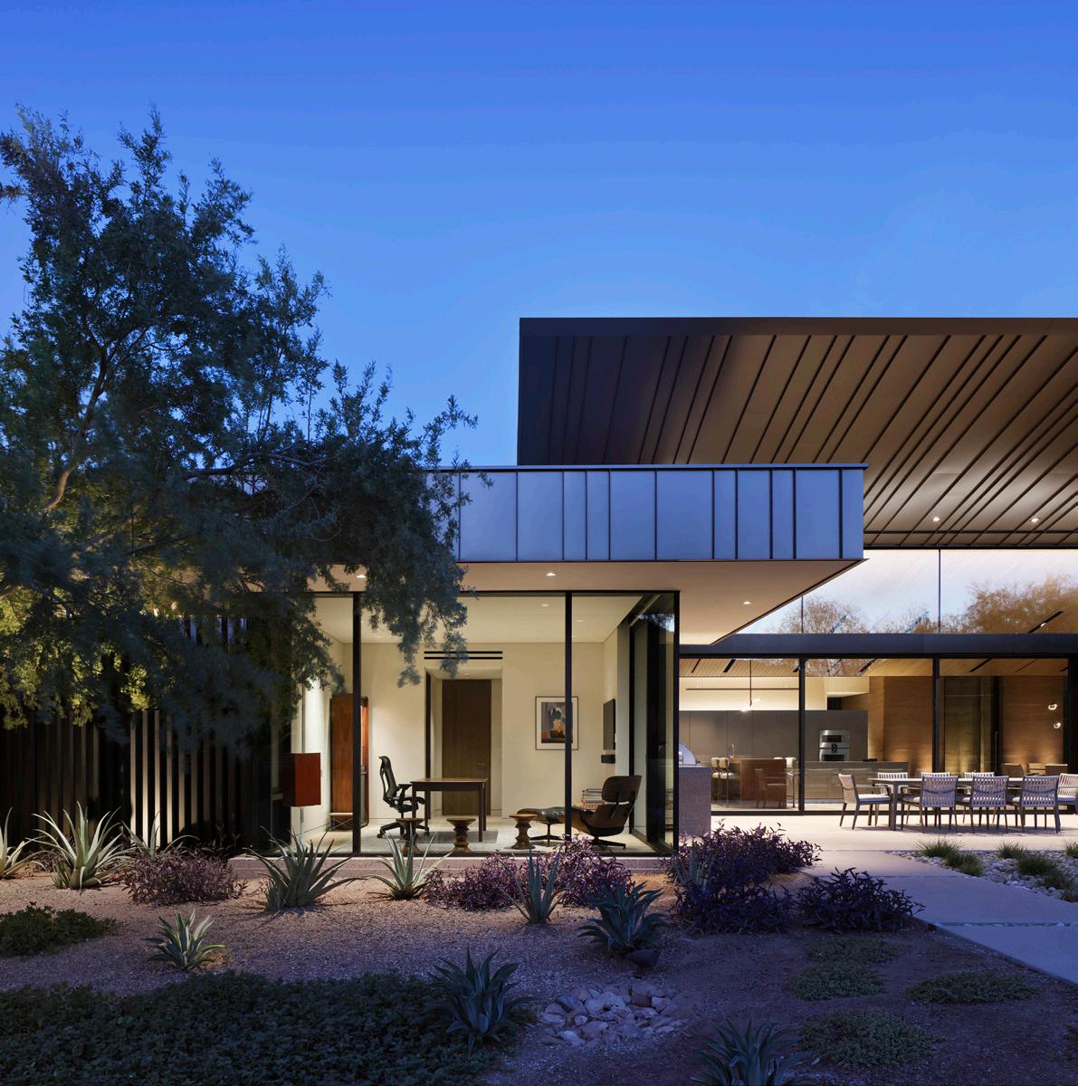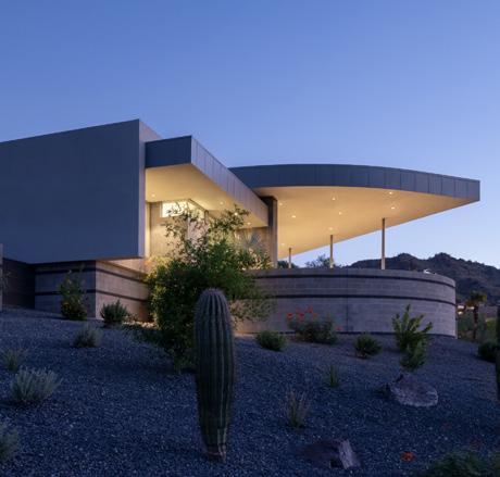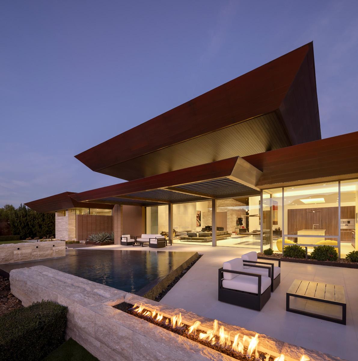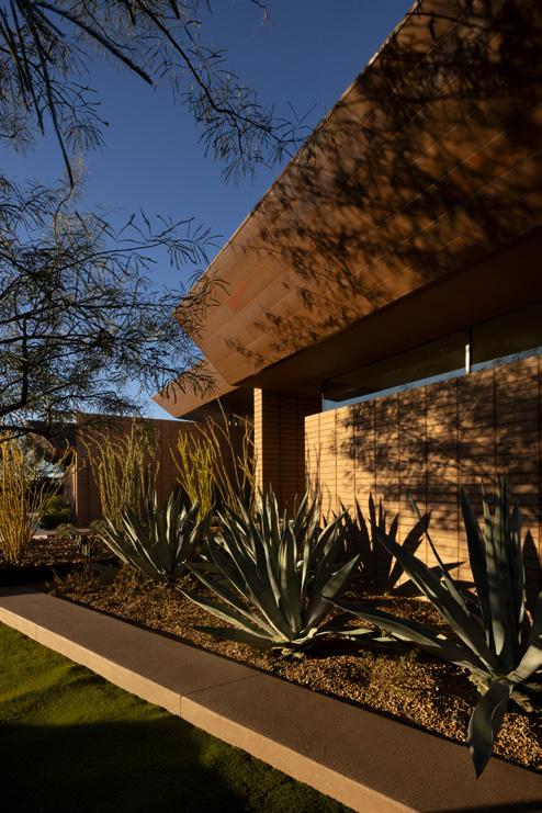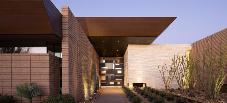 Nestled amongst a rich palette of native vegetation, the Desert Fairways Residence slowly reveals itself as it emerges from its lush surroundings. Its design captures the eye, with low masses defining private zones that contrast with a dynamically folded metal plane that shelters the social zone. Changing hues of textured metal cast rhythmic shadows, recalling the ribs of a cactus, while masonry forms shield the interior from western sun.