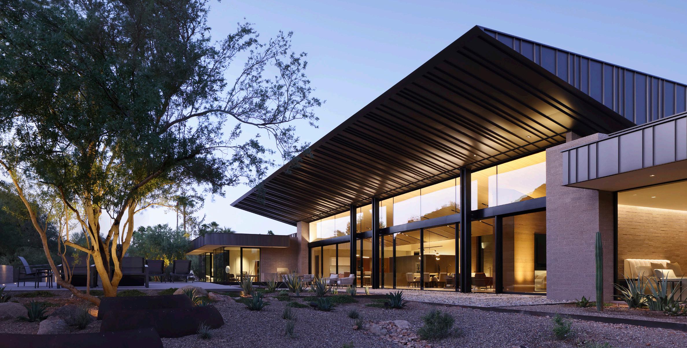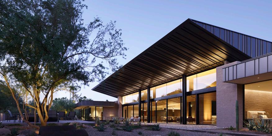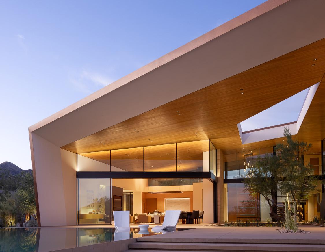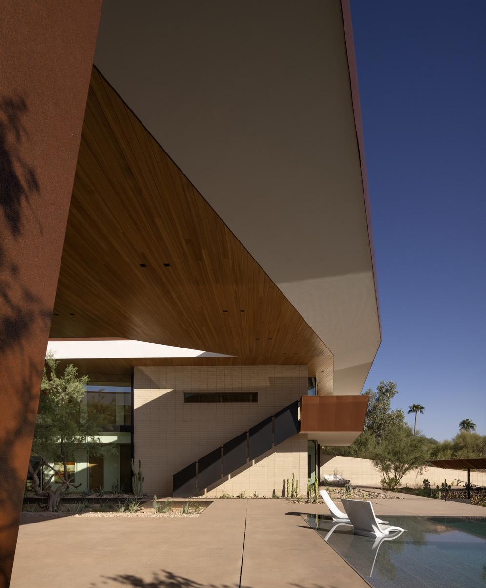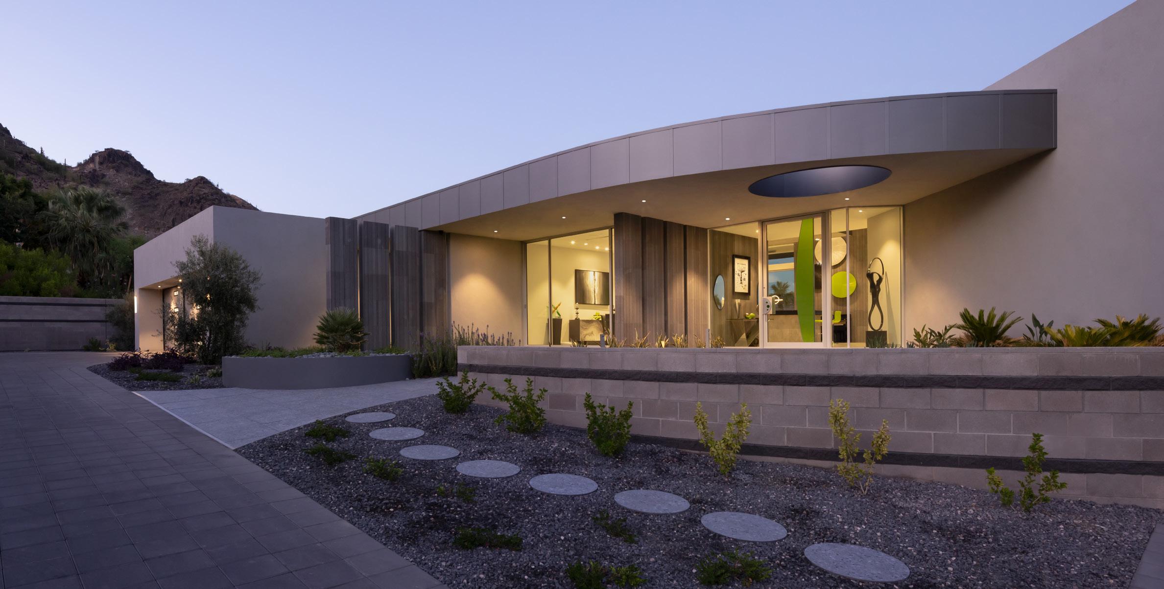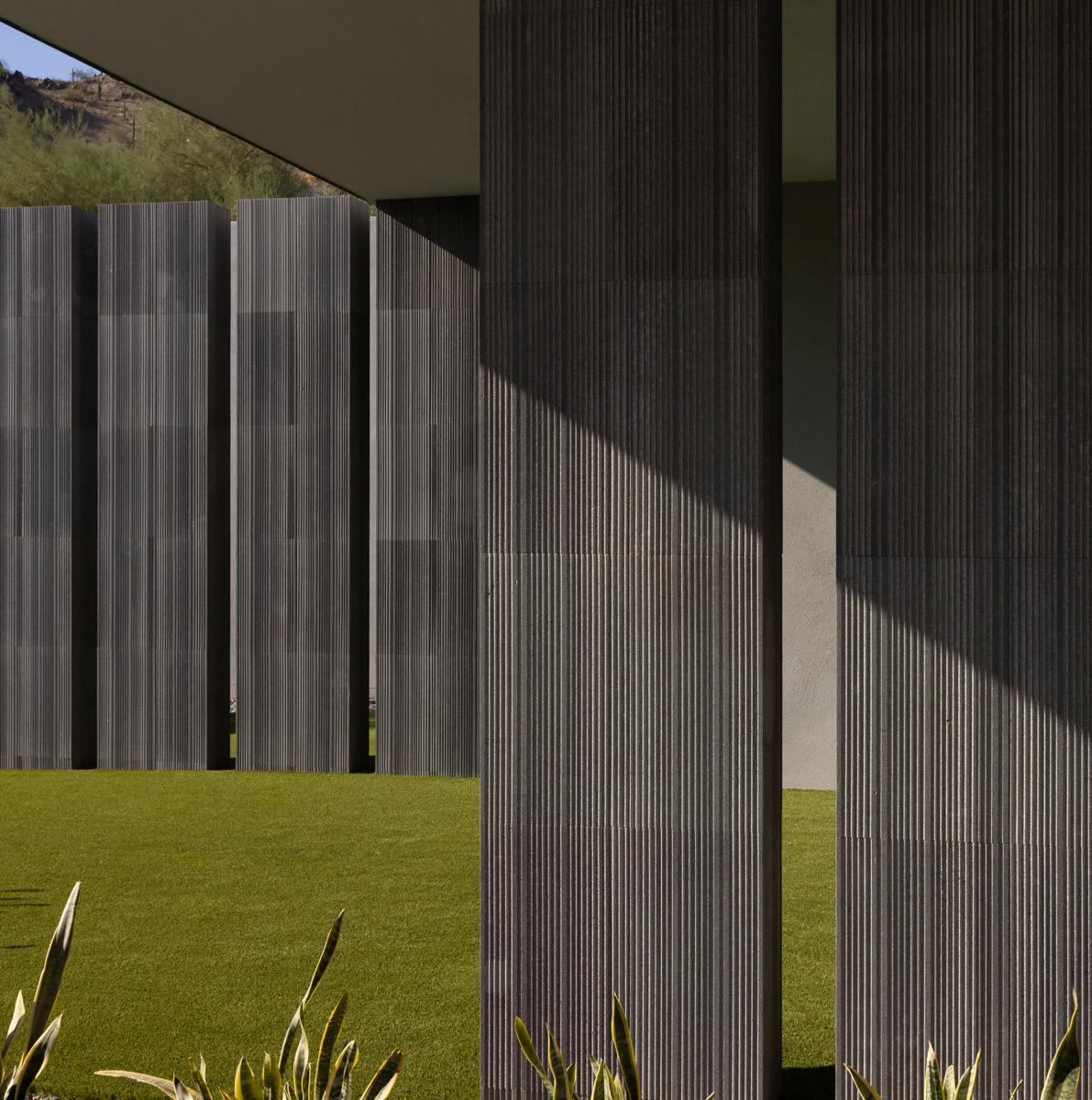 Nestled amongst a rich palette of native vegetation, the Desert Fairways Residence slowly reveals itself as it emerges from its lush surroundings. Its design captures the eye, with low masses defining private zones that contrast with a dynamically folded metal plane that shelters the social zone. Changing hues of textured metal cast rhythmic shadows, recalling the ribs of a cactus, while masonry forms shield the interior from western sun.
