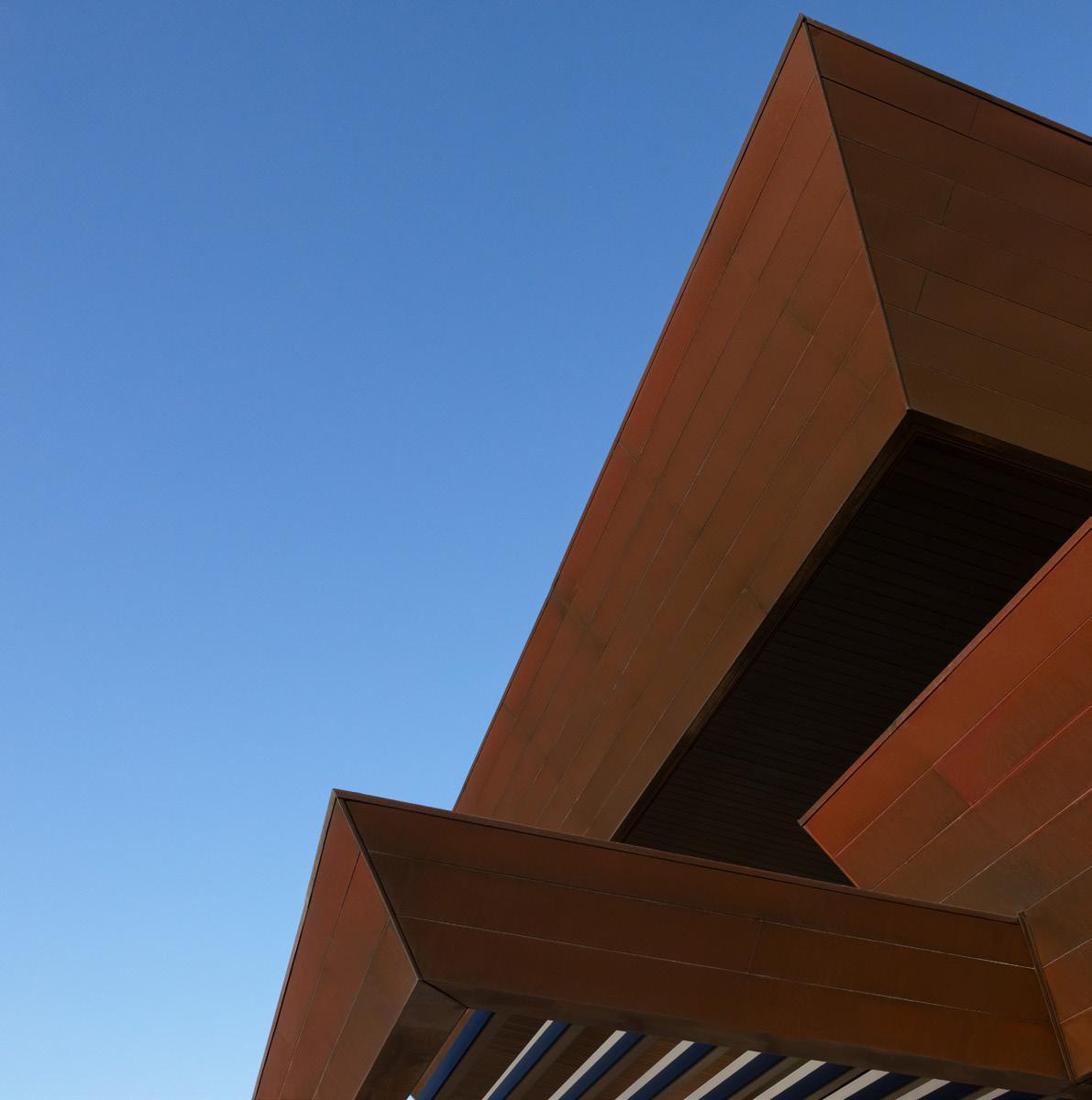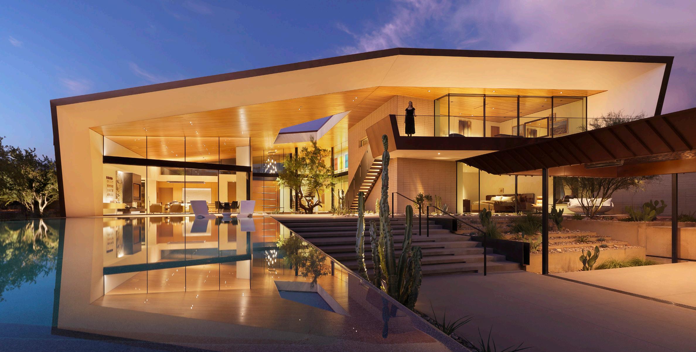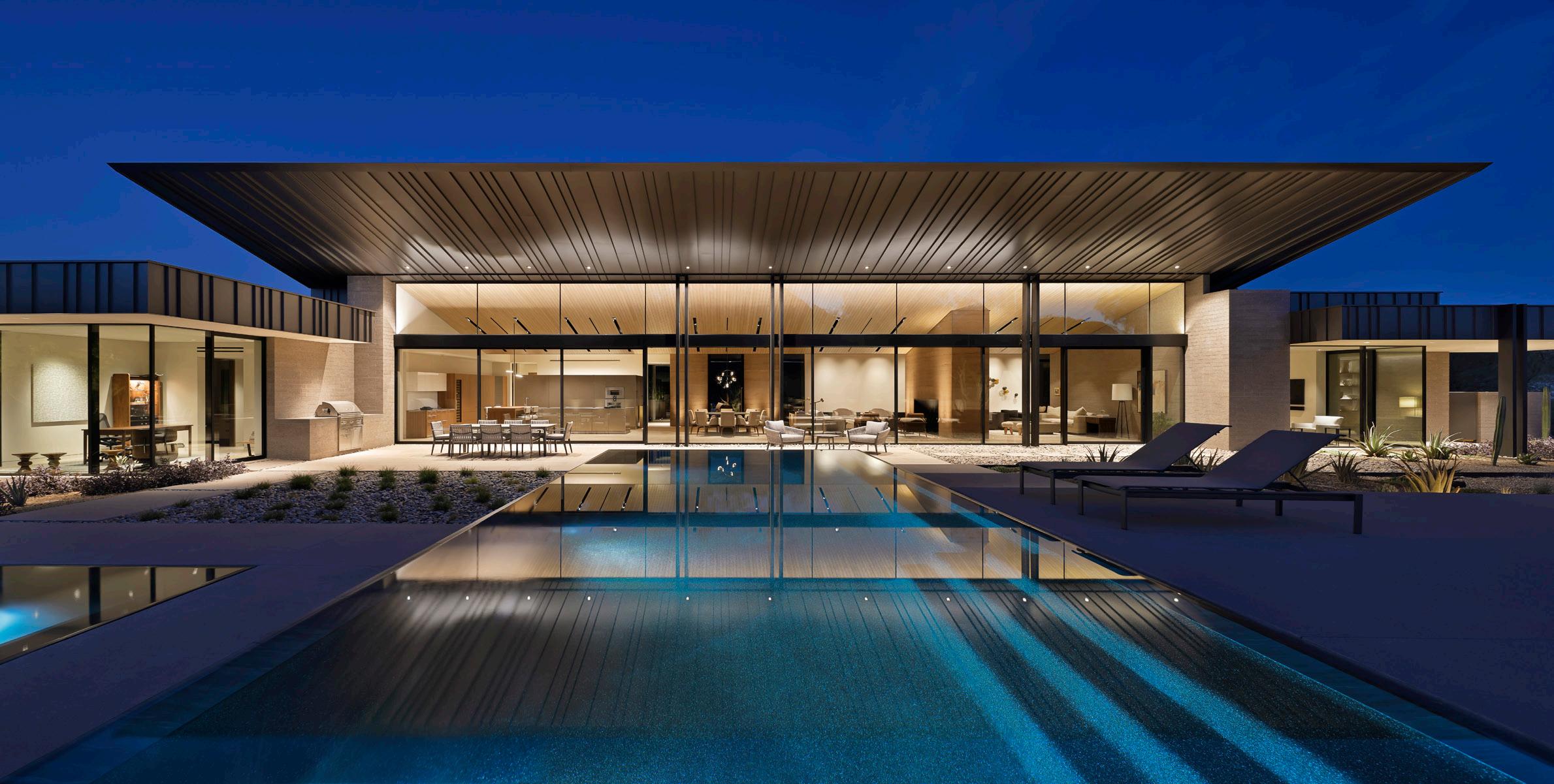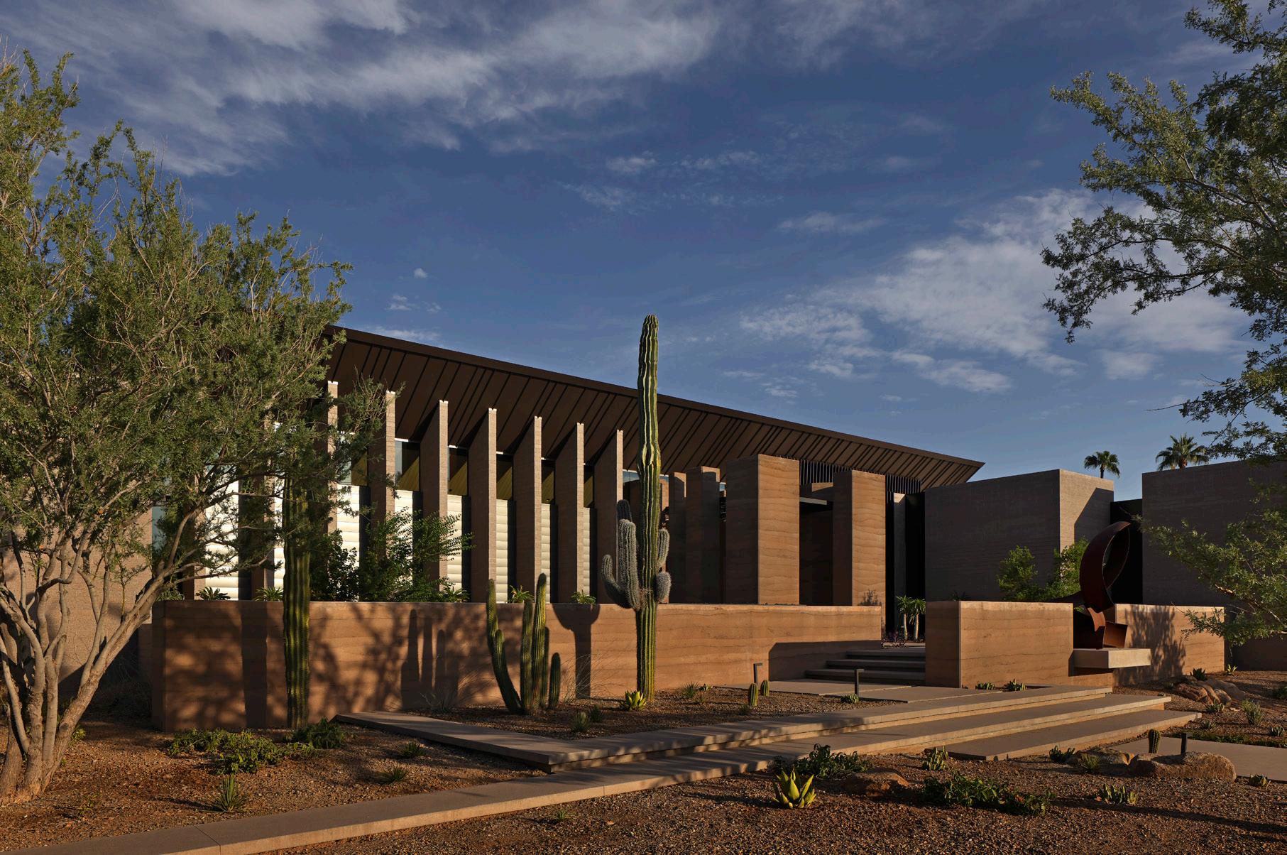 Nestled amongst a rich palette of native vegetation, the Desert Fairways Residence slowly reveals itself as it emerges from its lush surroundings. Its design captures the eye, with low masses defining private zones that contrast with a dynamically folded metal plane that shelters the social zone. Changing hues of textured metal cast rhythmic shadows, recalling the ribs of a cactus, while masonry forms shield the interior from western sun.