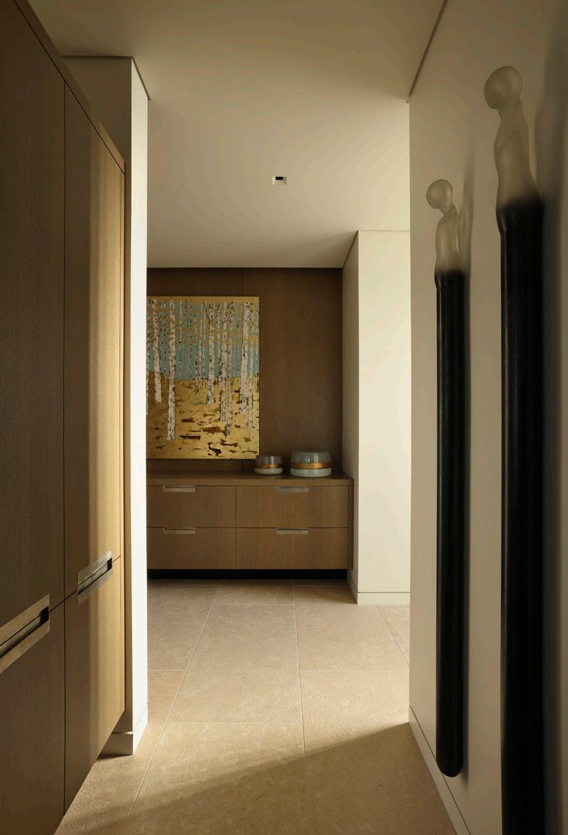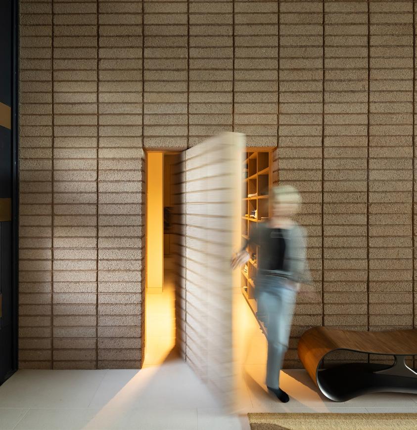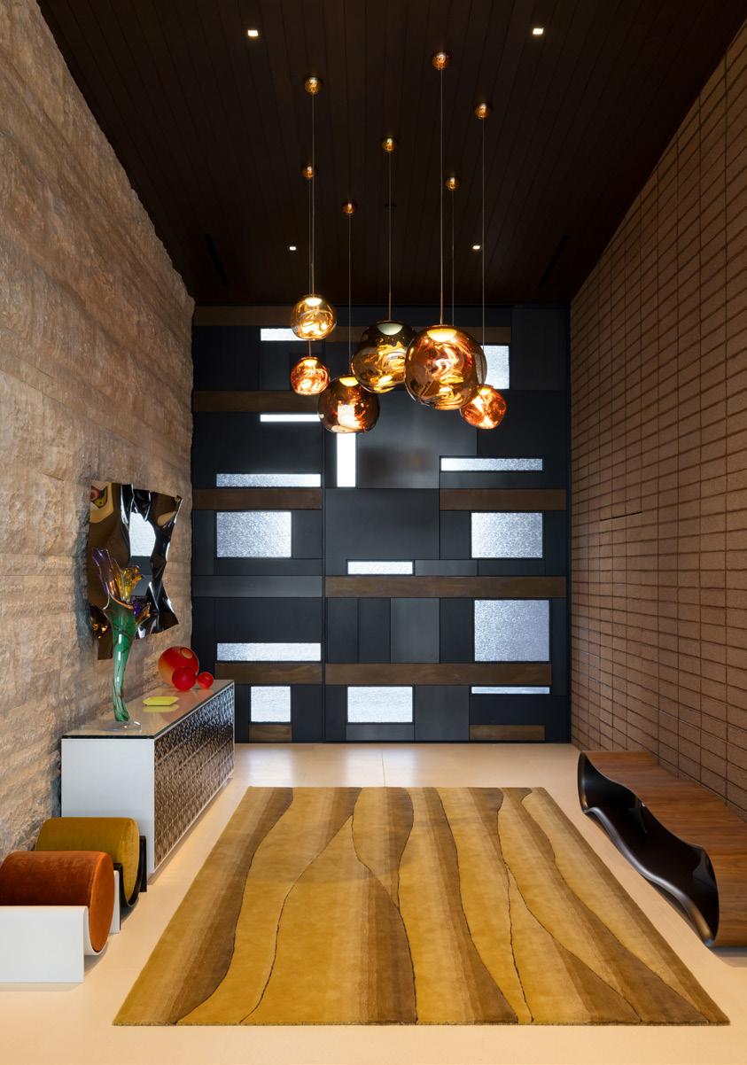 Stepping through the front door, a striking pivoting metal and glass panel, measuring seven and a half by thirteen and a half feet, unfolds. The door’s design abstractly echoes the home’s overall façade, composed of copper, textured glass, and hot-rolled steel elements. Just inside, a hidden door blends seamlessly into the stacked-bond masonry wall, offering discreet storage for shoes and coats, continuing the home’s refined attention to detail.