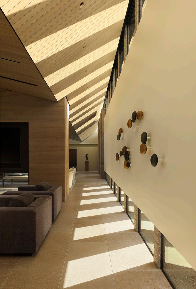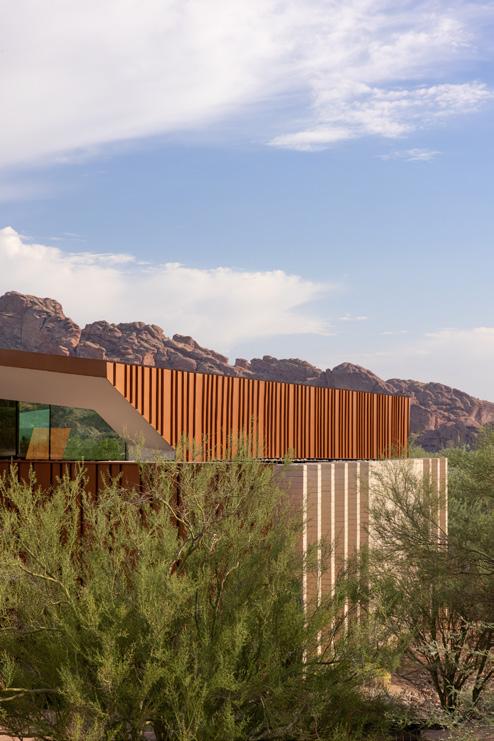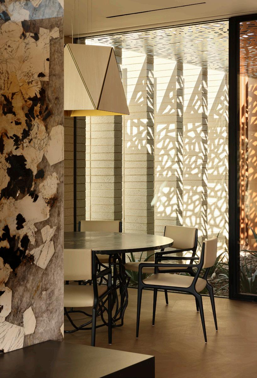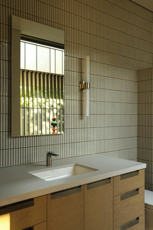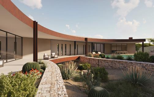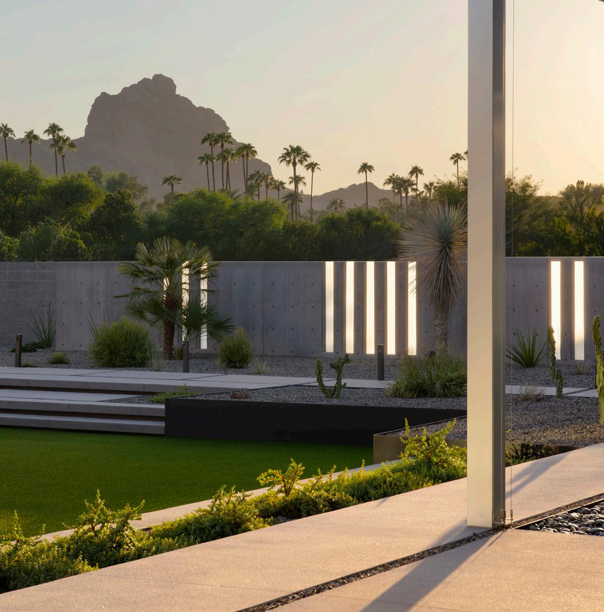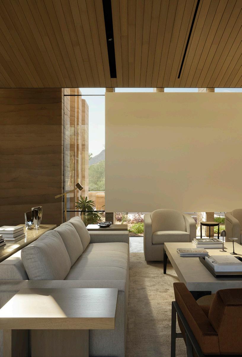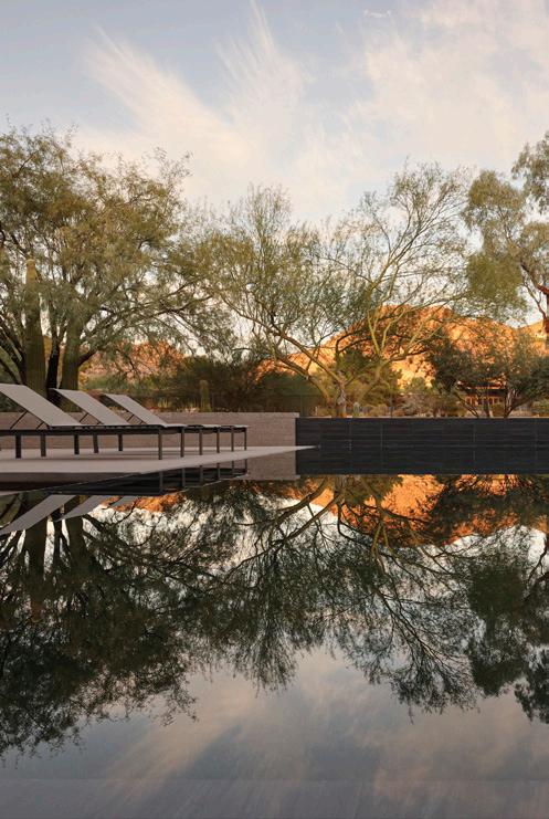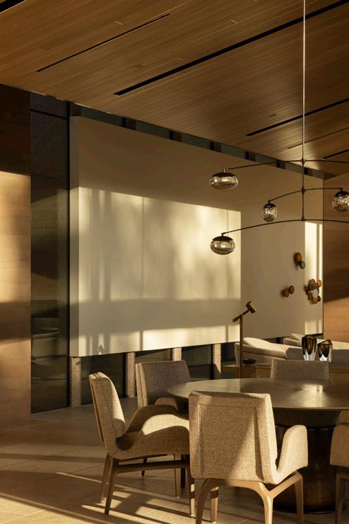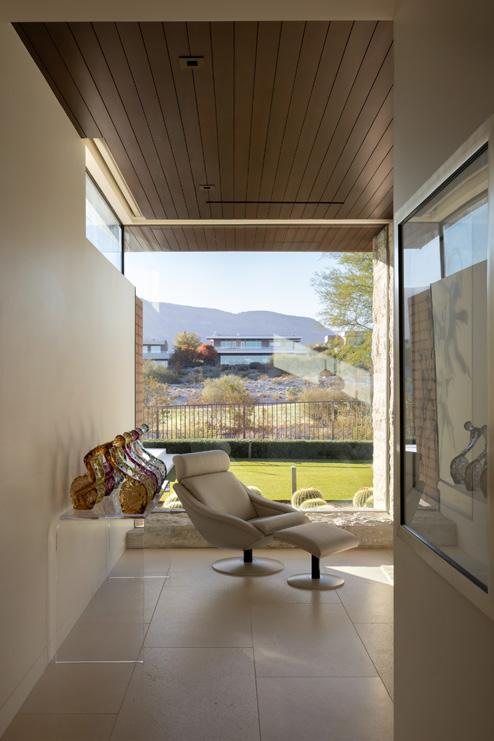The guest suites offer an intimate experience of the desert landscape, with views that blur the line between indoors and outdoors. The nearly frameless glass wall brings the lush desert garden closer, inviting its textures and colors into the room. Beyond, glimpses of the golf course emerge, framed by the lowwater-use plantings that create a seamless connection to the mountain views. In the bathrooms, a “light garden” provides a private outdoor sanctuary, where natural light floods the space while offering a tranquil view of an outdoor sculpture, ensuring both privacy and serenity.
