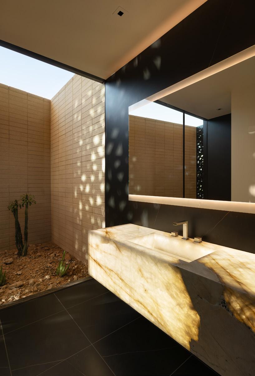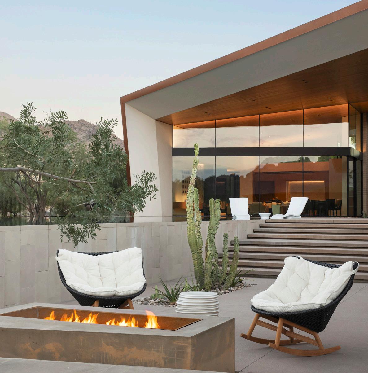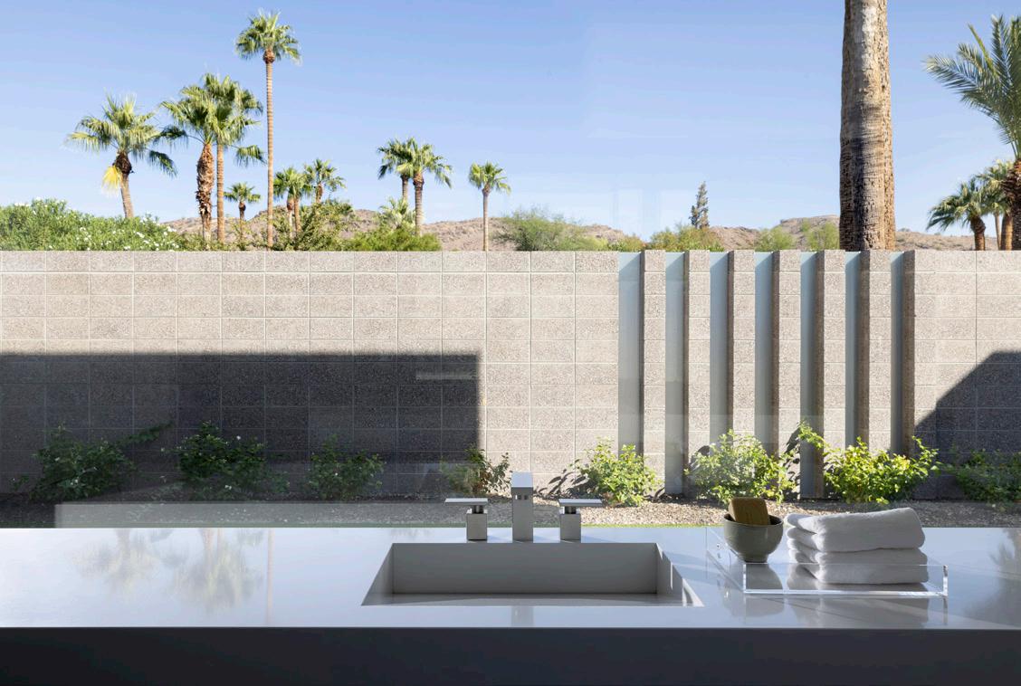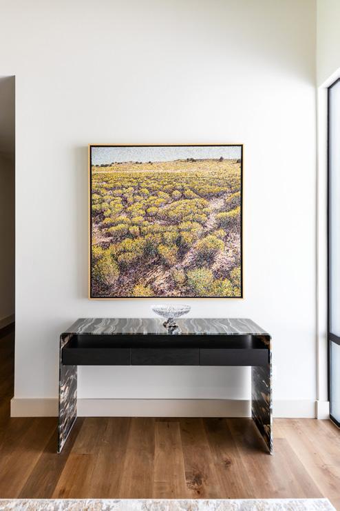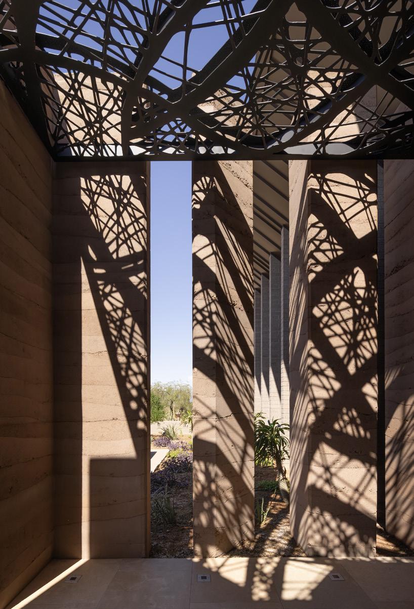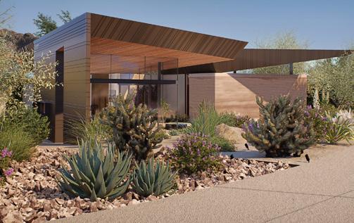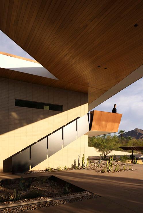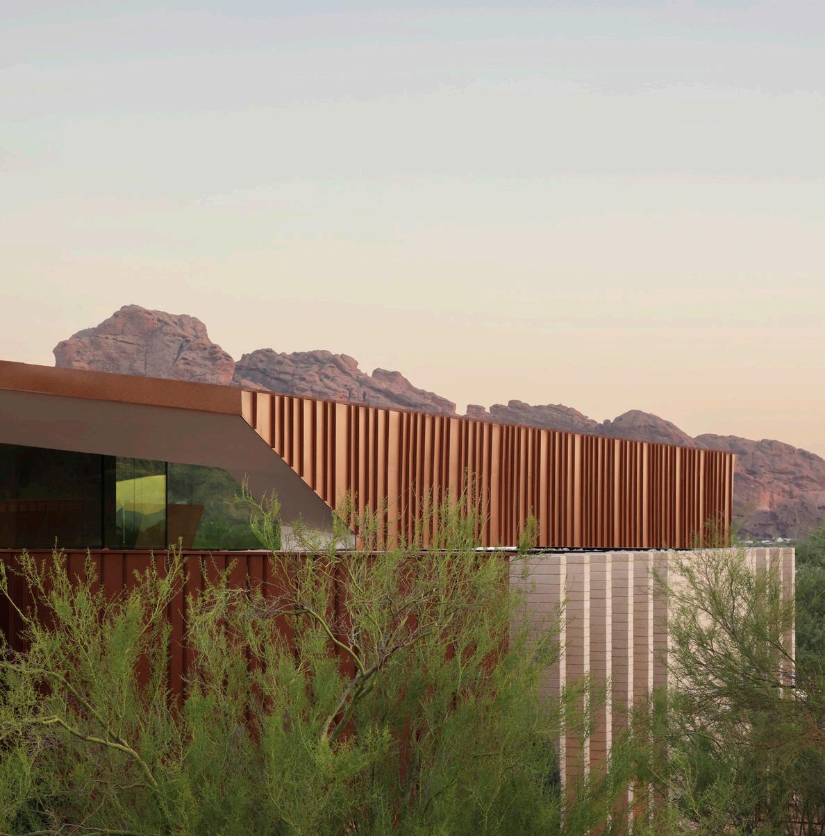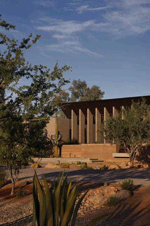 The guest suites offer an intimate experience of the desert landscape, with views that blur the line between indoors and outdoors. The nearly frameless glass wall brings the lush desert garden closer, inviting its textures and colors into the room. Beyond, glimpses of the golf course emerge, framed by the lowwater-use plantings that create a seamless connection to the mountain views. In the bathrooms, a “light garden” provides a private outdoor sanctuary, where natural light floods the space while offering a tranquil view of an outdoor sculpture, ensuring both privacy and serenity.
