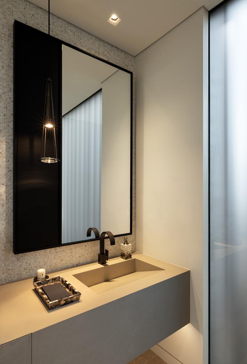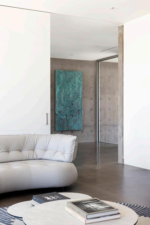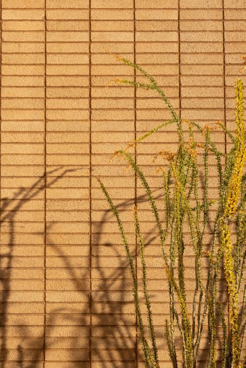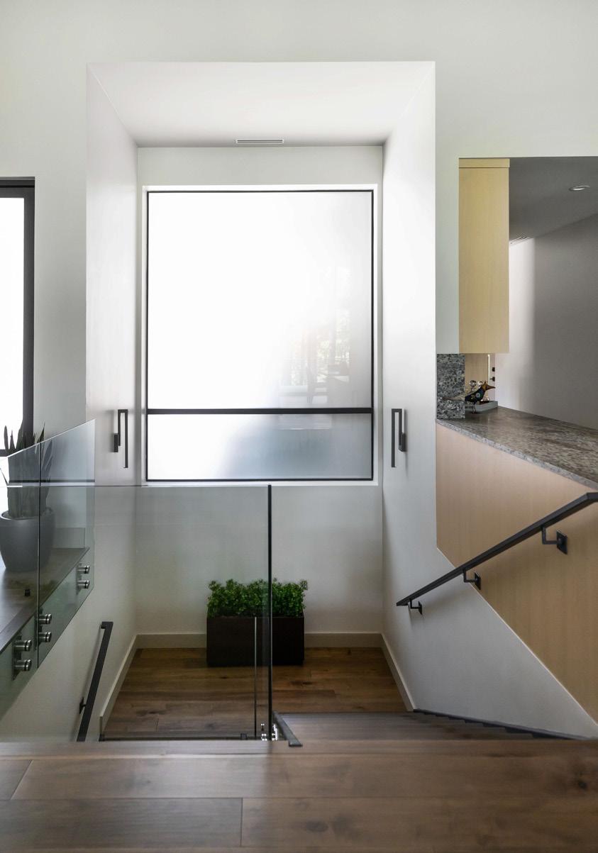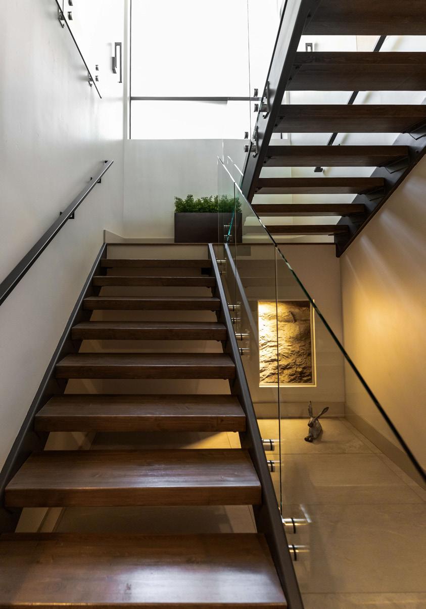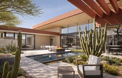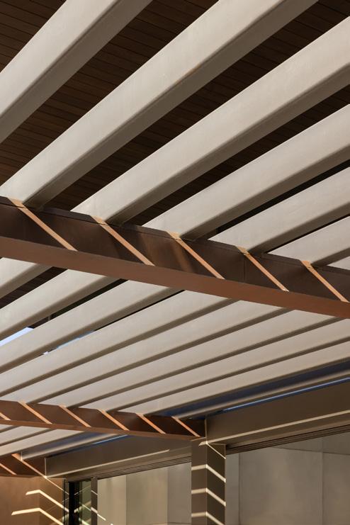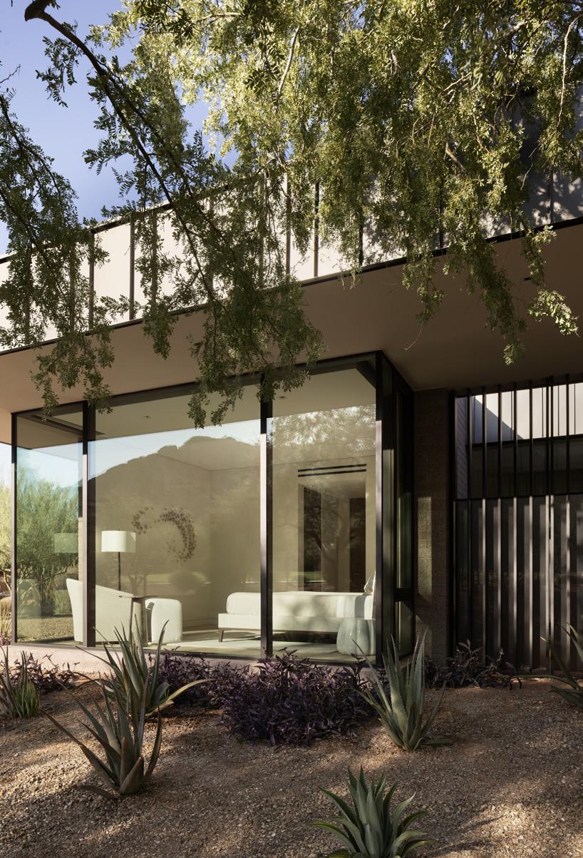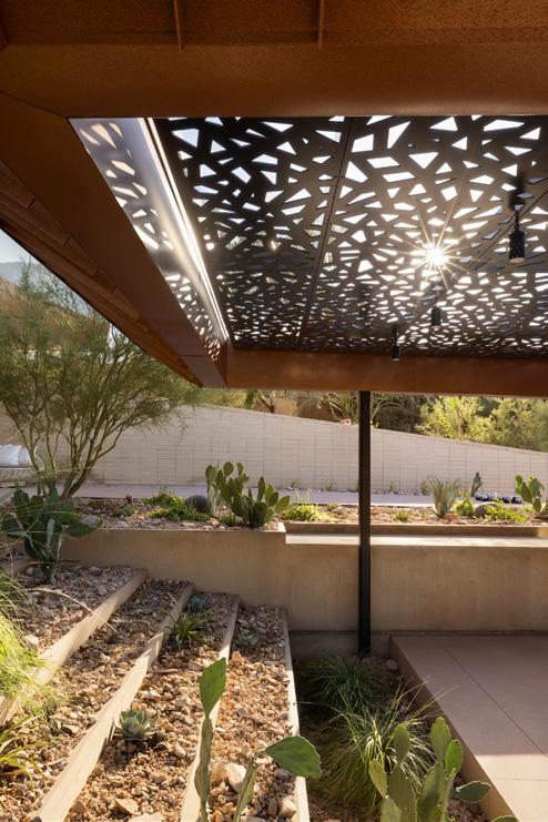 The guest suites offer an intimate experience of the desert landscape, with views that blur the line between indoors and outdoors. The nearly frameless glass wall brings the lush desert garden closer, inviting its textures and colors into the room. Beyond, glimpses of the golf course emerge, framed by the lowwater-use plantings that create a seamless connection to the mountain views. In the bathrooms, a “light garden” provides a private outdoor sanctuary, where natural light floods the space while offering a tranquil view of an outdoor sculpture, ensuring both privacy and serenity.