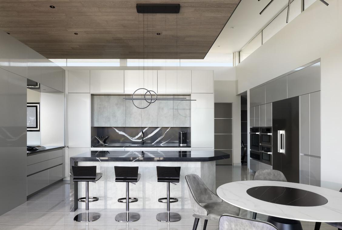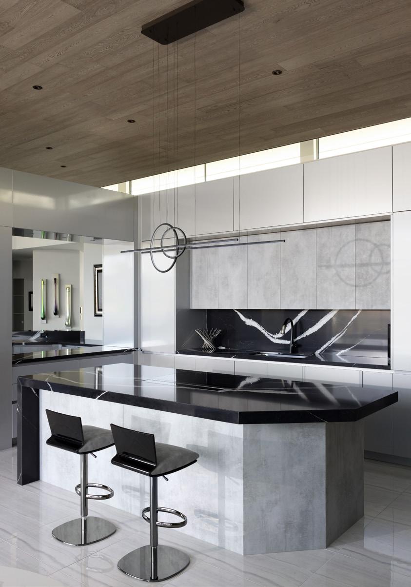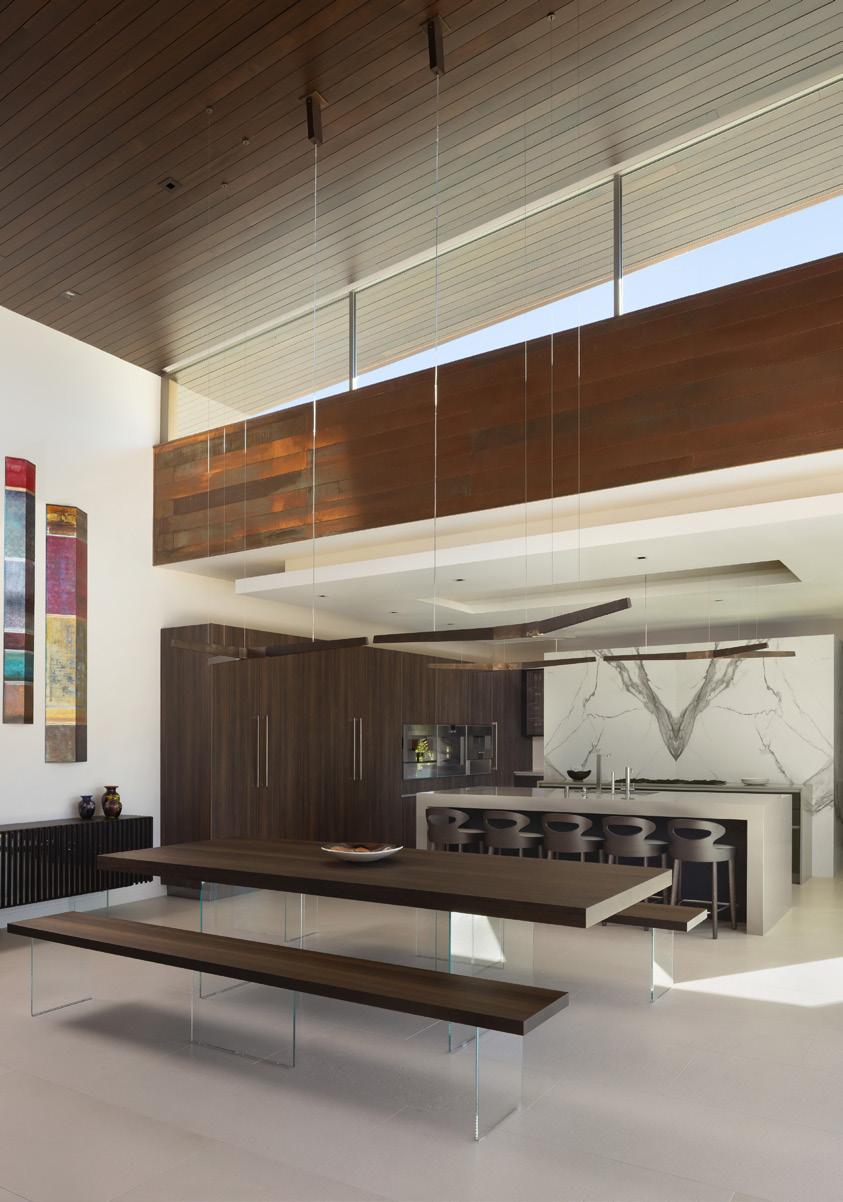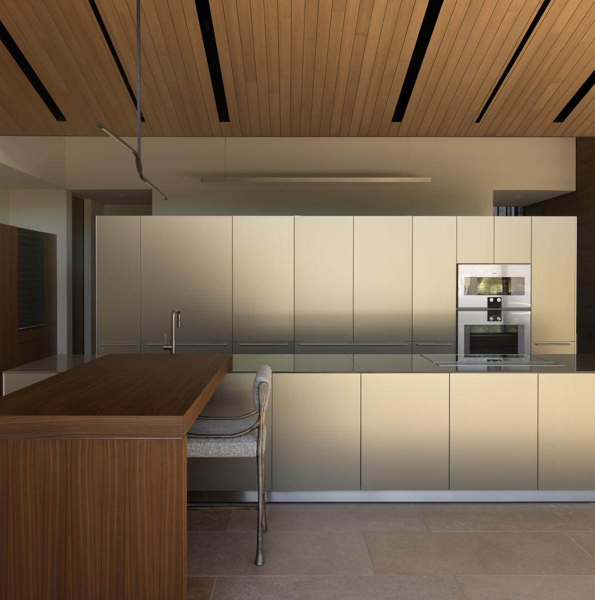 At the heart of the home’s open-plan arrangement, a sculpted feature, composed of high-gloss millwork and stone, floats within the larger volume of the home’s social zone, offering ample storage and utility while subtly defining the kitchen, bar, formal and informal dining areas, and circulation pathways. Each surrounding space feels more gracious and connected to each other by virtue of the visually borrowed space of its neighbor. To further define this central feature, a ceiling cloud, adorned with metal and wood, floats above, bringing a feeling of warmth, coziness, and intimate scale to the kitchen and bar area. Natural light from surrounding clerestory windows is diffused by this architectural cloud during the day while indirect lighting creates a halo effect in the evening, adding further drama and refinement to the primary entertainment zone of this home.