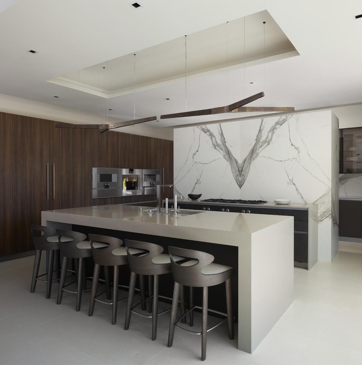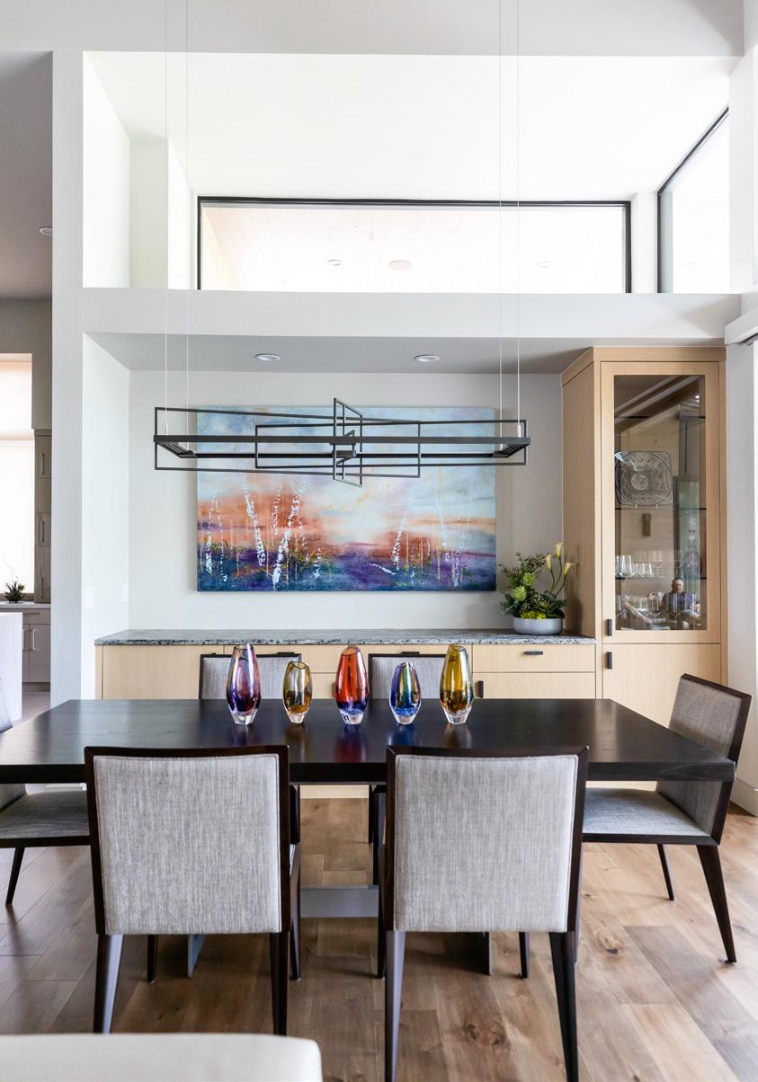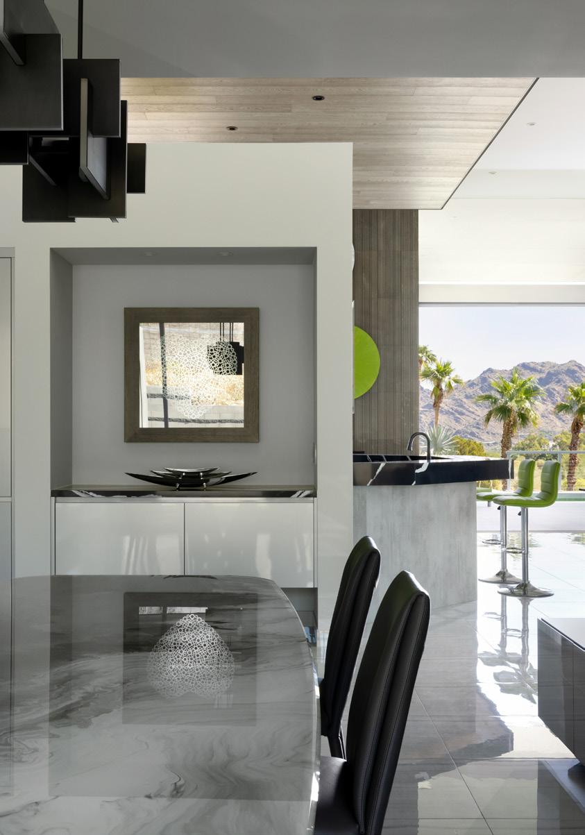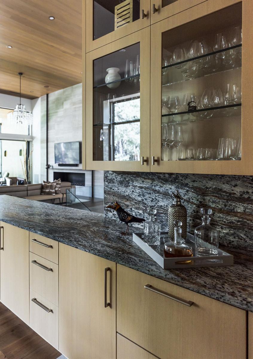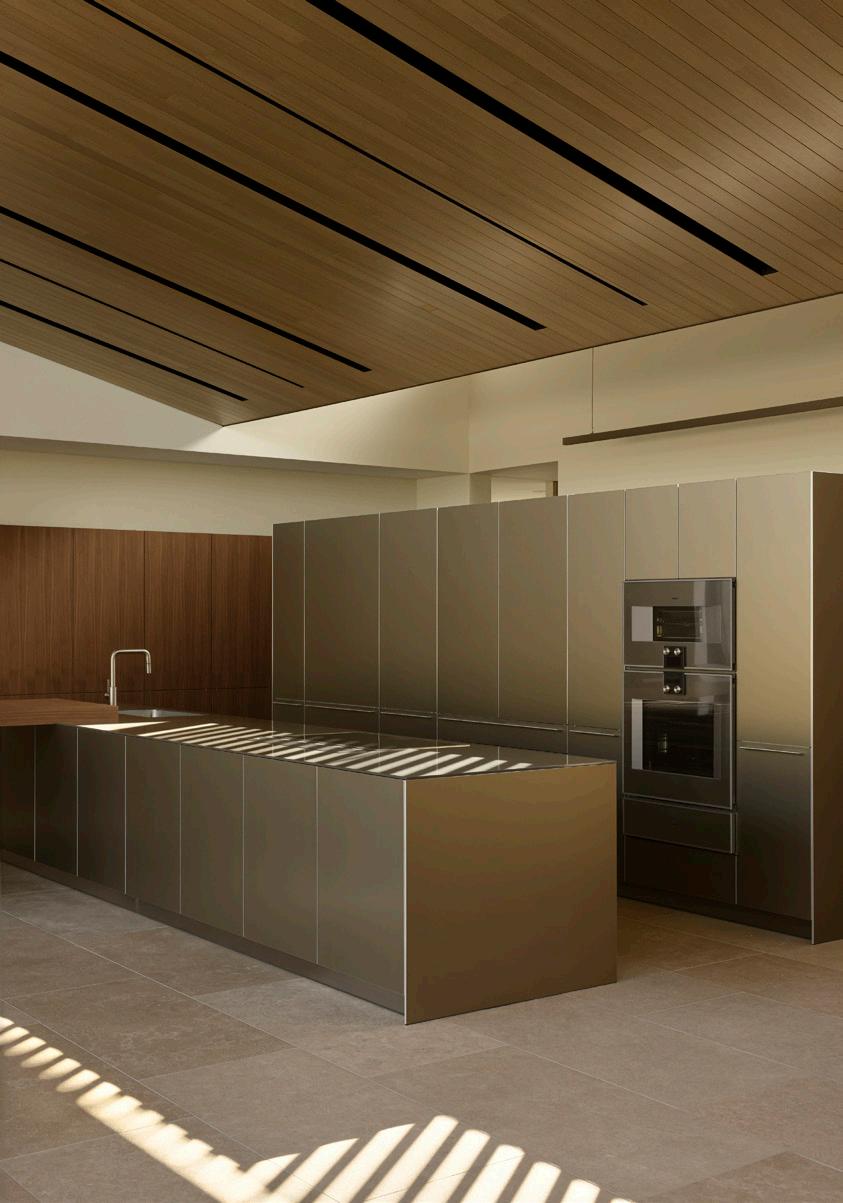 At the heart of the home’s open-plan arrangement, a sculpted feature, composed of high-gloss millwork and stone, floats within the larger volume of the home’s social zone, offering ample storage and utility while subtly defining the kitchen, bar, formal and informal dining areas, and circulation pathways. Each surrounding space feels more gracious and connected to each other by virtue of the visually borrowed space of its neighbor. To further define this central feature, a ceiling cloud, adorned with metal and wood, floats above, bringing a feeling of warmth, coziness, and intimate scale to the kitchen and bar area. Natural light from surrounding clerestory windows is diffused by this architectural cloud during the day while indirect lighting creates a halo effect in the evening, adding further drama and refinement to the primary entertainment zone of this home.