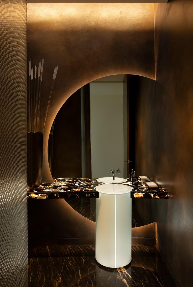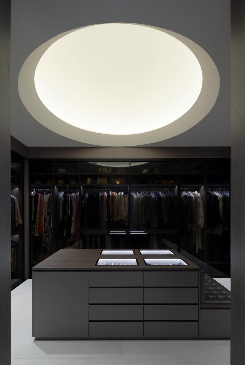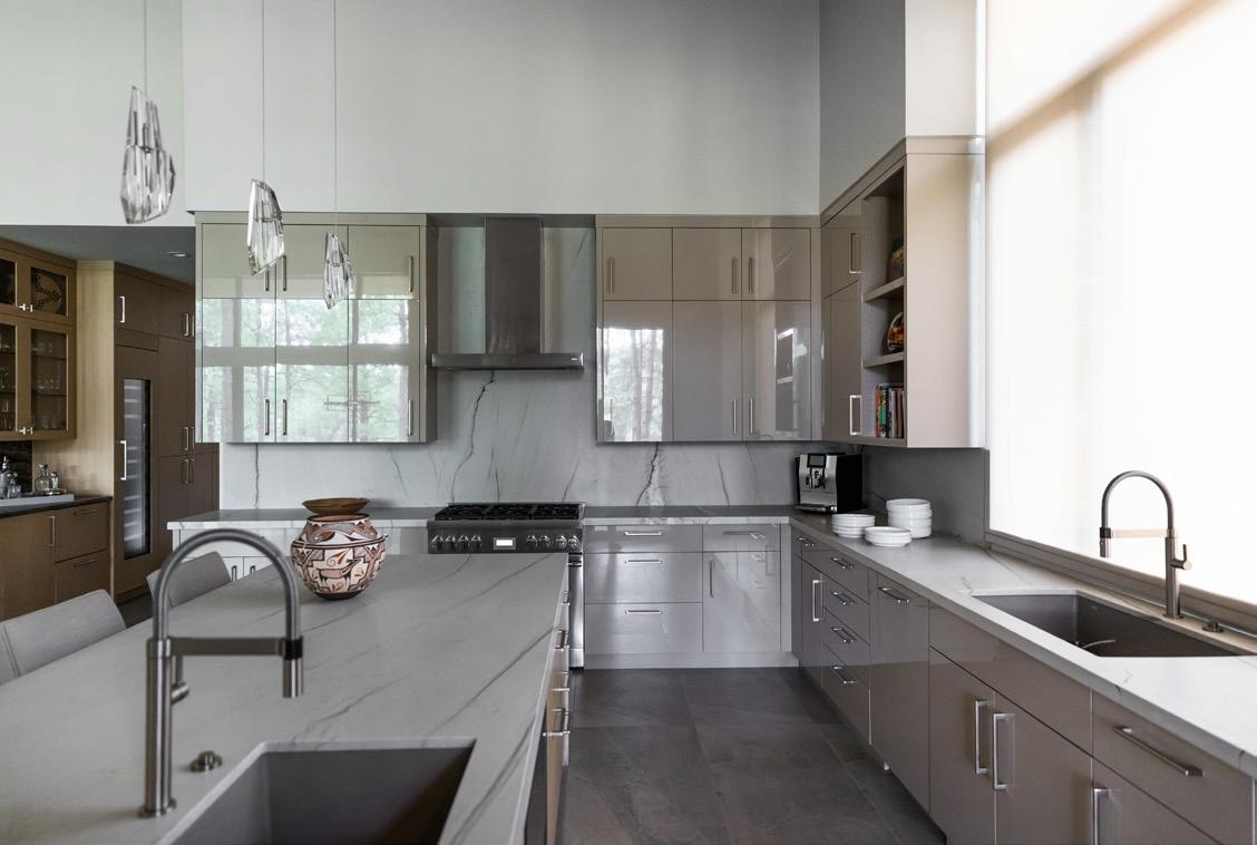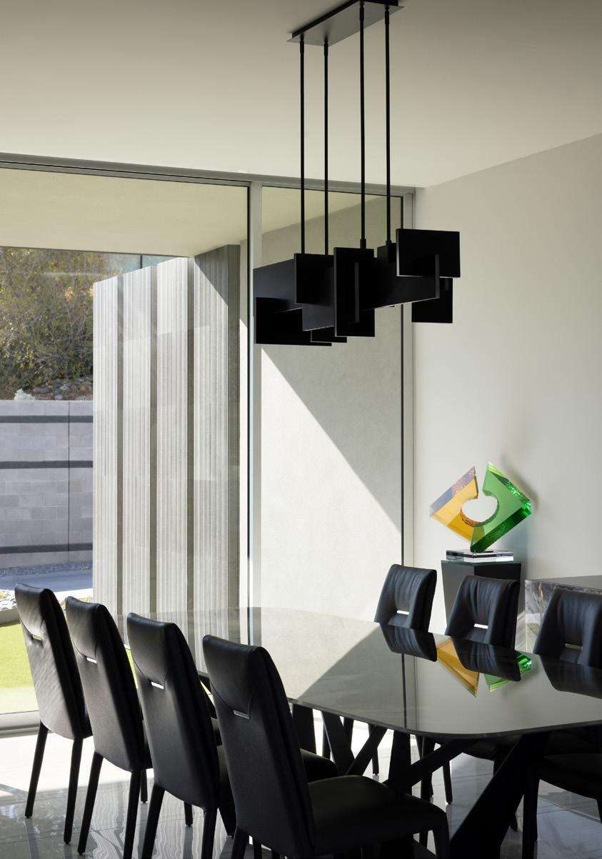At the heart of the home’s open-plan arrangement, a sculpted feature, composed of high-gloss millwork and stone, floats within the larger volume of the home’s social zone, offering ample storage and utility while subtly defining the kitchen, bar, formal and informal dining areas, and circulation pathways. Each surrounding space feels more gracious and connected to each other by virtue of the visually borrowed space of its neighbor. To further define this central feature, a ceiling cloud, adorned with metal and wood, floats above, bringing a feeling of warmth, coziness, and intimate scale to the kitchen and bar area. Natural light from surrounding clerestory windows is diffused by this architectural cloud during the day while indirect lighting creates a halo effect in the evening, adding further drama and refinement to the primary entertainment zone of this home.
