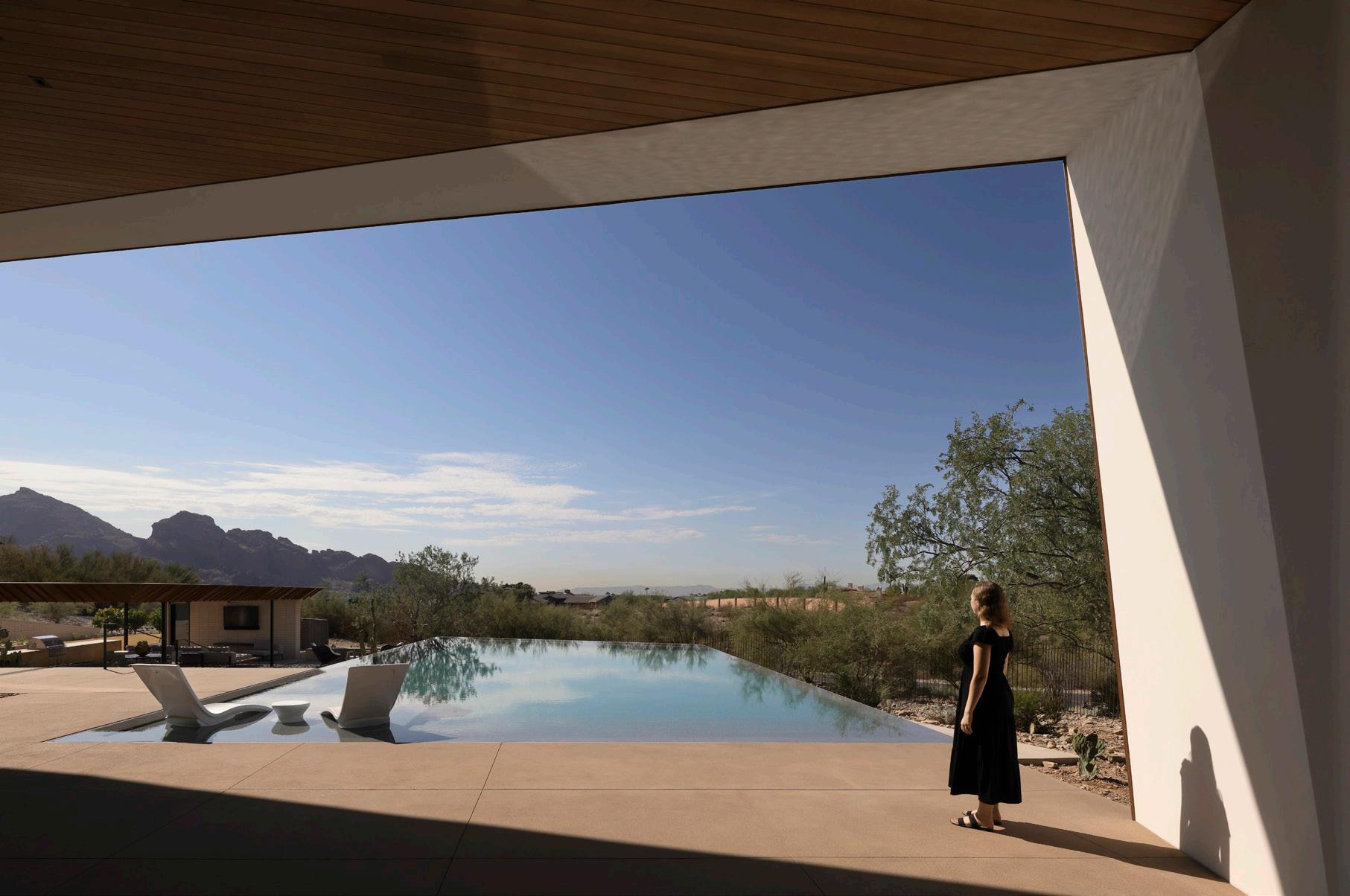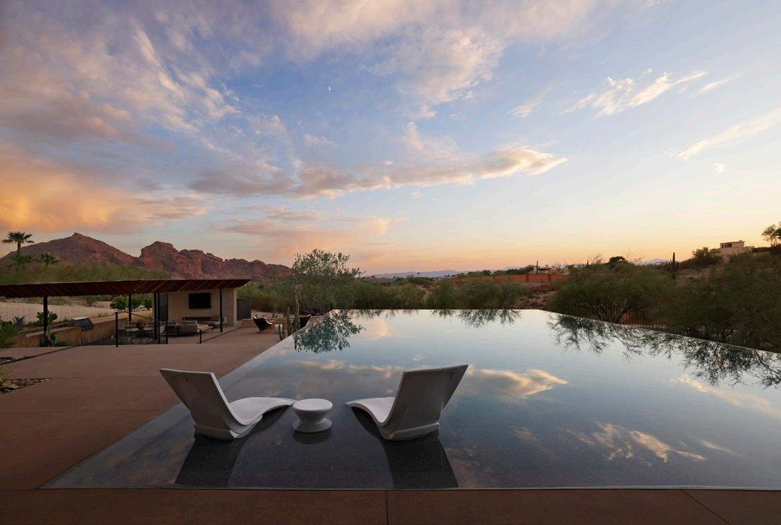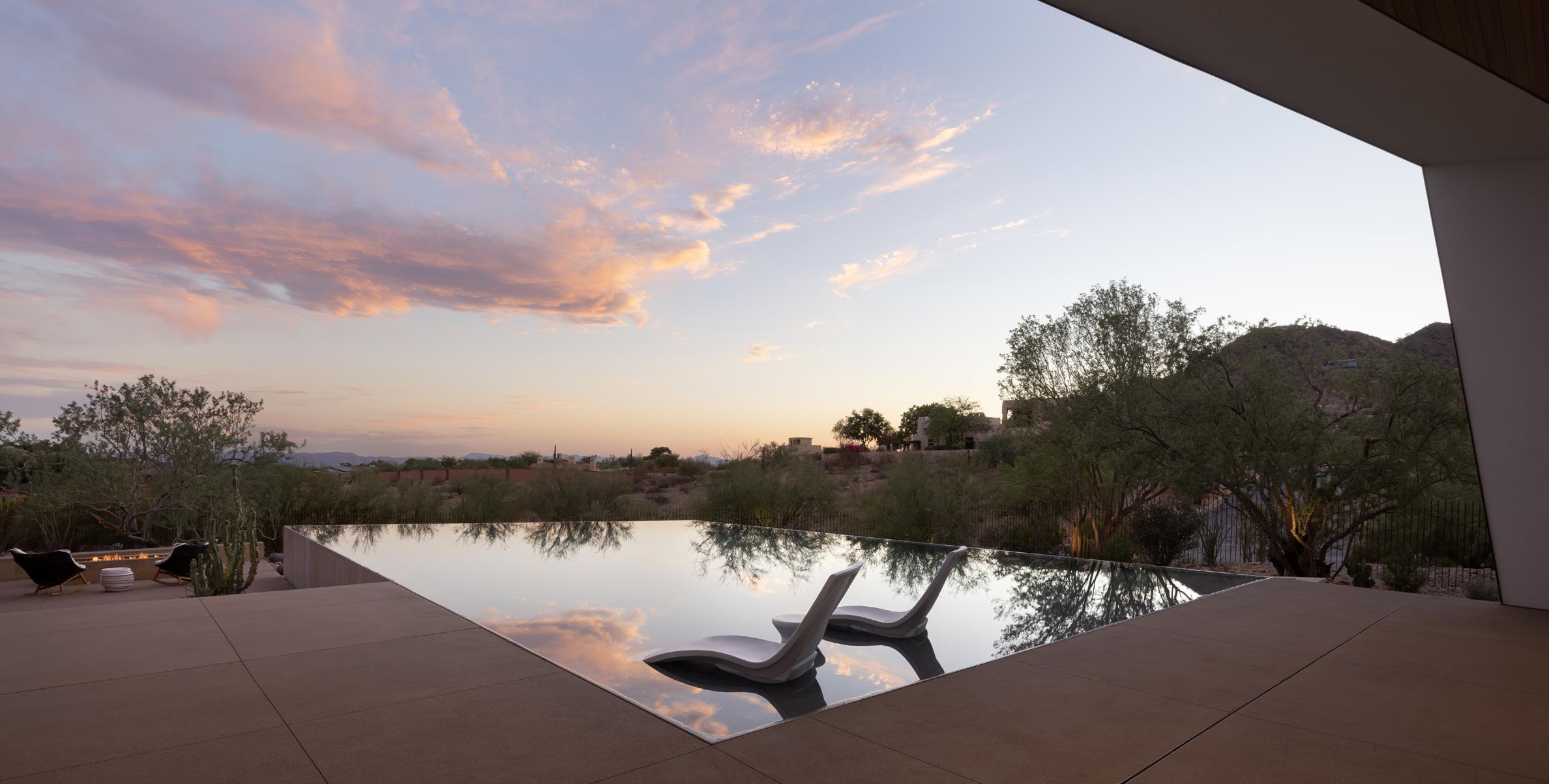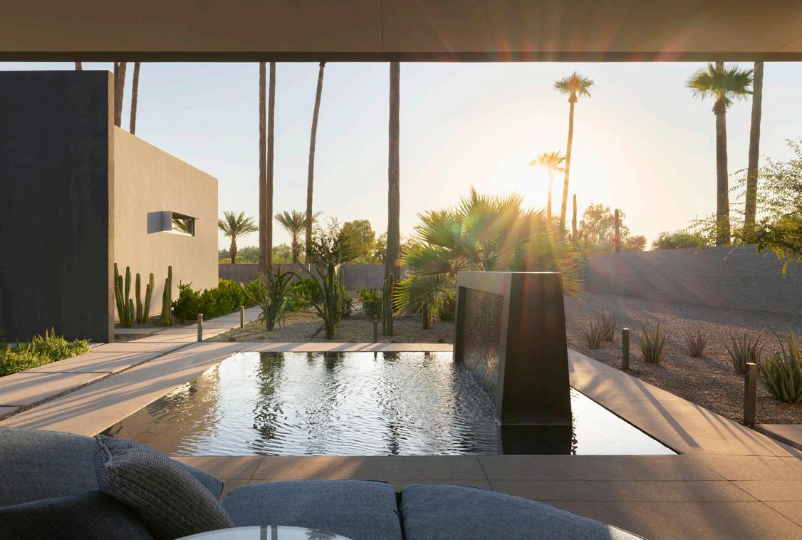 A raised, sculptural pool reflects the blue Arizona sky while simultaneously cascading down its perimeter walls to compose a soothing harmony of sound and visual delight while creating a cool micro-climate within the outdoor living area.