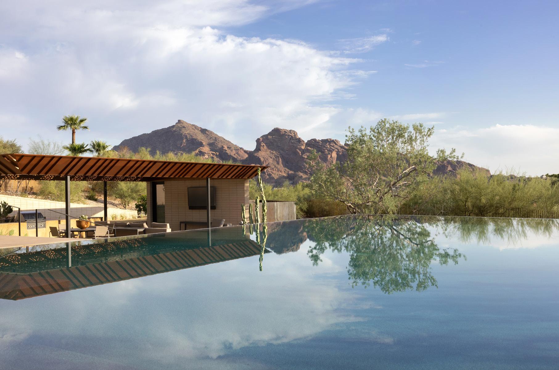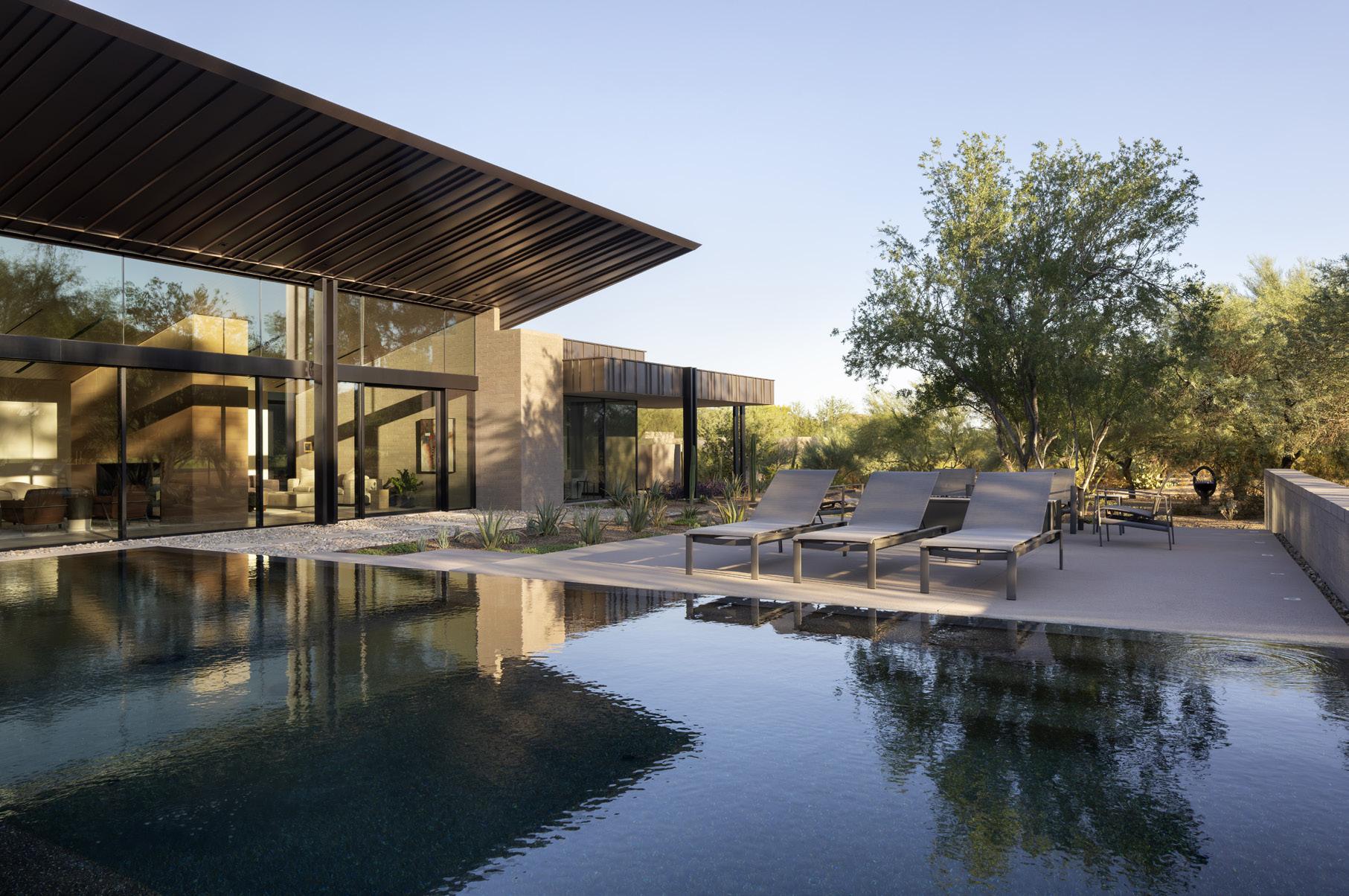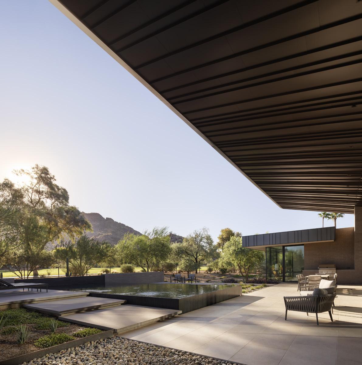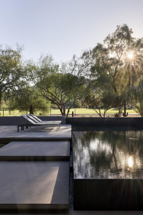 A raised, sculptural pool reflects the blue Arizona sky while simultaneously cascading down its perimeter walls to compose a soothing harmony of sound and visual delight while creating a cool micro-climate within the outdoor living area.
