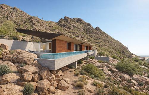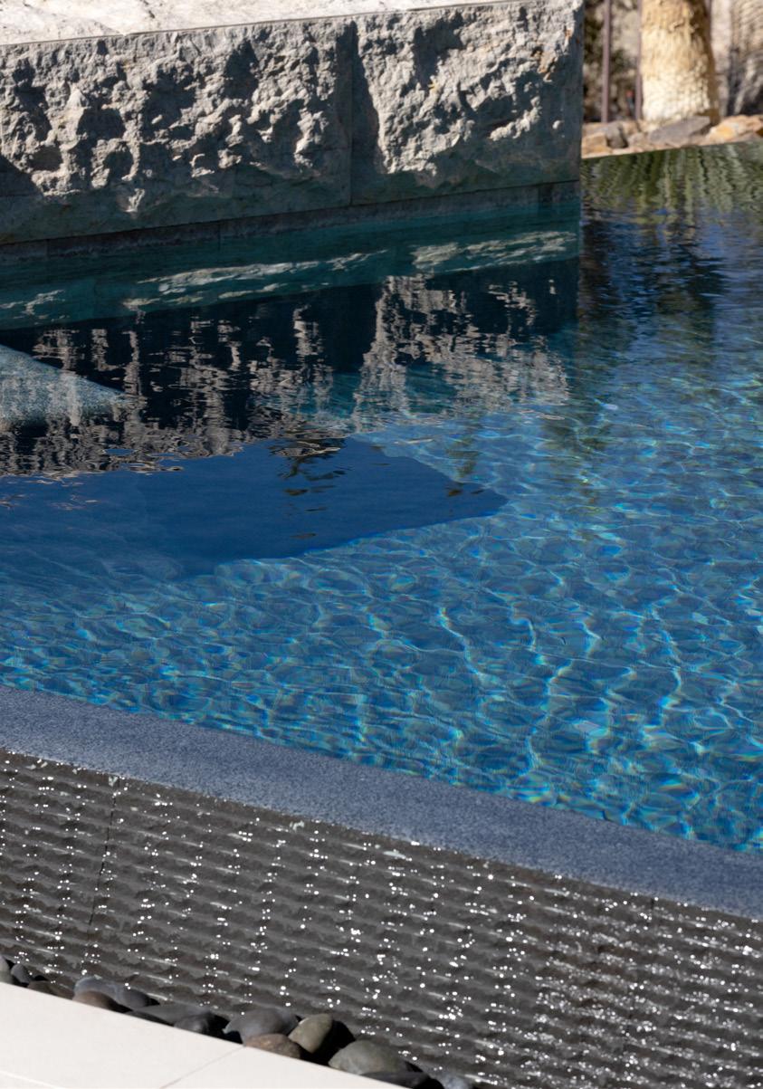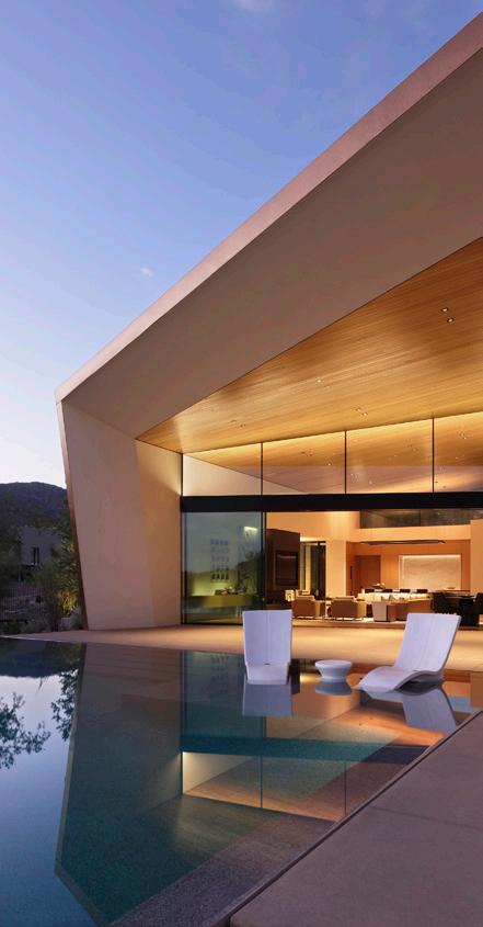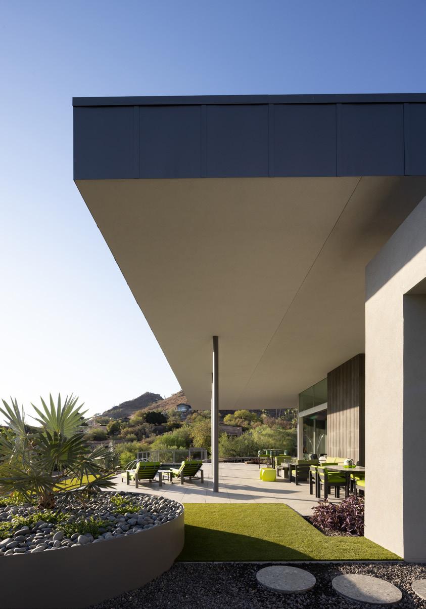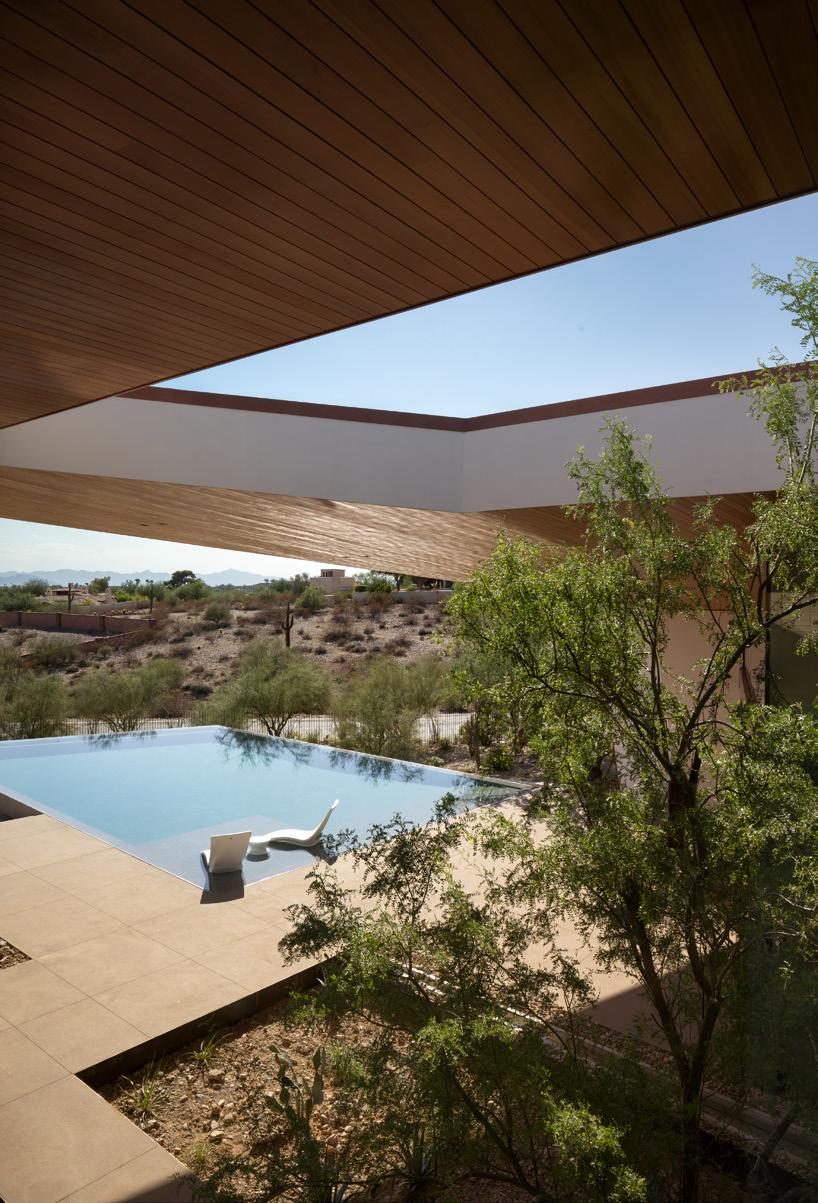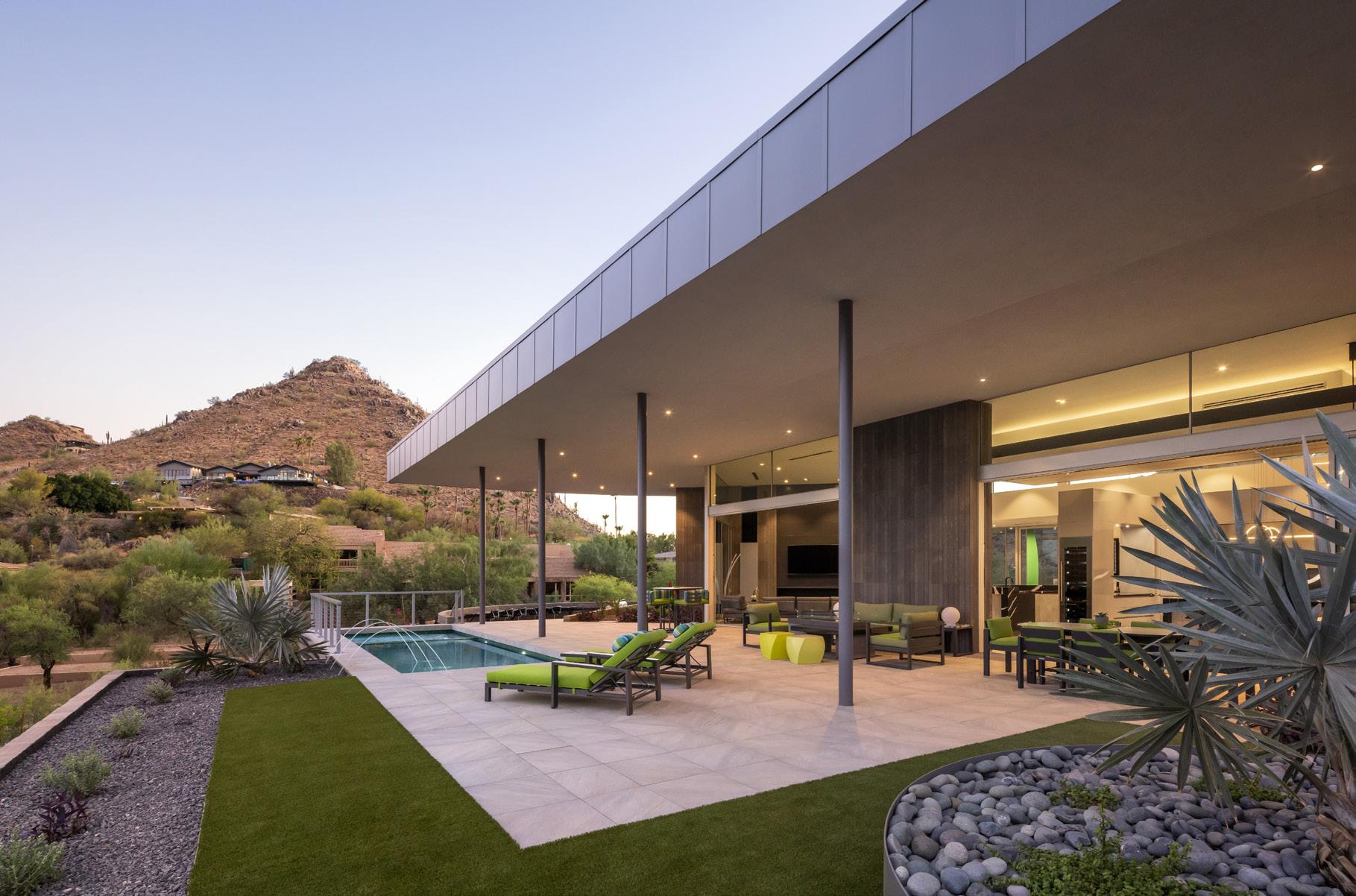 A raised, sculptural pool reflects the blue Arizona sky while simultaneously cascading down its perimeter walls to compose a soothing harmony of sound and visual delight while creating a cool micro-climate within the outdoor living area.