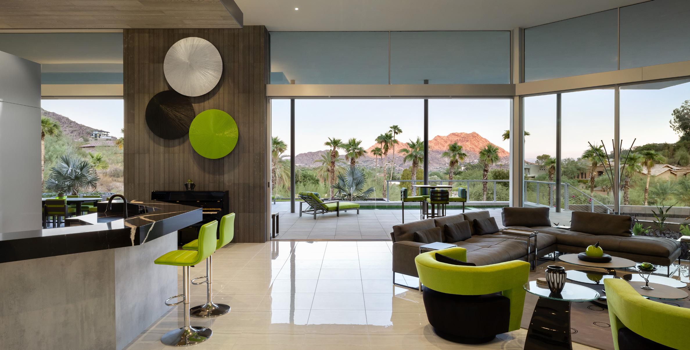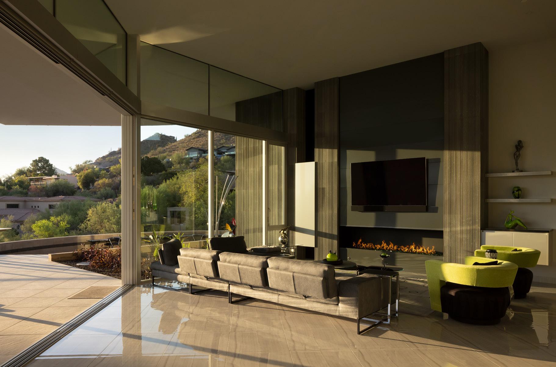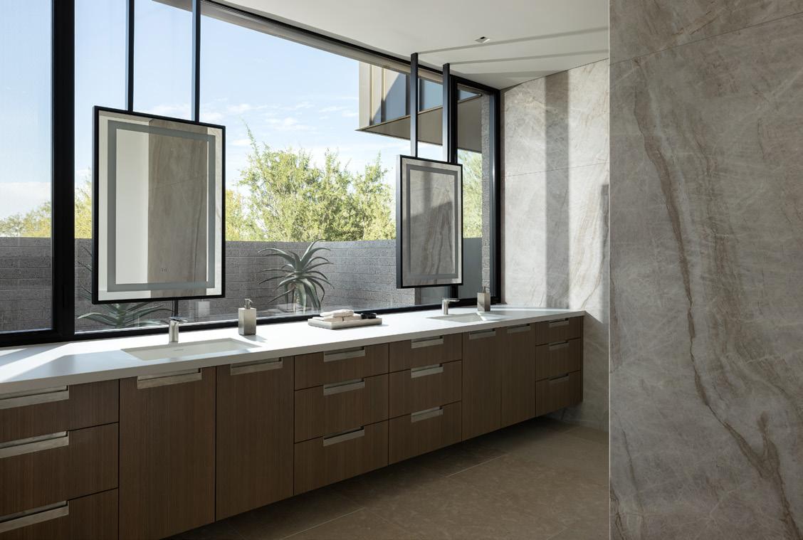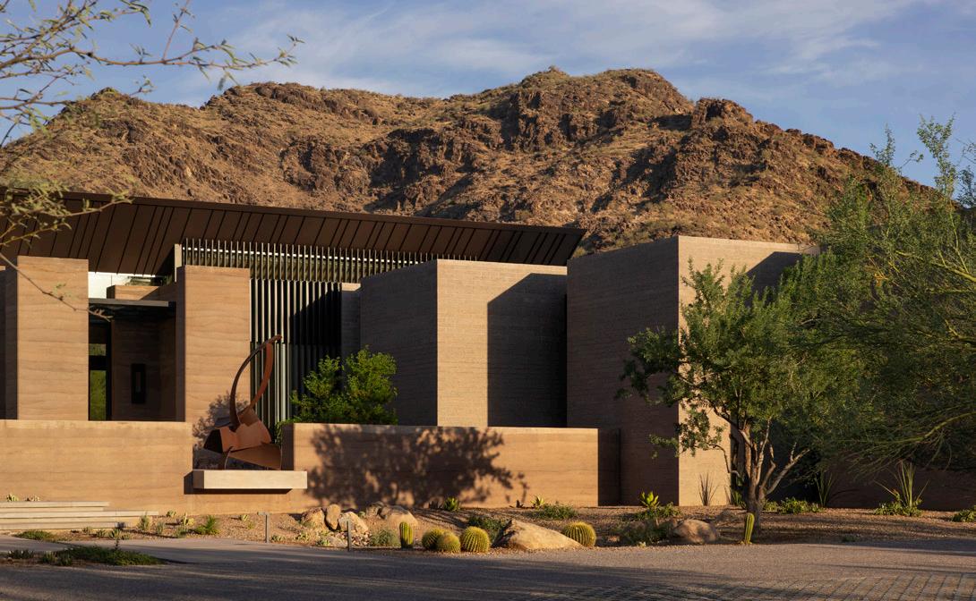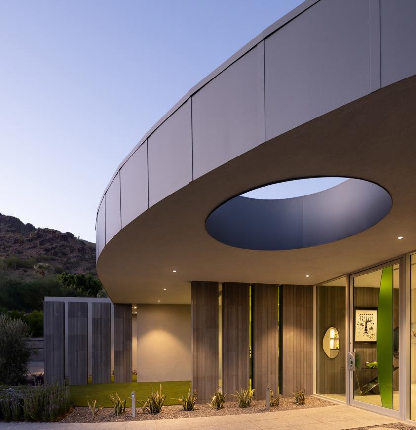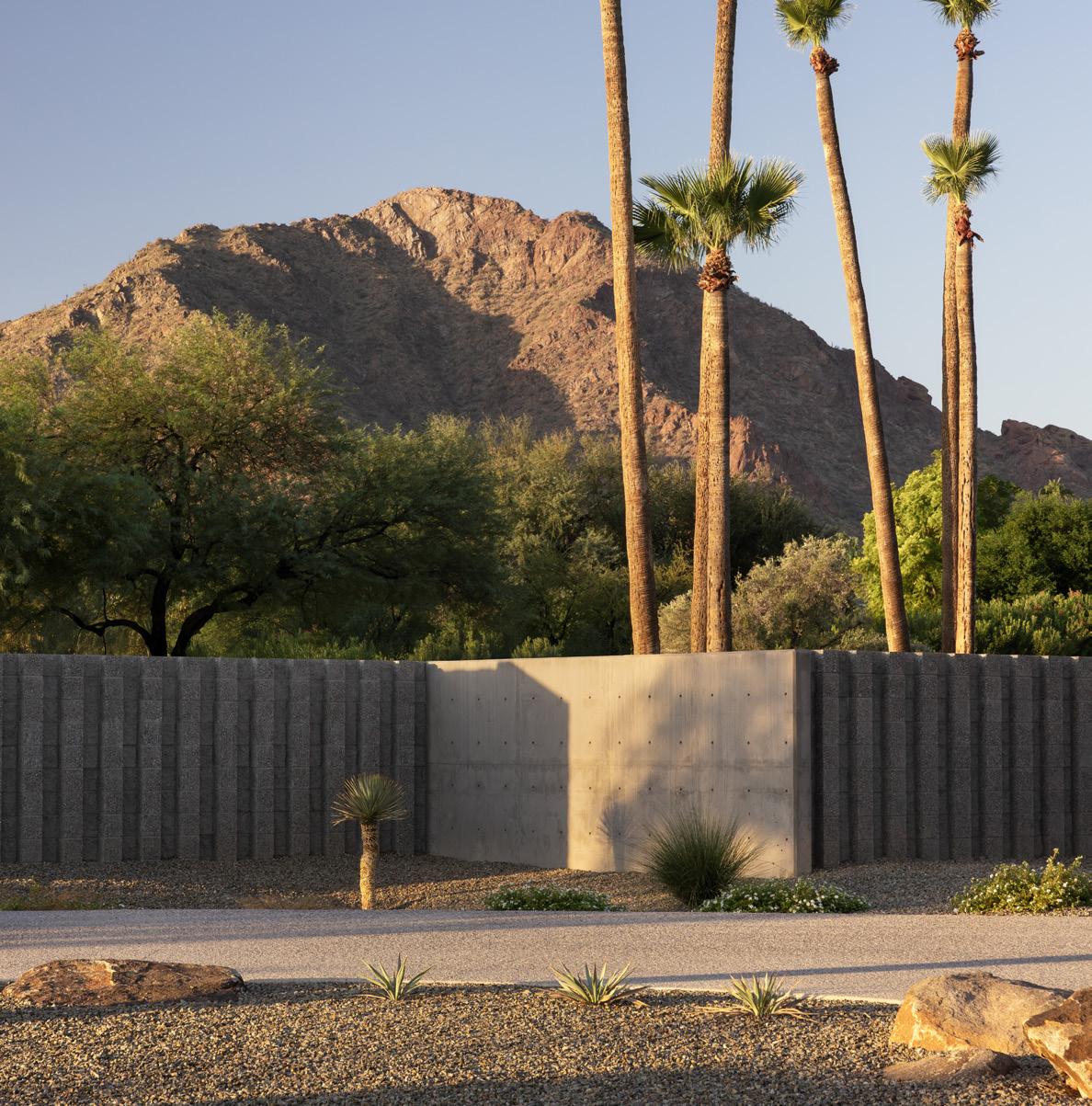 The siting of the Paradise Hills Residence offers an intimate connection to the surrounding landscape, allowing one to begin the day with the soft light of the rising sun illuminating the eastern sky behind Mummy Mountain. As the day closes, the shifting colors of the surrounding hills and mountainscape create a tranquil backdrop, offering an ever-changing, serene view from both inside and outside the home.