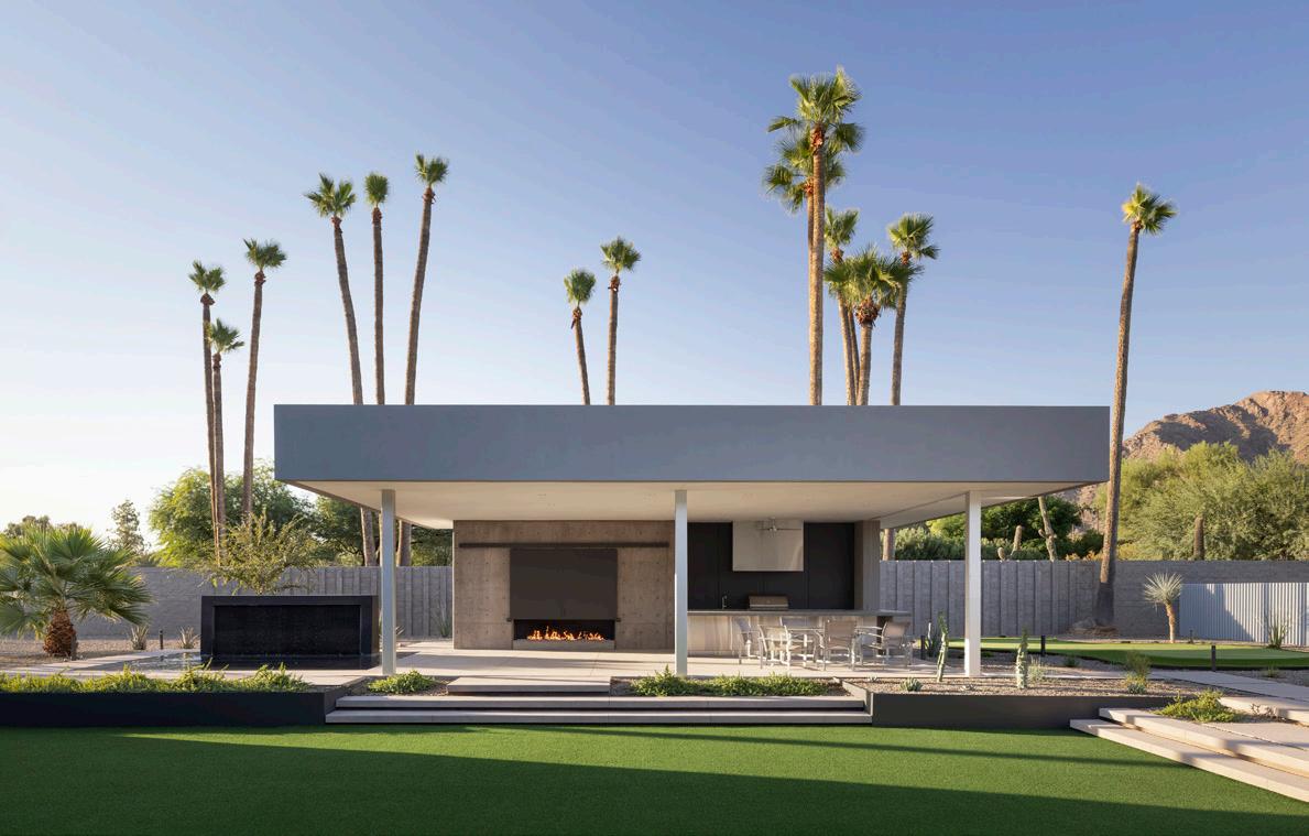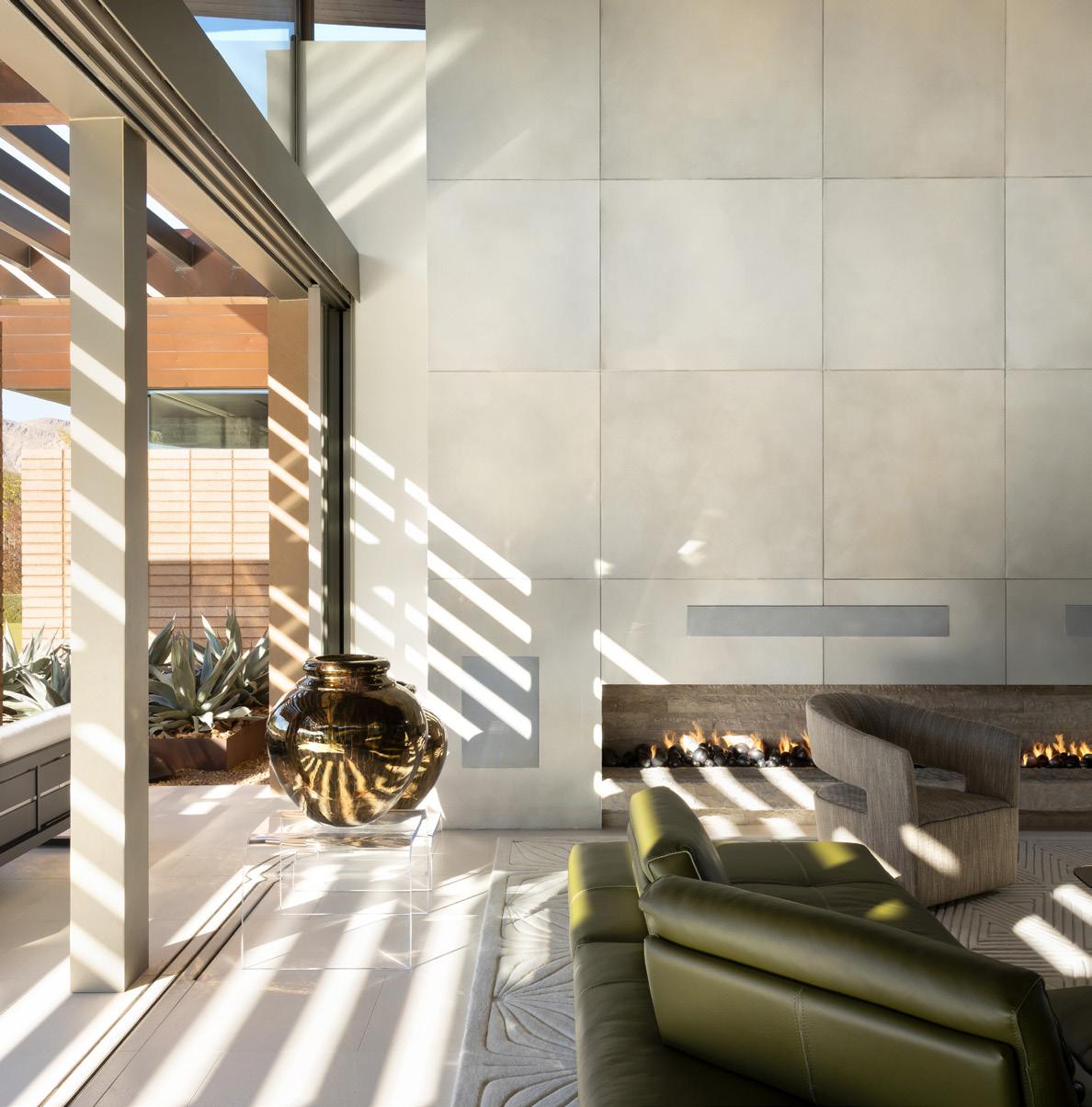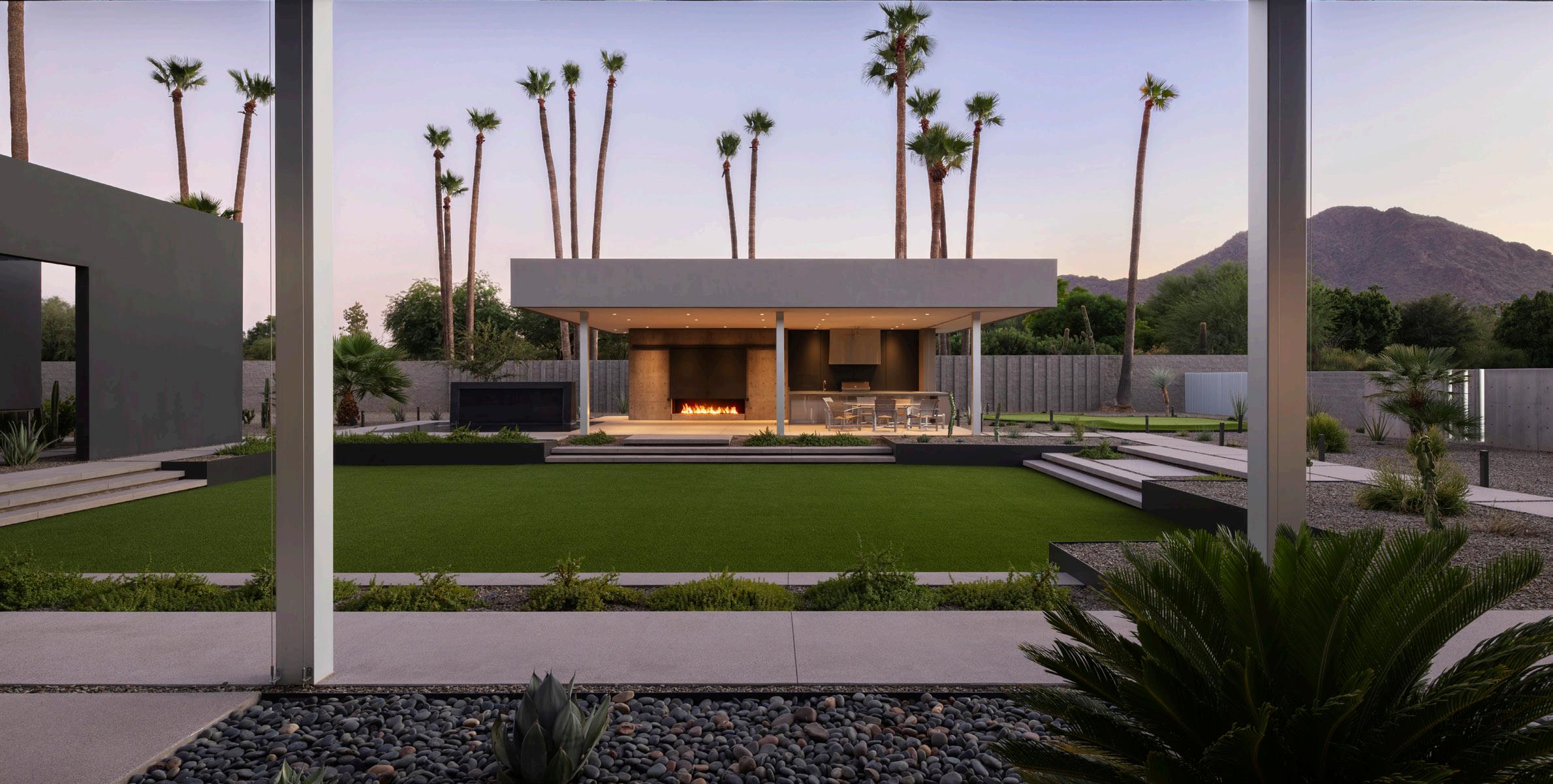 As evening falls, the front terrace becomes a peaceful vantage point to watch the sun set behind the mountains. The space is made cozy with a linear fire feature, providing warmth on cooler nights while enhancing the atmosphere. The lighting accentuates the dynamic forms and ribbed design of the architecture, casting shadows and highlighting the sculptural qualities of the residence. From this quiet perch, the connection to the landscape and the home’s thoughtful design becomes fully realized, embodying the essence of the Desert Fairways Residence: a place where design and nature coexist in harmony, elevating daily life.