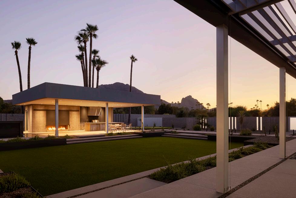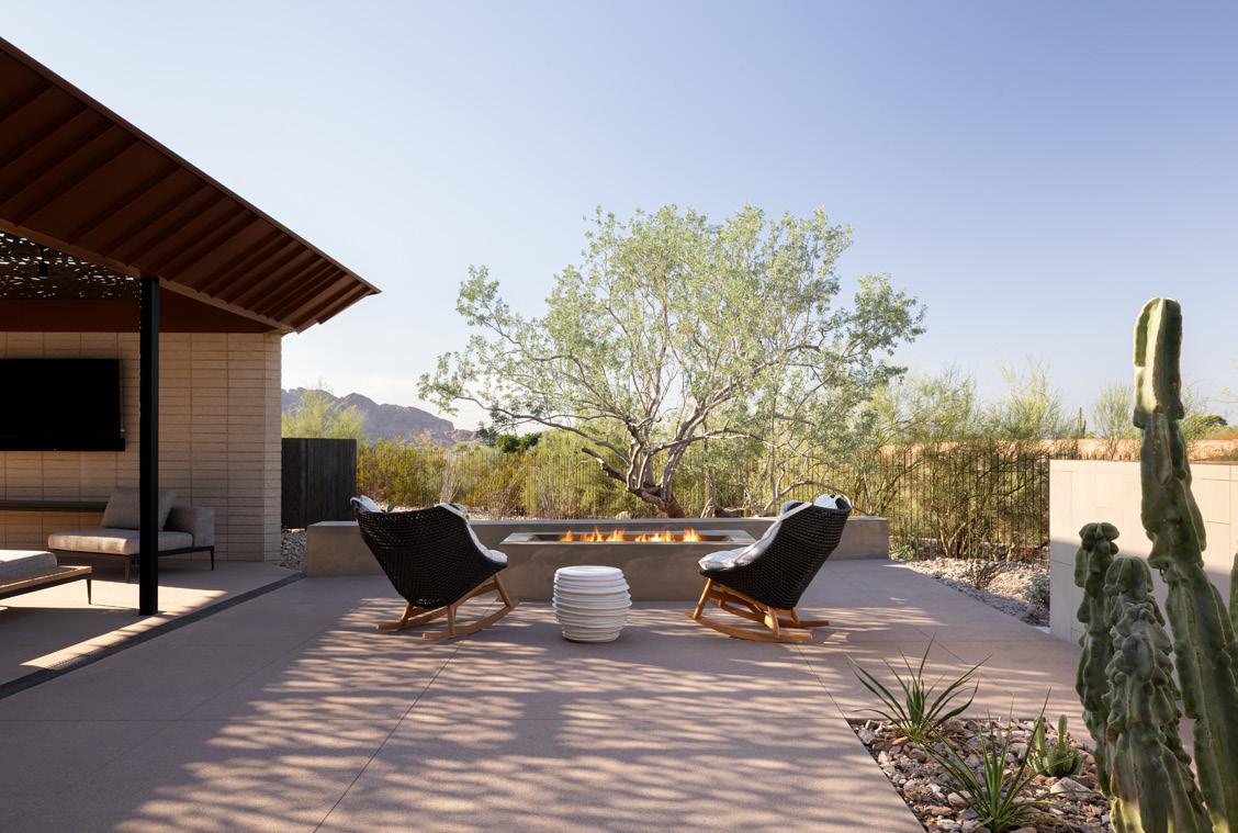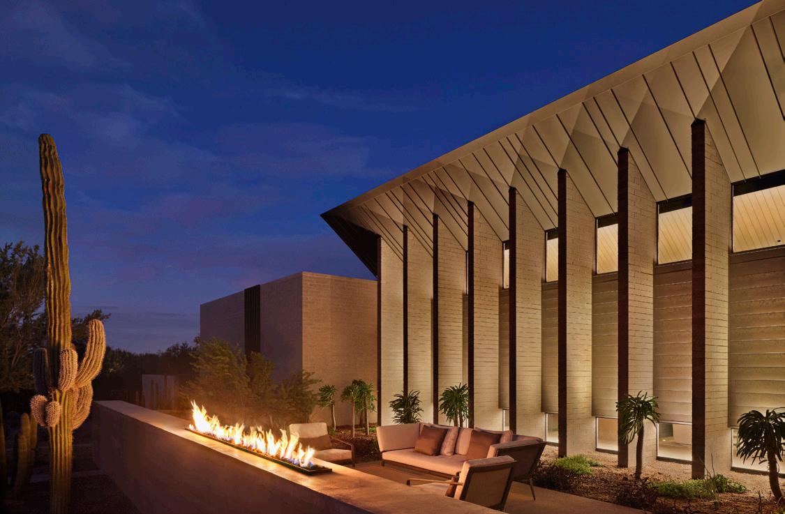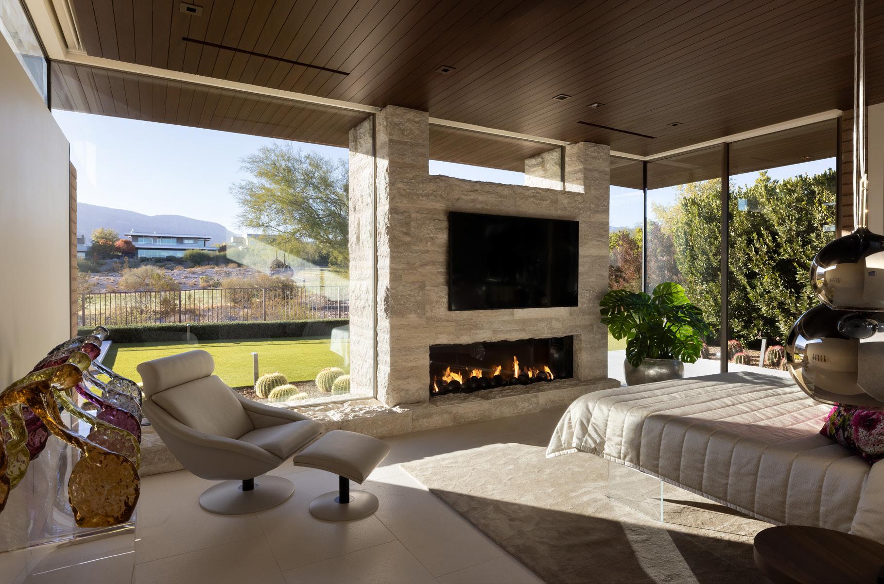 As evening falls, the front terrace becomes a peaceful vantage point to watch the sun set behind the mountains. The space is made cozy with a linear fire feature, providing warmth on cooler nights while enhancing the atmosphere. The lighting accentuates the dynamic forms and ribbed design of the architecture, casting shadows and highlighting the sculptural qualities of the residence. From this quiet perch, the connection to the landscape and the home’s thoughtful design becomes fully realized, embodying the essence of the Desert Fairways Residence: a place where design and nature coexist in harmony, elevating daily life.