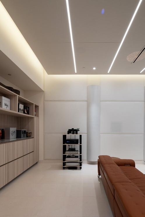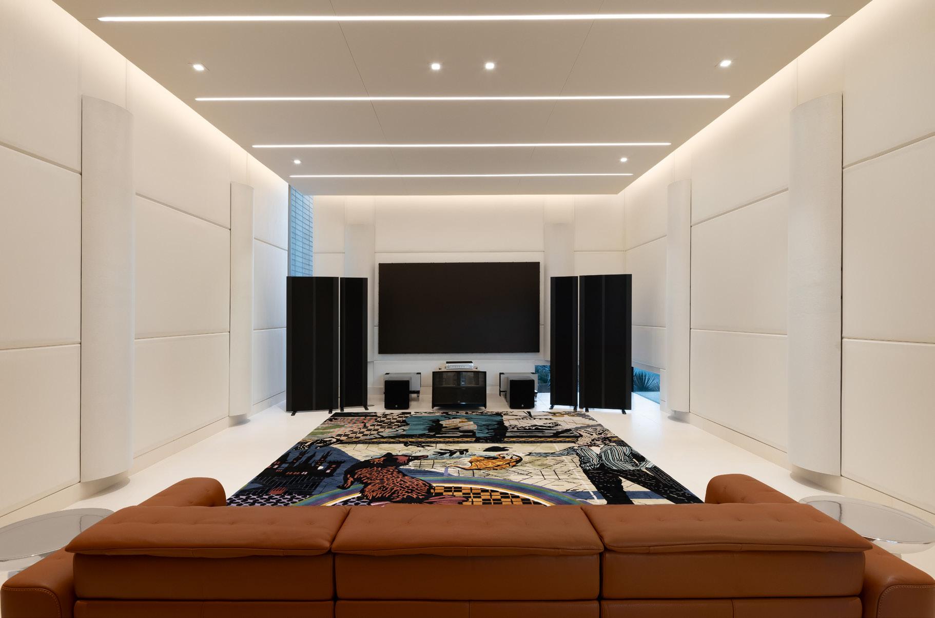 The music room was intentionally designed to enhance the listening experience of the homeowner’s extensive record collection. With dimensions tailored for optimal acoustics, the room offers dedicated storage for the records, while the dropped ceiling integrates lighting that echoes the keys of a piano, subtly underscoring the room’s musical purpose.