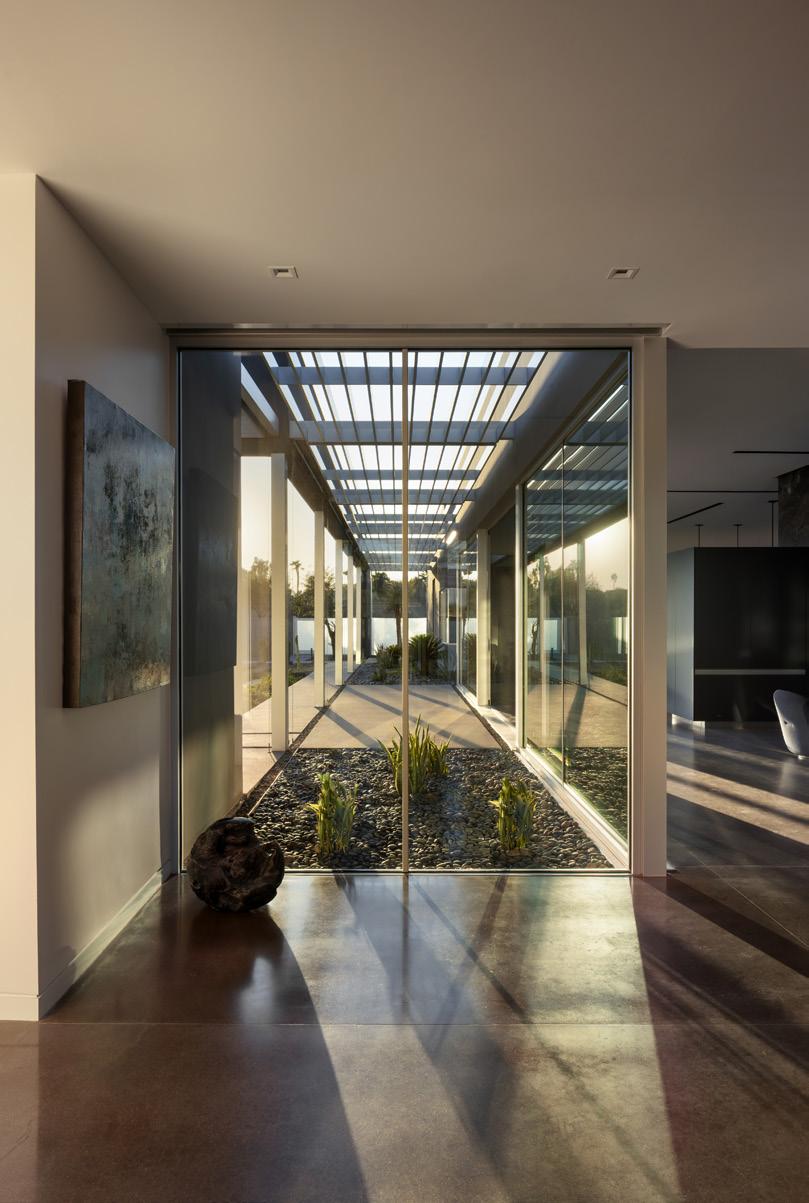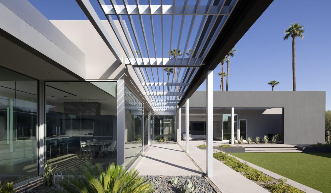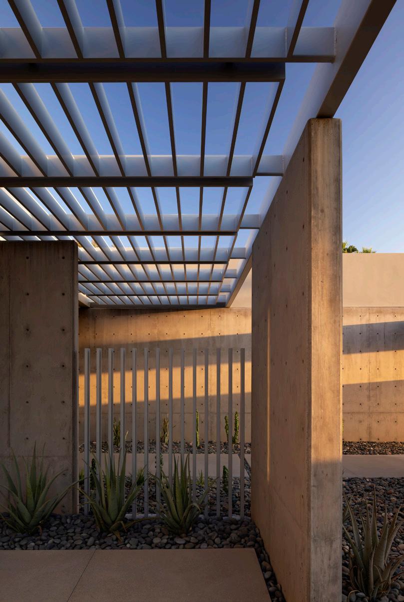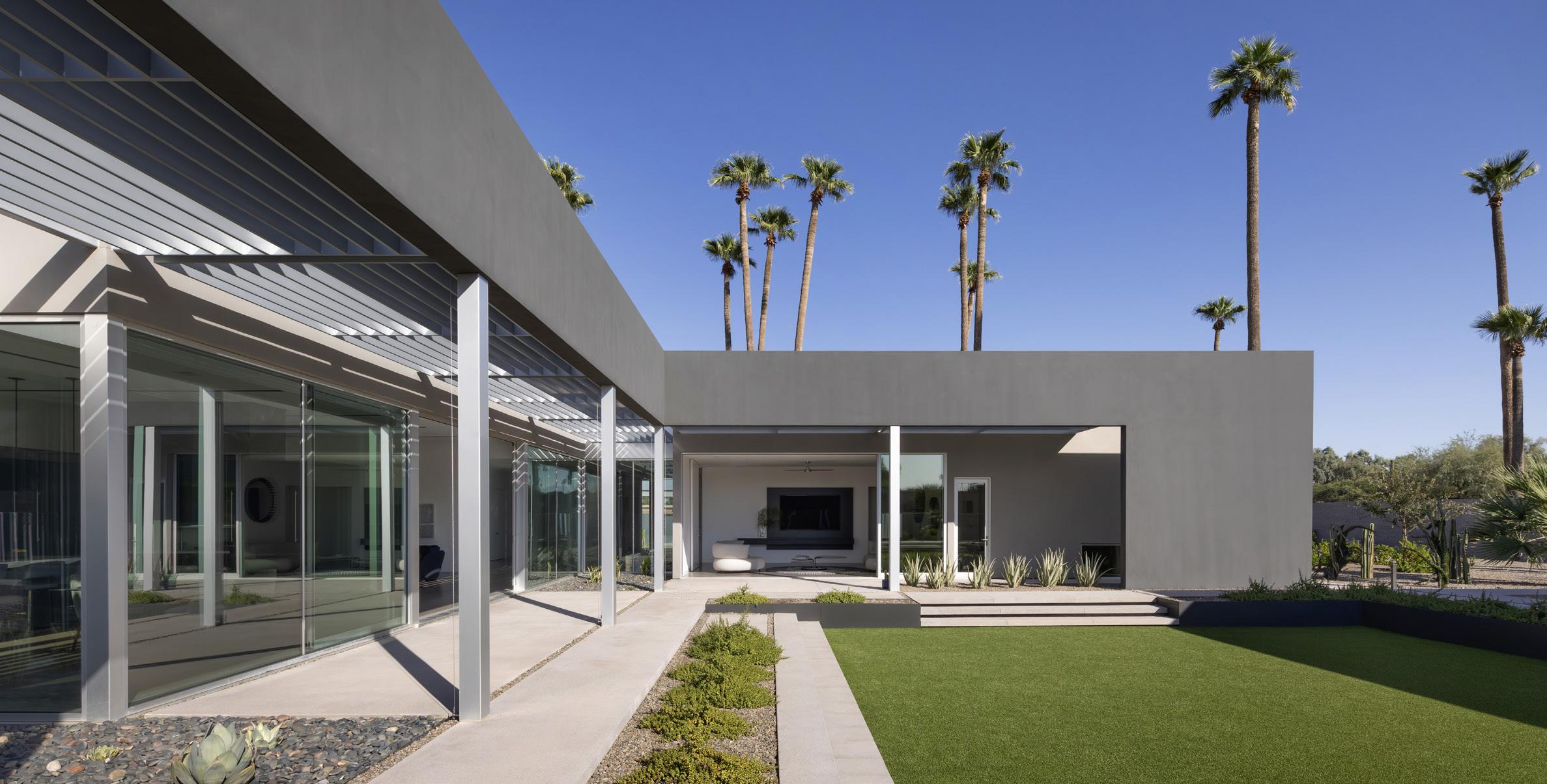 To control and soften the harsh desert sun, a continuous trellis and automated exterior sun shades moderates the flow of light into the home, casting filtered shadows that evoke a feeling of serenity. In the central courtyard, the interplay of concrete and stucco surfaces creates a refined, clean aesthetic, which is softened by the surrounding desert foliage. Glazed bridge-like passages transition between the private and social “islands” of the home, where the sea of lush desert flora washes up to their shore, connecting inhabitant to nature as they move throughout the home.