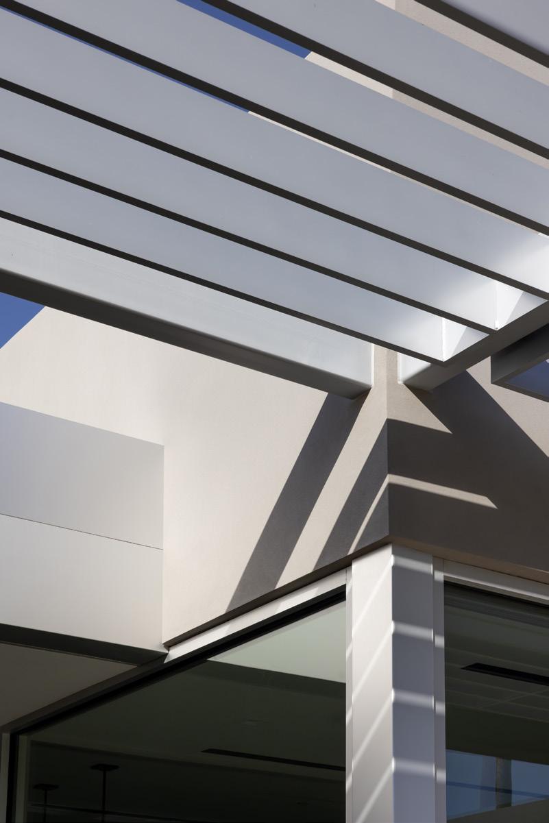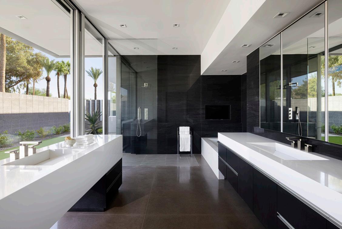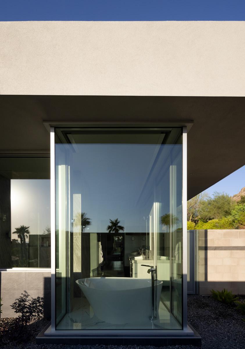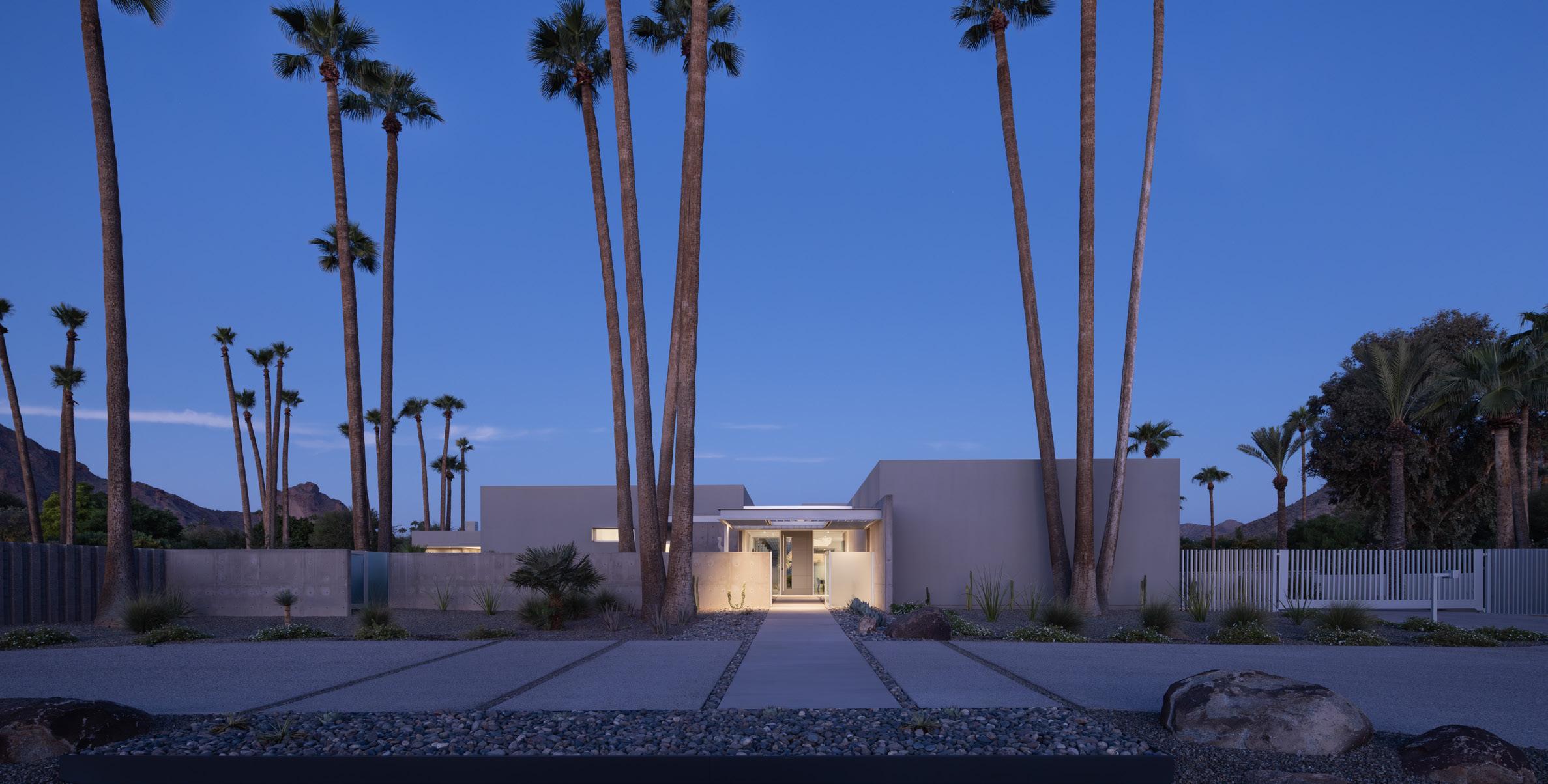 To control and soften the harsh desert sun, a continuous trellis and automated exterior sun shades moderates the flow of light into the home, casting filtered shadows that evoke a feeling of serenity. In the central courtyard, the interplay of concrete and stucco surfaces creates a refined, clean aesthetic, which is softened by the surrounding desert foliage. Glazed bridge-like passages transition between the private and social “islands” of the home, where the sea of lush desert flora washes up to their shore, connecting inhabitant to nature as they move throughout the home.