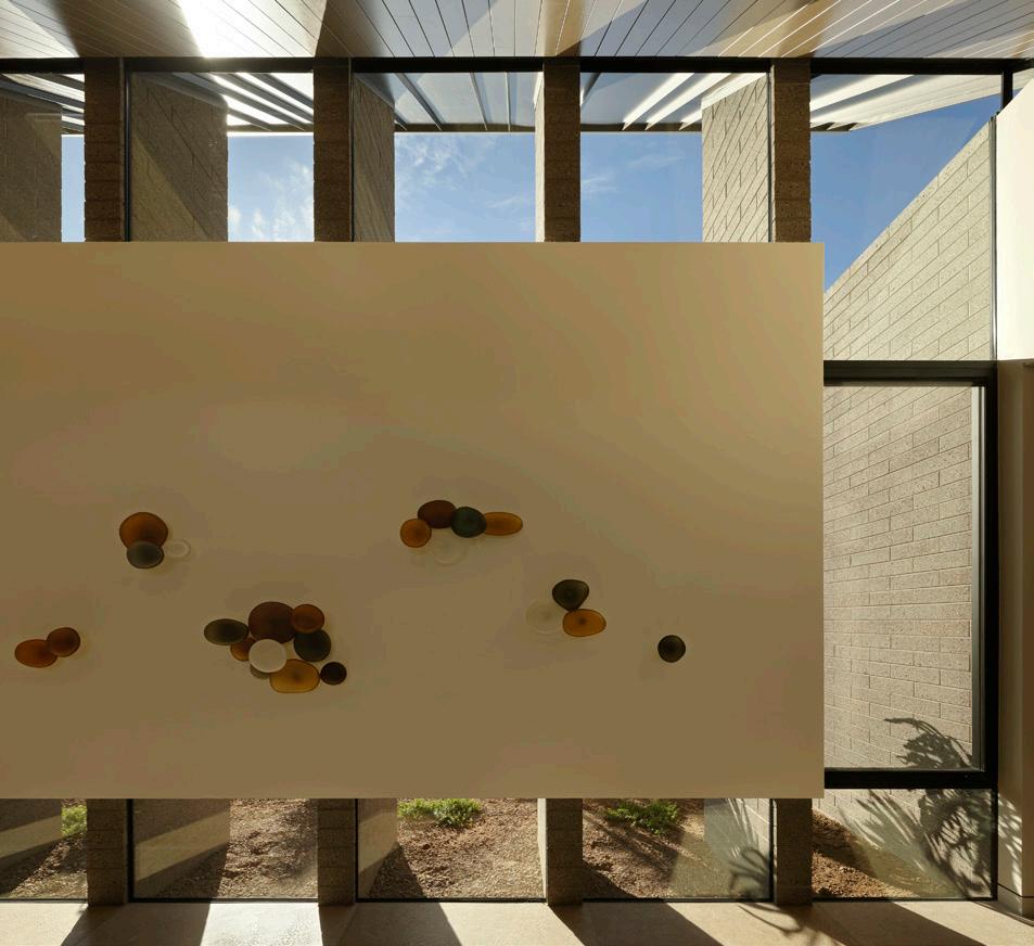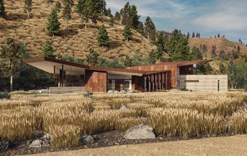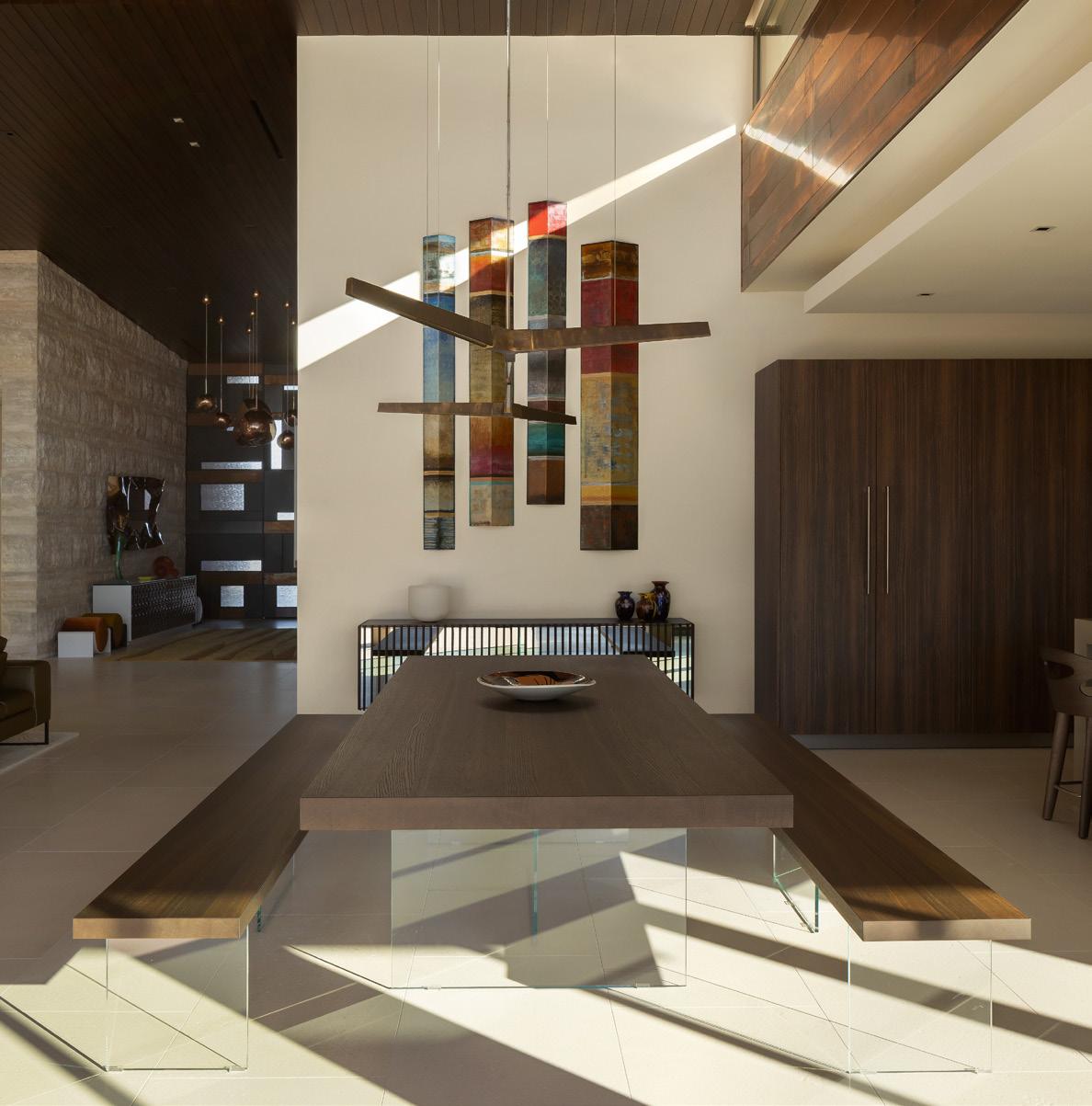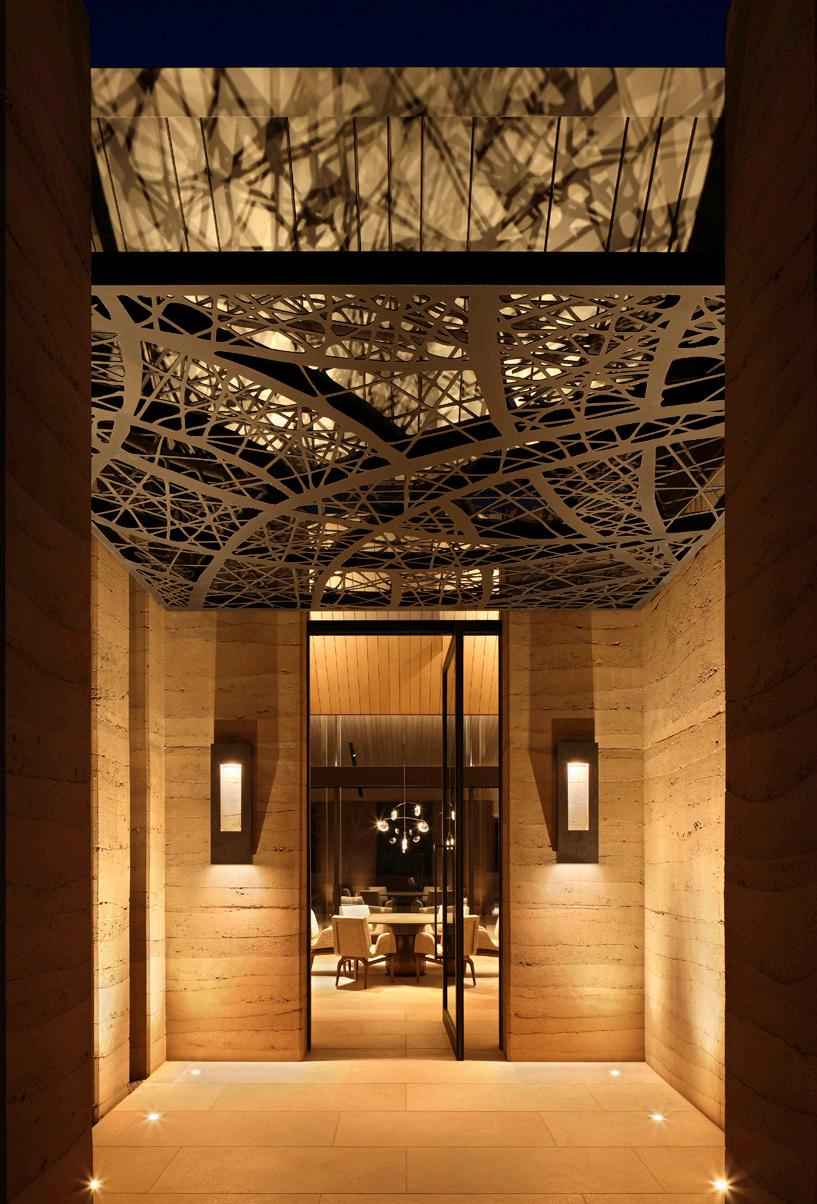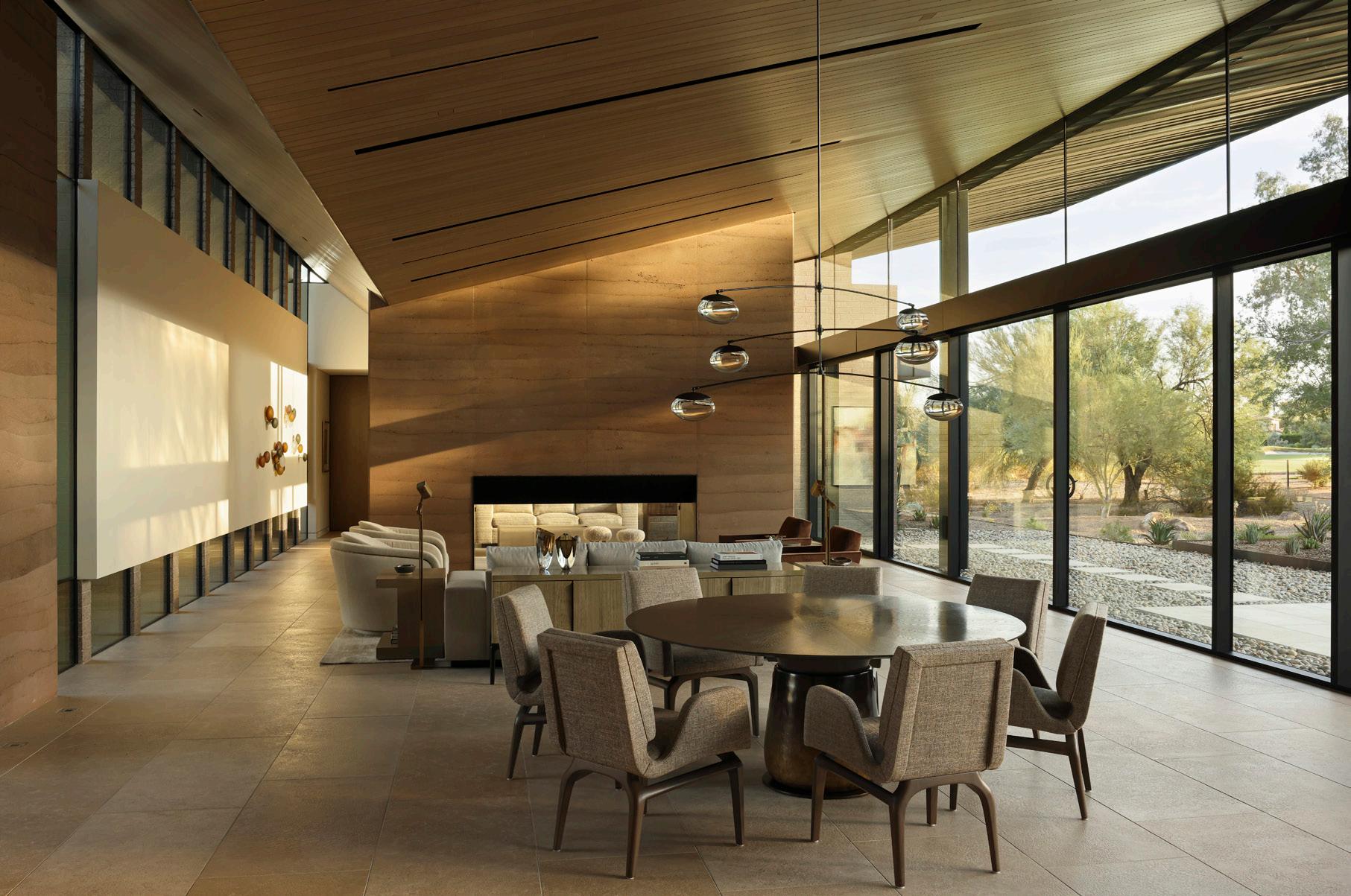 Inside, the exterior ribbed metal fascia transitions to the visual warmth of a wood ceiling, whose lines draw one’s eye back out to the exterior environment. The refined and sophisticated palette of earth-derived materials continues inside with natural stone floors, rammed earth walls, and ground face masonry surfaces extending into select rooms.