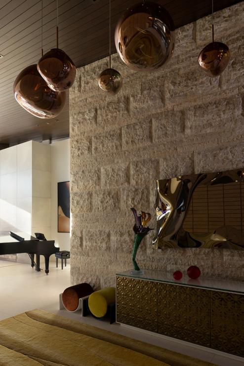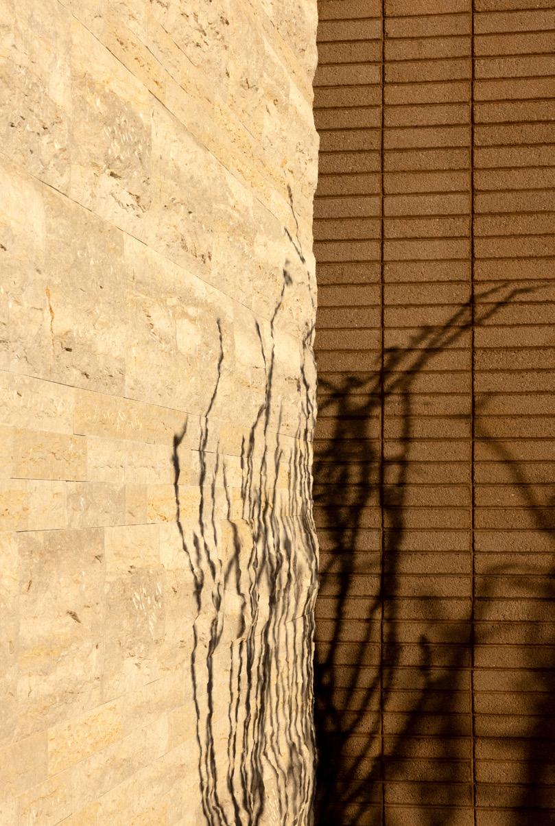 Approaching the entrance, the visitor is greeted by a stone-clad gem-like structure housing the centerpiece of the home – the music room. The materials – split-face limestone, shot-blast masonry, weathered copper, and a medley of metal and glass – create a tactile experience, complemented by the interplay of light and shadows cast on their surfaces from the surrounding trees and cacti.