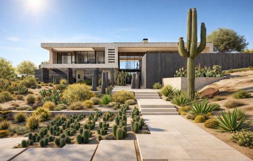 The Desert Geode Residence is nestled within the Arizona desert, its form slowly revealing itself through a striking silhouette of folding metal planes and rugged, blasted-face masonry. This contrast of materials evokes the layered beauty of a geode, capturing the sunlight while offering a sense of protection and intimacy. The weathered metal surface acts as a strong outer shell, not only providing privacy but also sheltering the luminous interior. As one approaches, the angular roofline unfolds, gently guiding the visitor toward the front entry and creating a unique sense of procession.