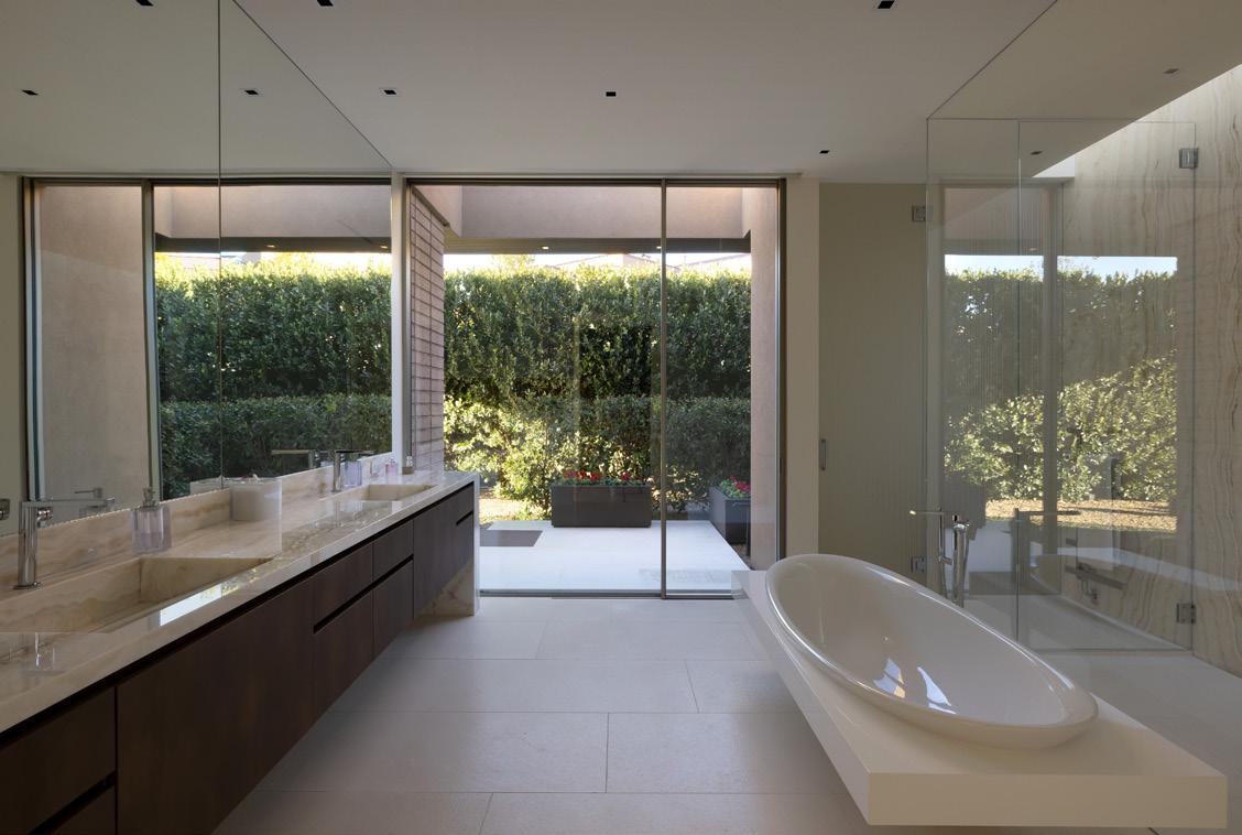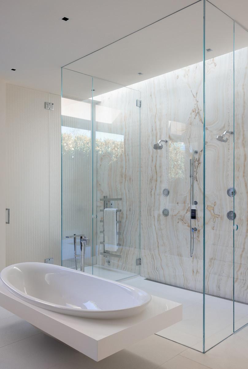 The primary suite is defined by light and openness, with a skylight gently illuminating the stone-clad shower wall. The soft, diffused light transforms the stone’s texture, while beyond, a private garden offers a serene outdoor space, fostering a quiet retreat within the home.