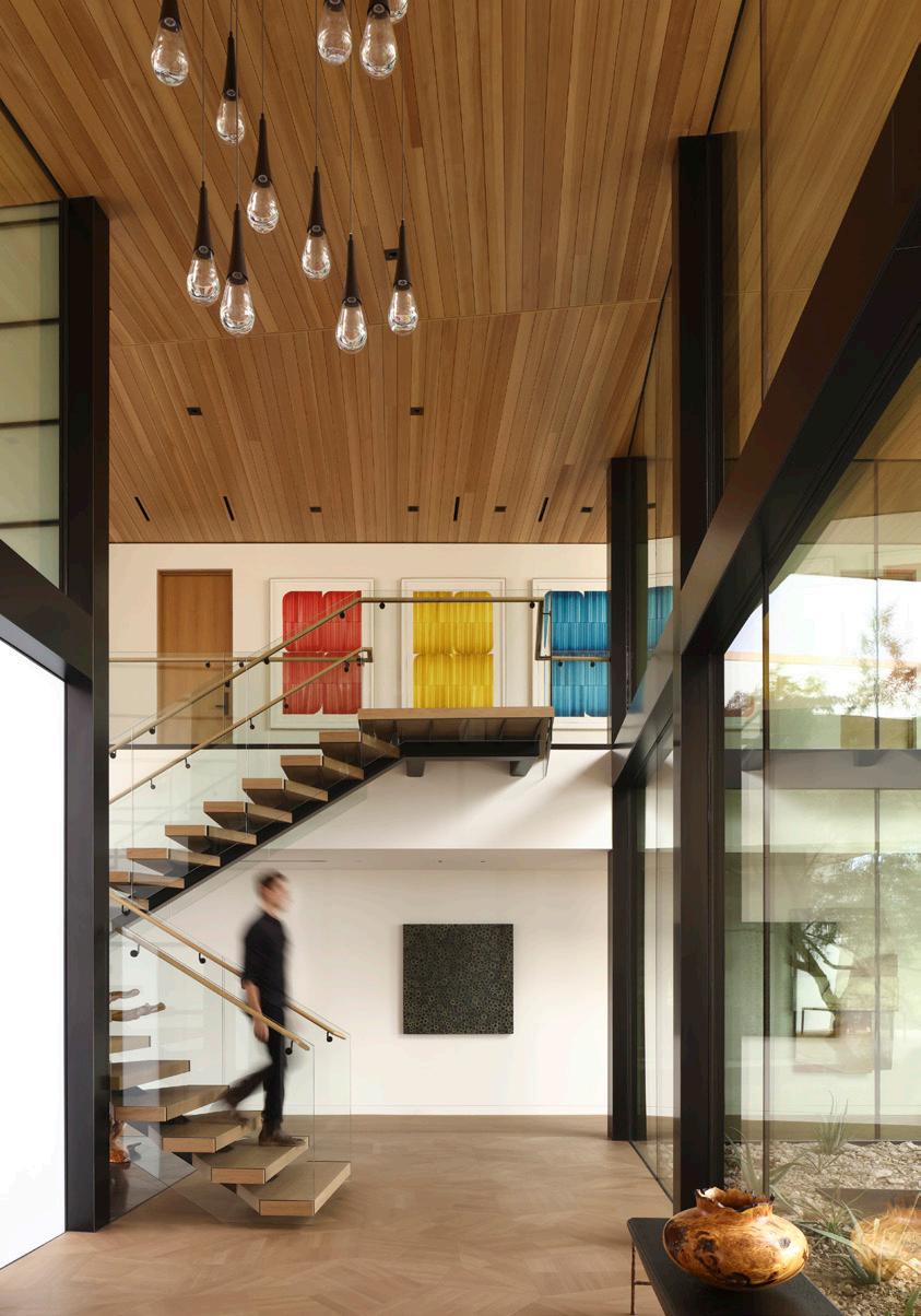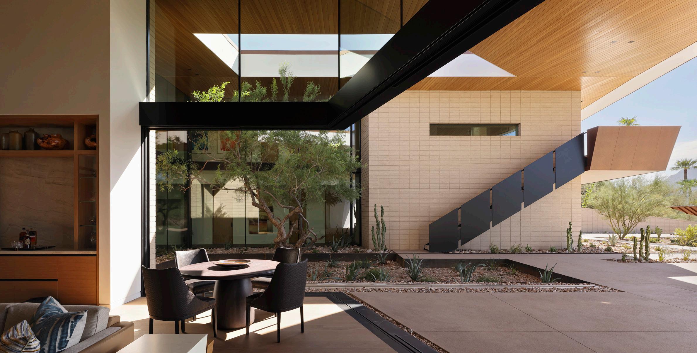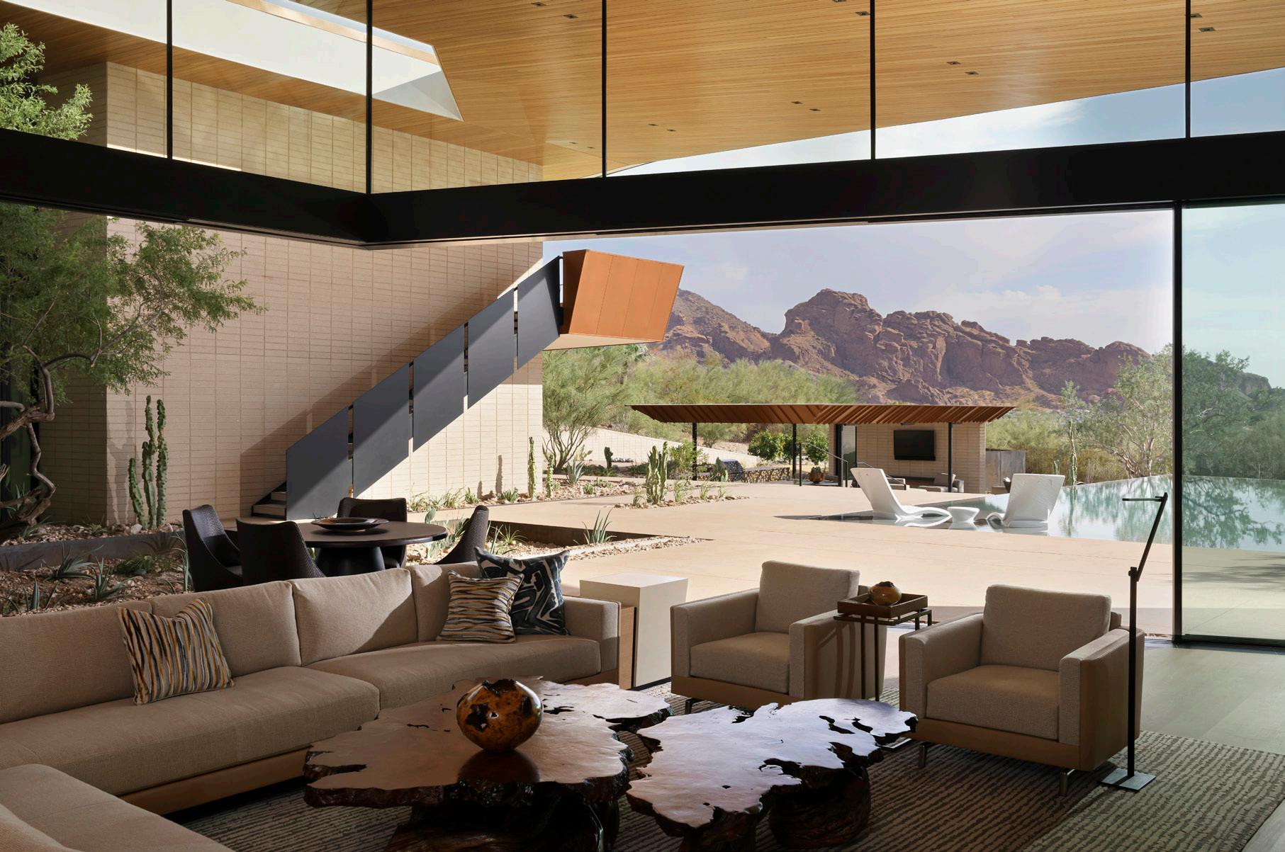 Stepping into the foyer, a lush courtyard immediately unfolds, offering a contained oasis within the expansive desert. At the heart of the design is an oculus, a central feature that draws the brilliant Arizona sky into the space, filling the interior with natural light and establishing an unbroken connection between the home and its surroundings. A floating stair, with its angular wooden treads mirroring the geometry of the architecture, inviting one to ascend into the home’s upper floor.