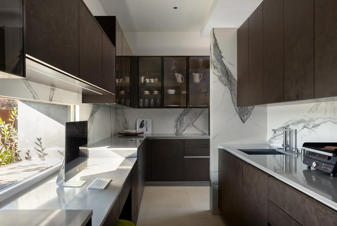 The kitchen features a bespoke Eggersmann design, with a book matched stone slab backdrop that contrasts beautifully with the walnut cabinetry and high-end appliances. Behind this wall, the butler’s pantry and a tucked-away workstation are discretely concealed, with a carefully framed view of the garden from the desk, adding a moment of calm and connection to the natural surroundings.