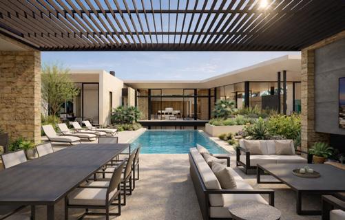 Pocketing multi-slide doors allow the interior to seamlessly open up to the exterior terrace, creating a space that invites relaxation, social gatherings, and moments of quiet reflection. The expansive views, complemented by the sparkling pool, are framed by a soaring metal-clad roof that provides much-needed shade from the harsh desert sun. Native desert vegetation along the perimeter of the terrace softly transitions the built environment into the natural landscape of the site below.