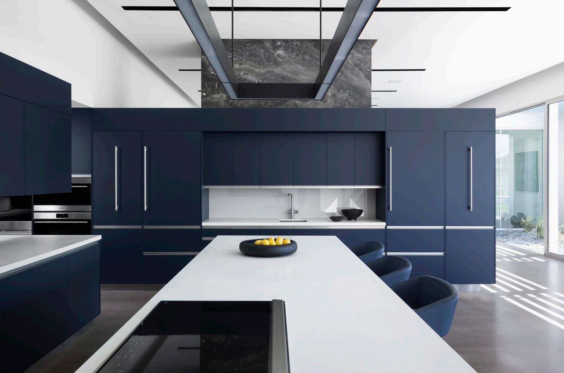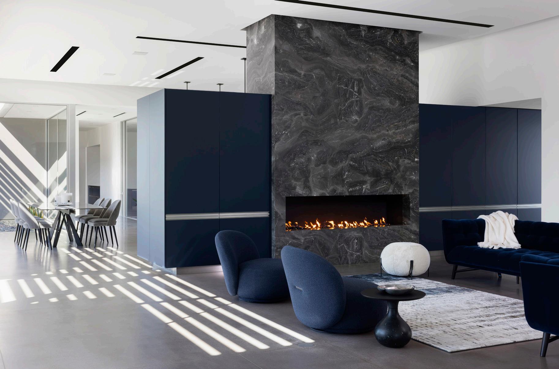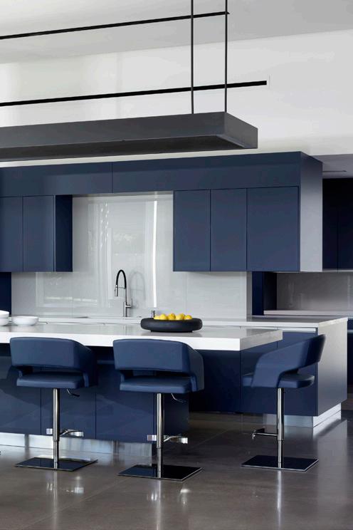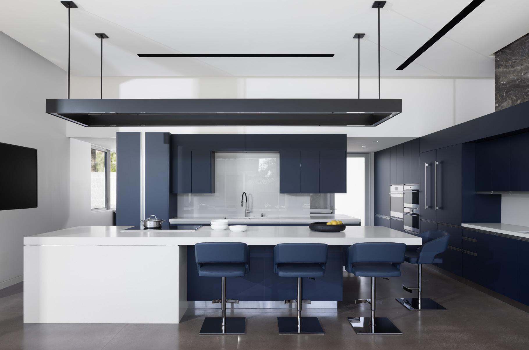 In the kitchen, a simple yet refined palette of white quartz countertops and midnight blue cabinetry creates a balanced space, punctuated by the gleam of silver hardware, appliances, and fixtures. The design fosters a warm, welcoming atmosphere, perfect for gathering with family and friends, where the quiet beauty of the materials enhances the everyday experience of cooking and connection.