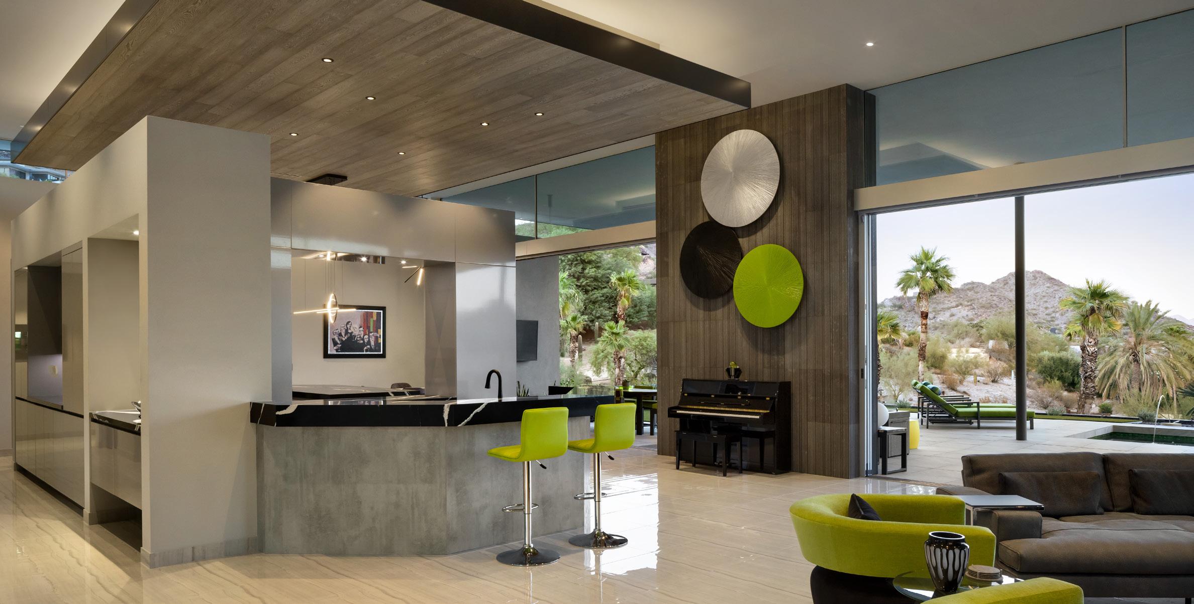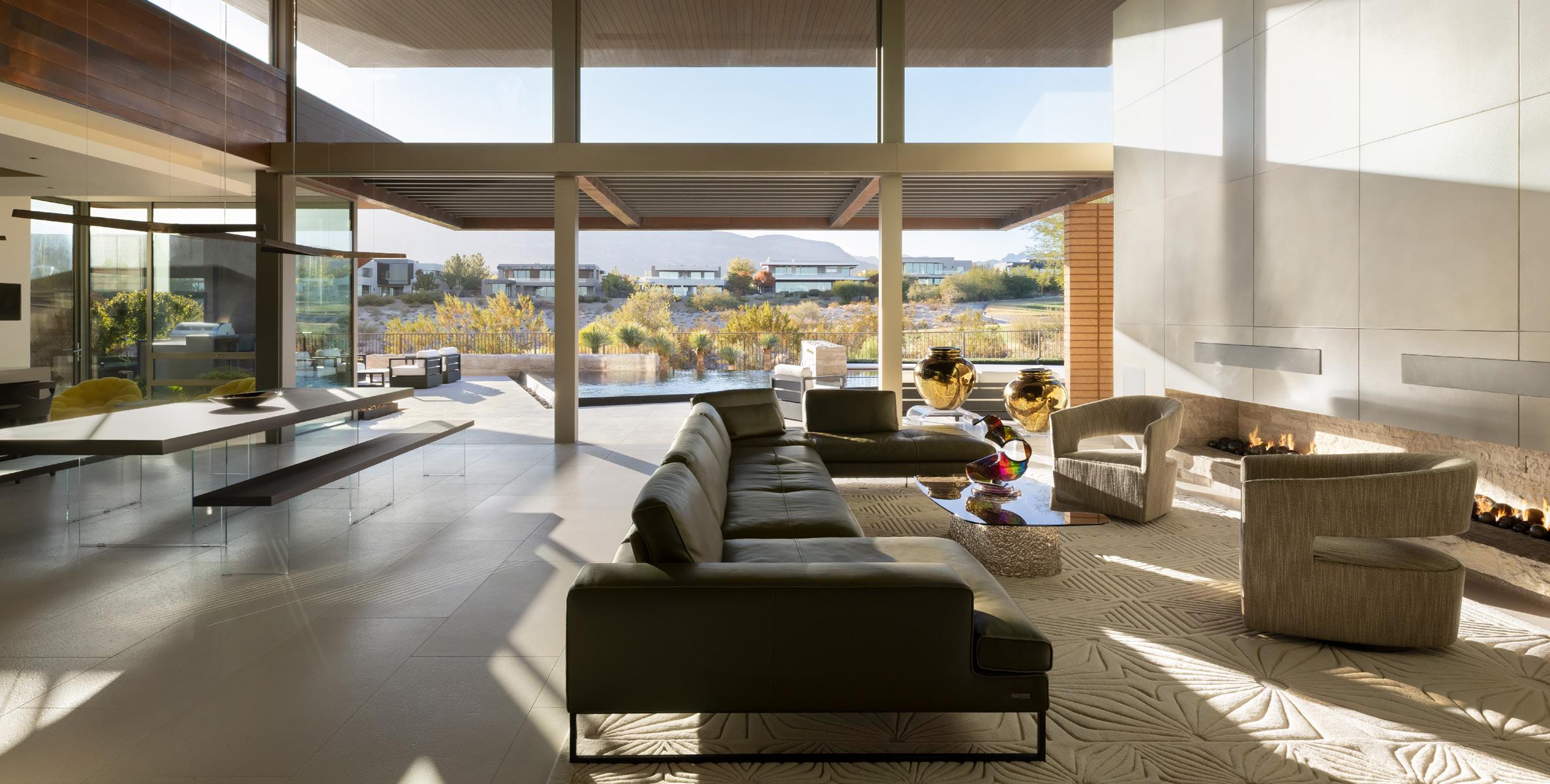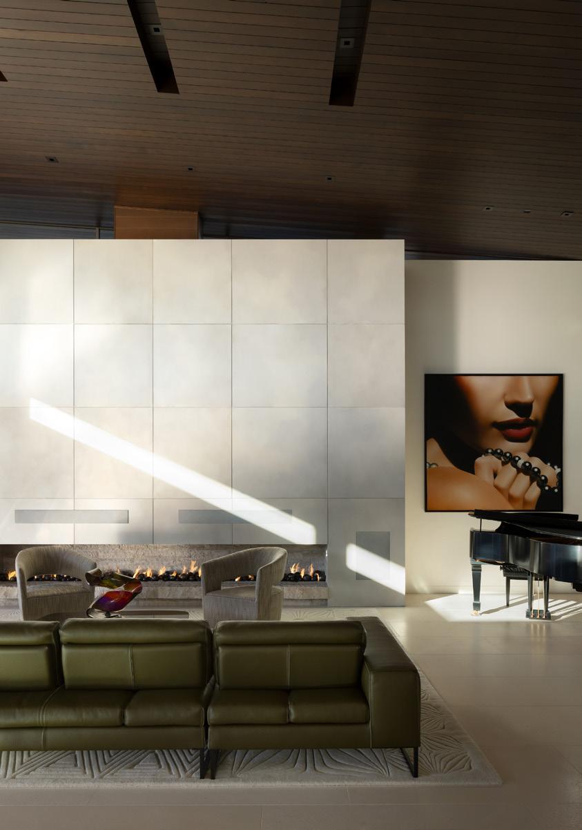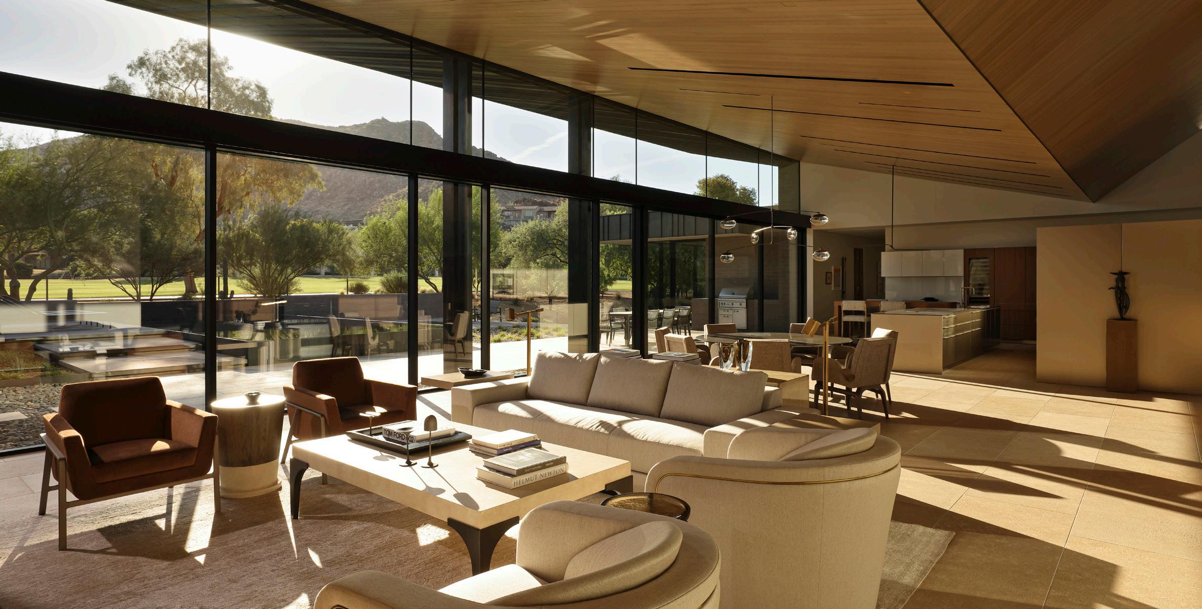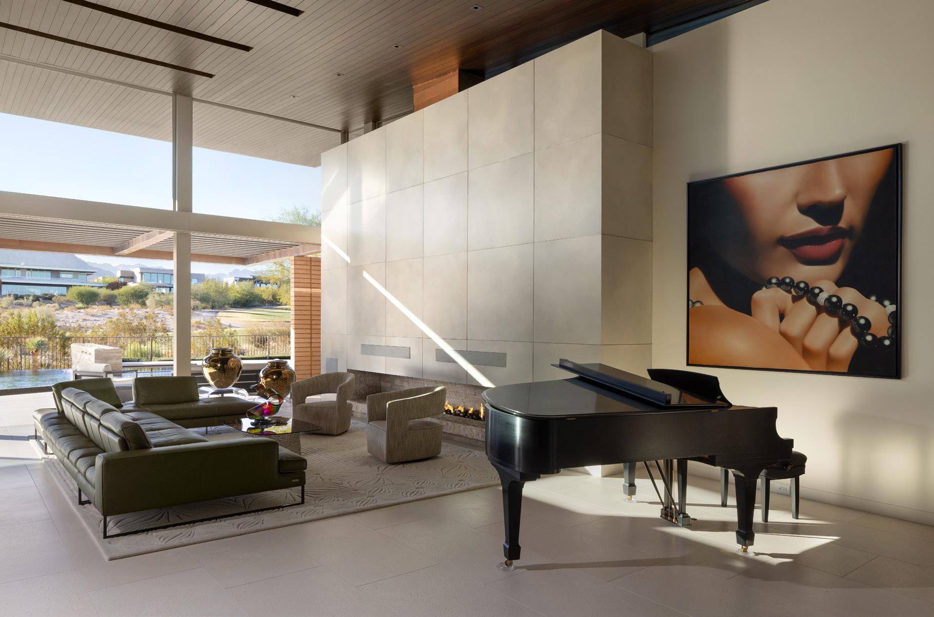 Beyond the foyer, the great room opens up with an abundance of natural light, thanks to the floating ceiling that rises towards the view flanked by clerestory windows. A panelized fireplace, with its movable panels, cleverly conceals the television while offering a striking backdrop to the grand piano. A pocketing floor-to-ceiling sliding glass wall dissolves the boundary between interior and exterior spaces, creating a seamless flow for gatherings and relaxation. An integrated trellis provides essential shade to this indoor-outdoor living area while framing expansive views of the adjacent fairway, surrounding mountains, and azure sky.