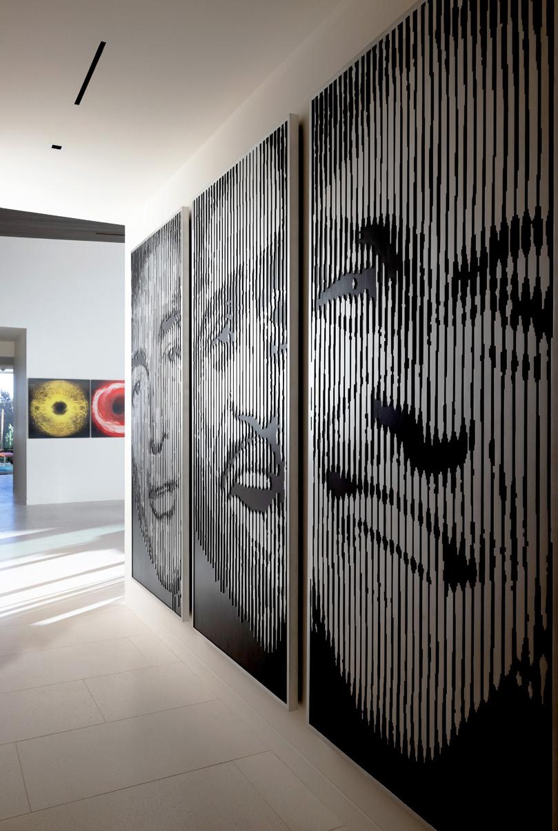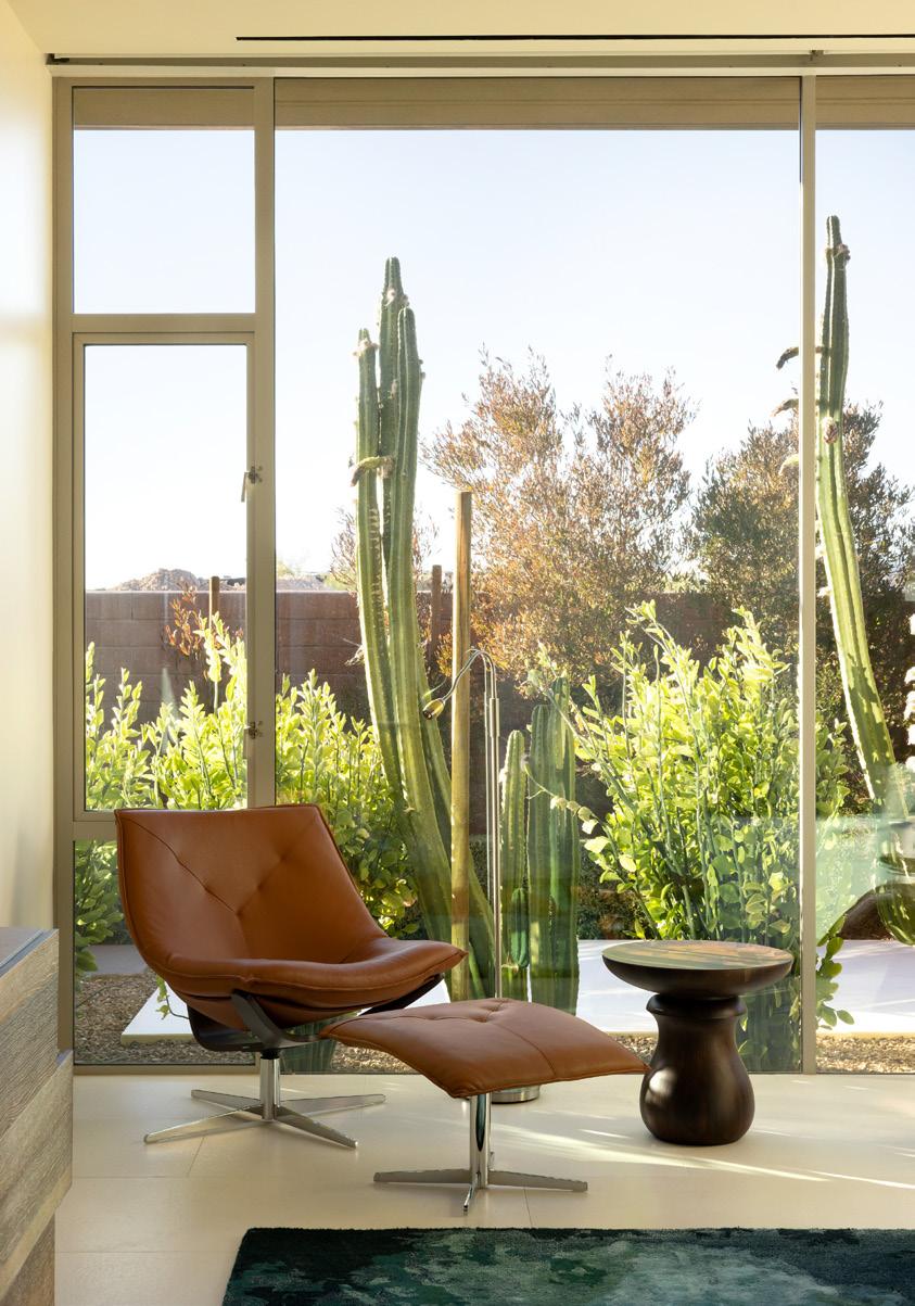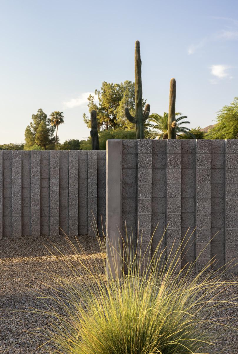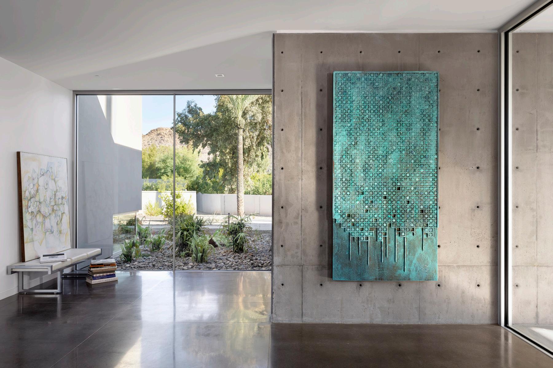 Serving as both a functional and aesthetic feature, the gallery wall defines the great room and establishes a visual connection between the living and media rooms. This sculptural element not only displays artwork, but also provides a vital buffer against the intense Arizona sun, creating a protective shield for the interior. As sunlight filters through, a carefully orchestrated rhythm of light and shadow unfolds, adding depth and nuance to the space while minimizing direct sunlight, enhancing the room’s comfort and ambiance.